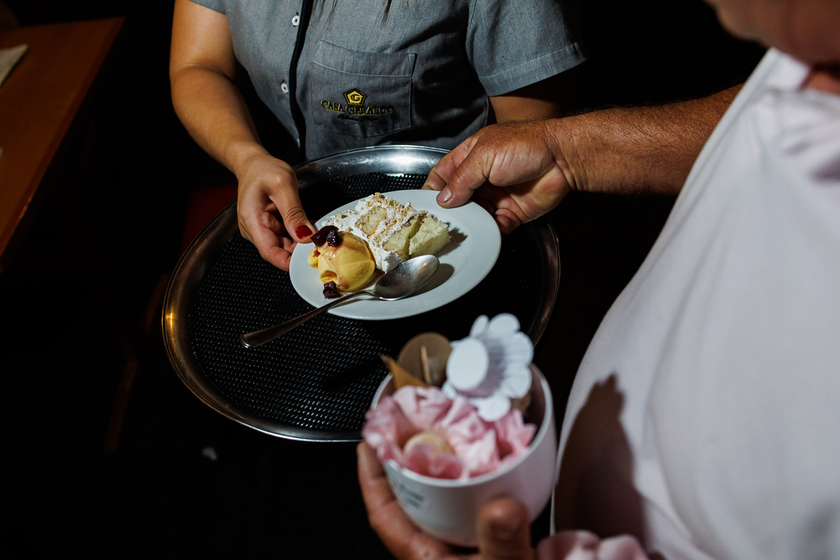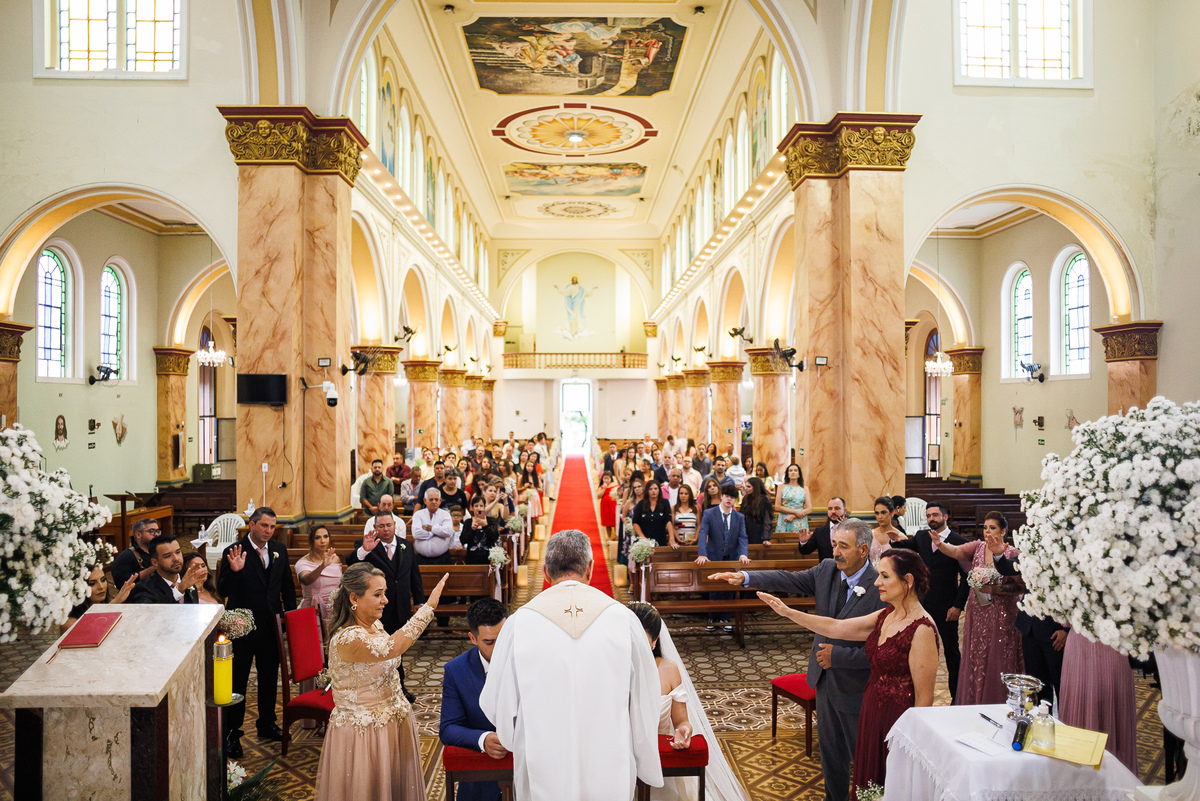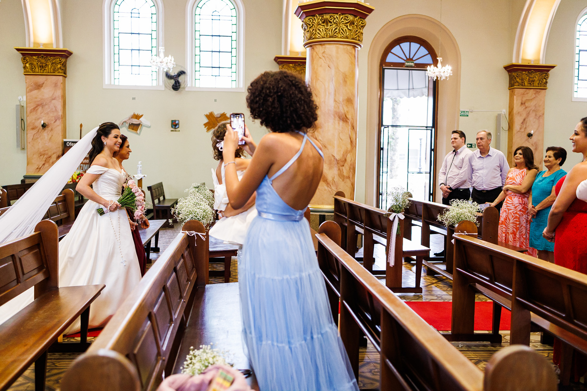 Após a cerimônia, todos se reuniram para capturar momentos preciosos em fotos. A igreja, com sua beleza imponente, serviu como pano de fundo perfeito para esses registros. Em seguida, dirigiram-se às parreiras da Casa Geraldo para mais fotos, aproveitando a deslumbrante luz do final da tarde. As imagens capturadas ali certamente seriam tesouros para o casal, lembrando-os da magia daquele dia.