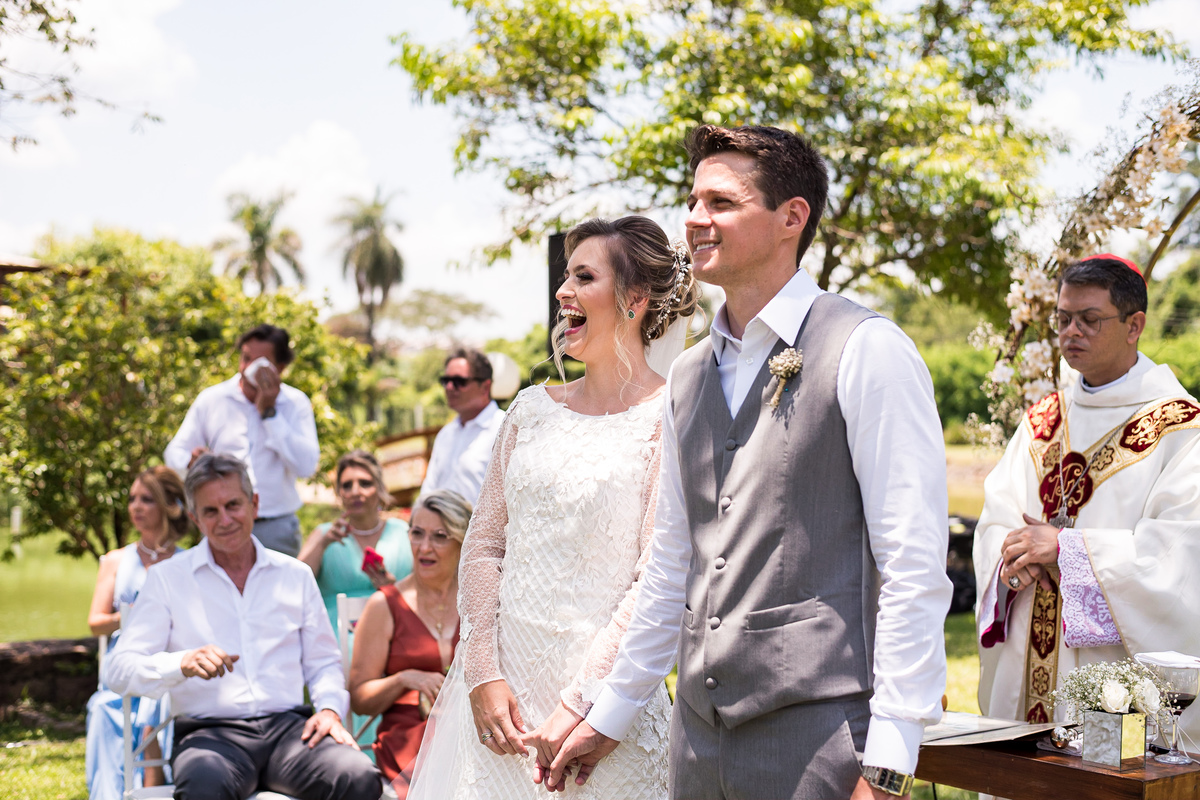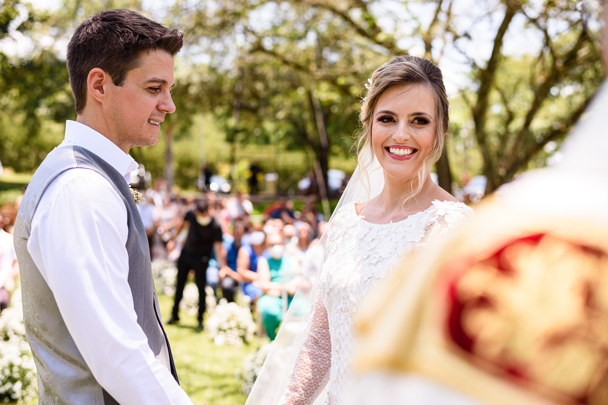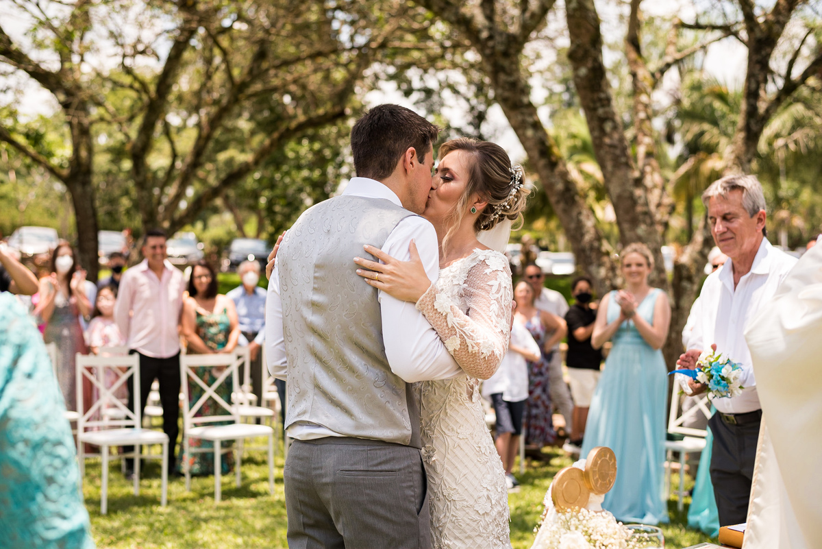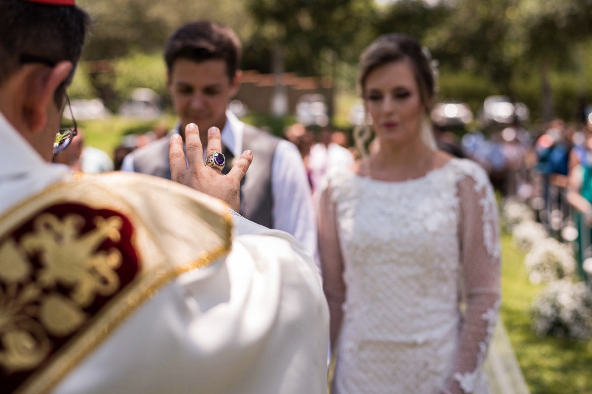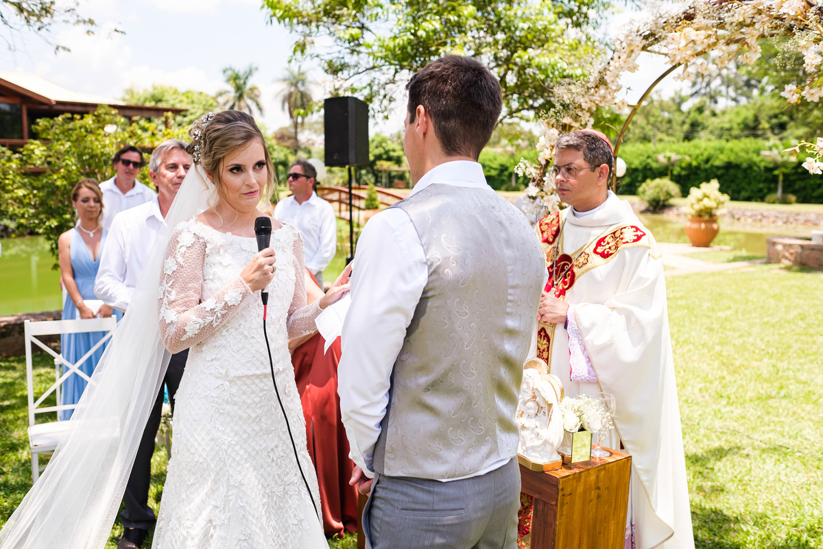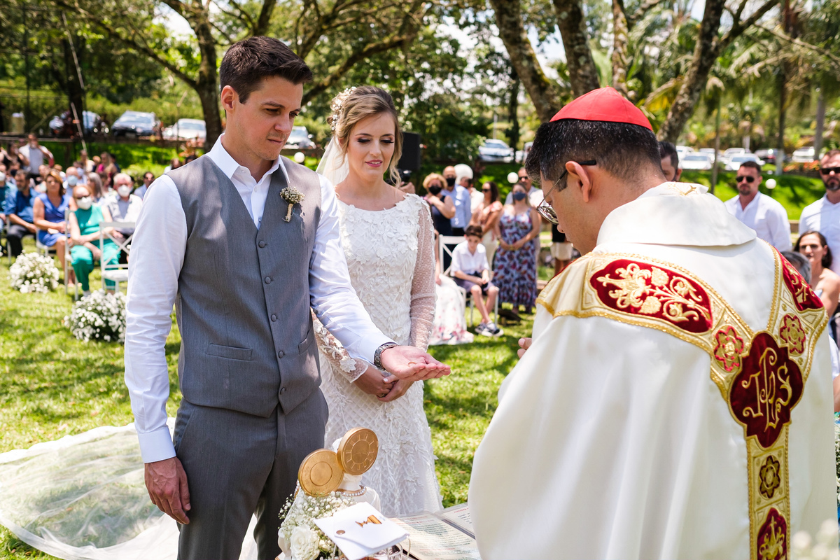 Os votos trocados entre o casal foram comoventes, repletos de promessas de amor, respeito e cumplicidade. E quando o Dom Pedro os declarou marido e mulher, um sentimento de alegria contagiante envolveu a todos os presentes.