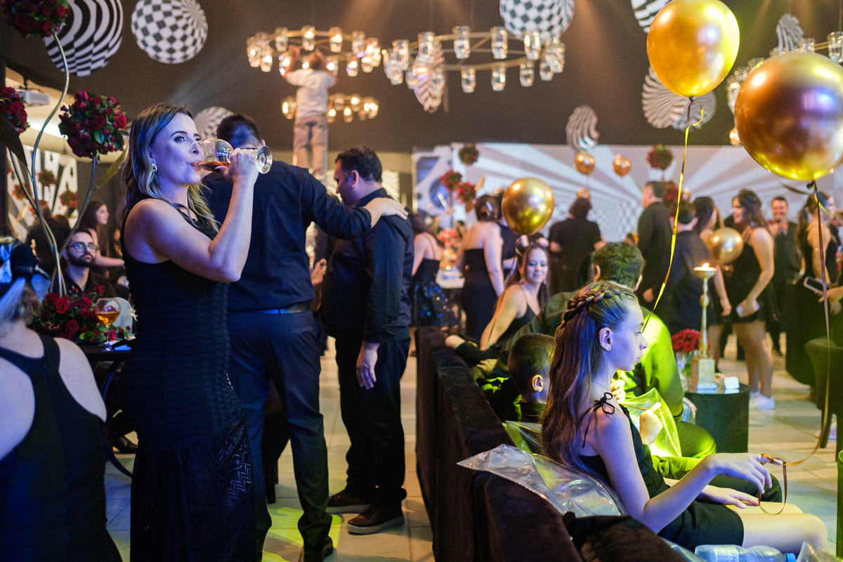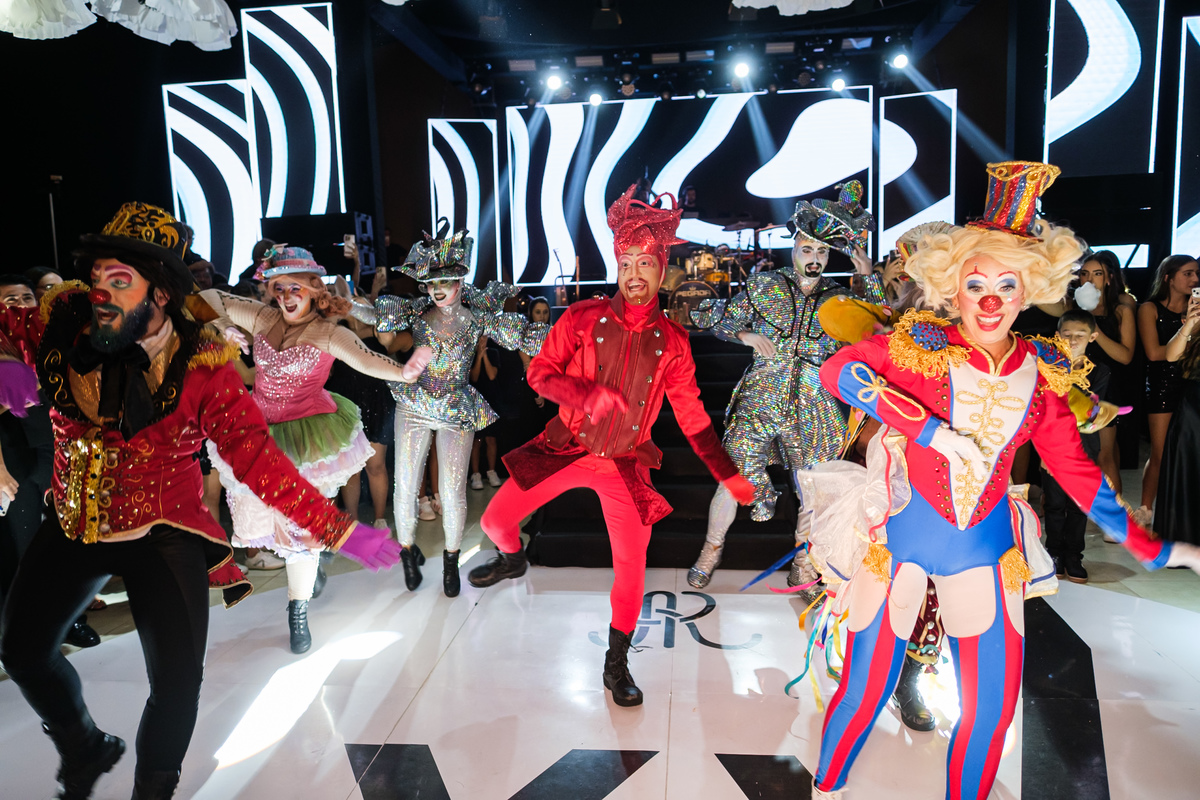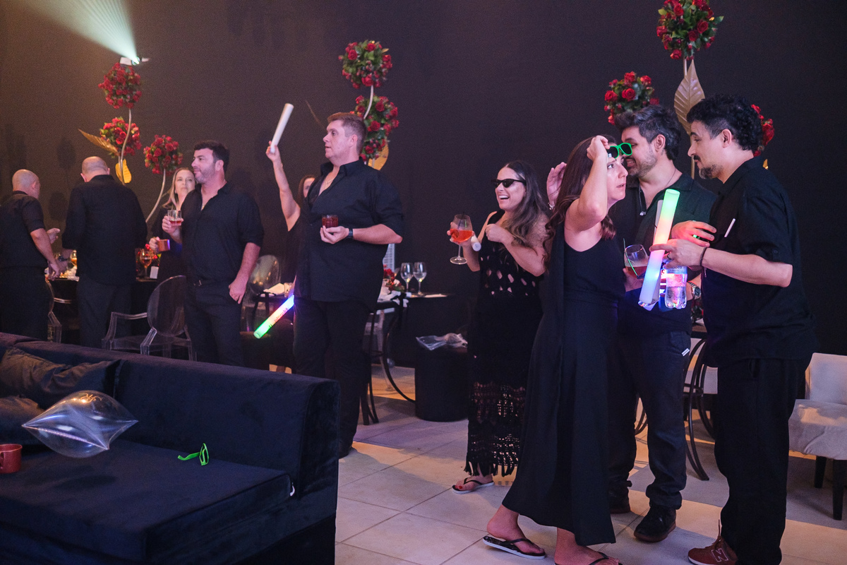 A festa ganhou vida com a presença de personagens que interagiam com os convidados, trazendo um toque lúdico e surpreendente à noite. O encantamento não parava por aí — um mágico circulava pelo salão, arrancando sorrisos e expressões de surpresa ao realizar truques impressionantes bem diante dos olhos de todos.
