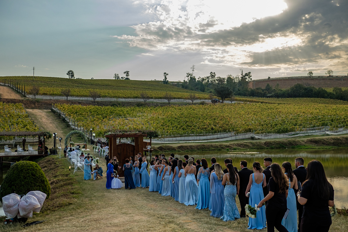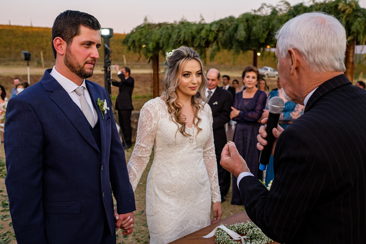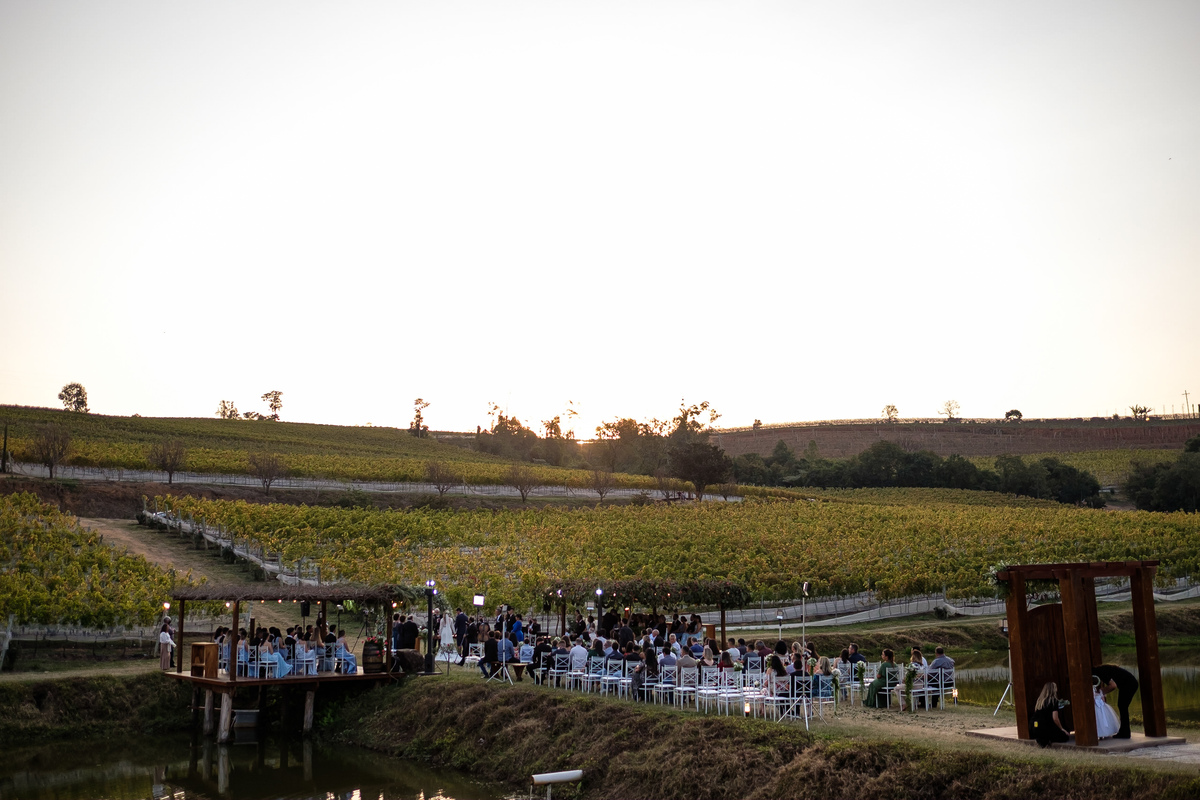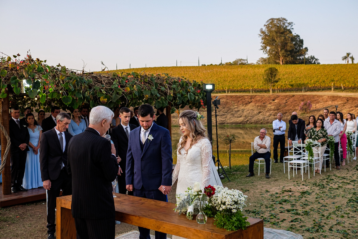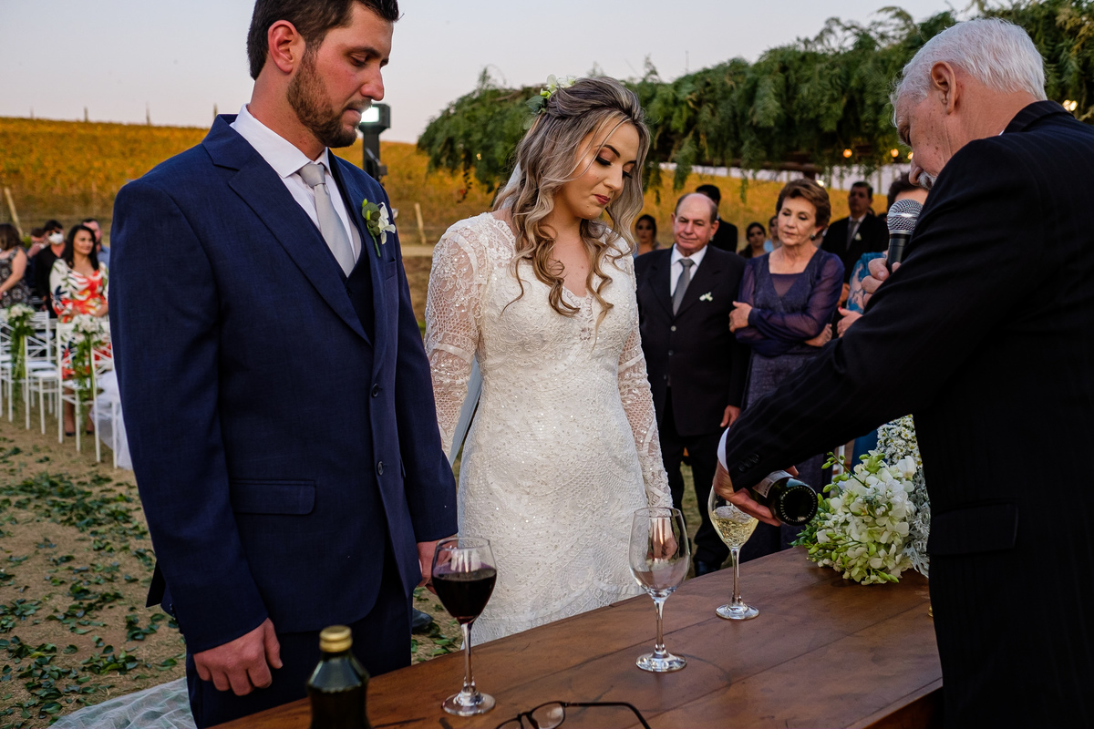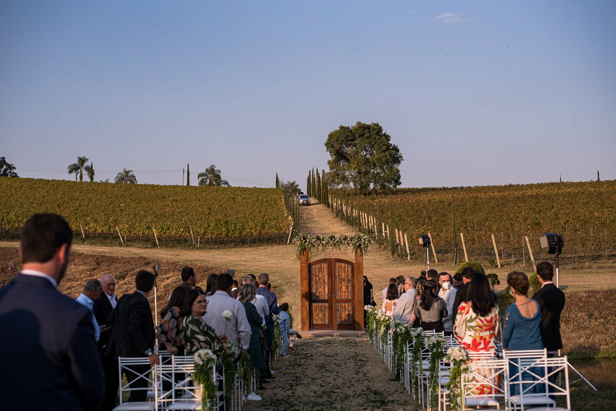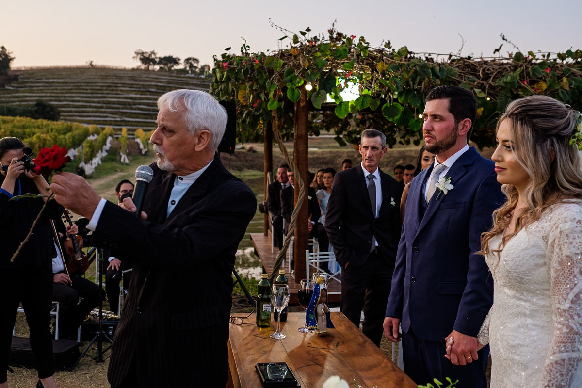 Na sexta-feira que antecede o casamento foi feita uma cerimonia, na verdade o casamento na igreja, e depois no sábado seria o casamento na Casa Geraldo no meio das parreiras, imagina, final de tarde, no meio das parreiras, quer cenário mais lindo que esse?