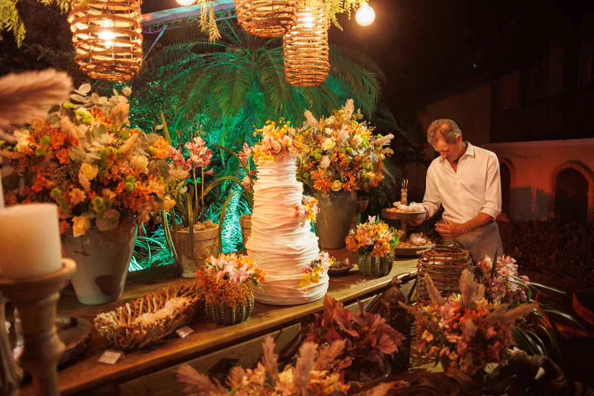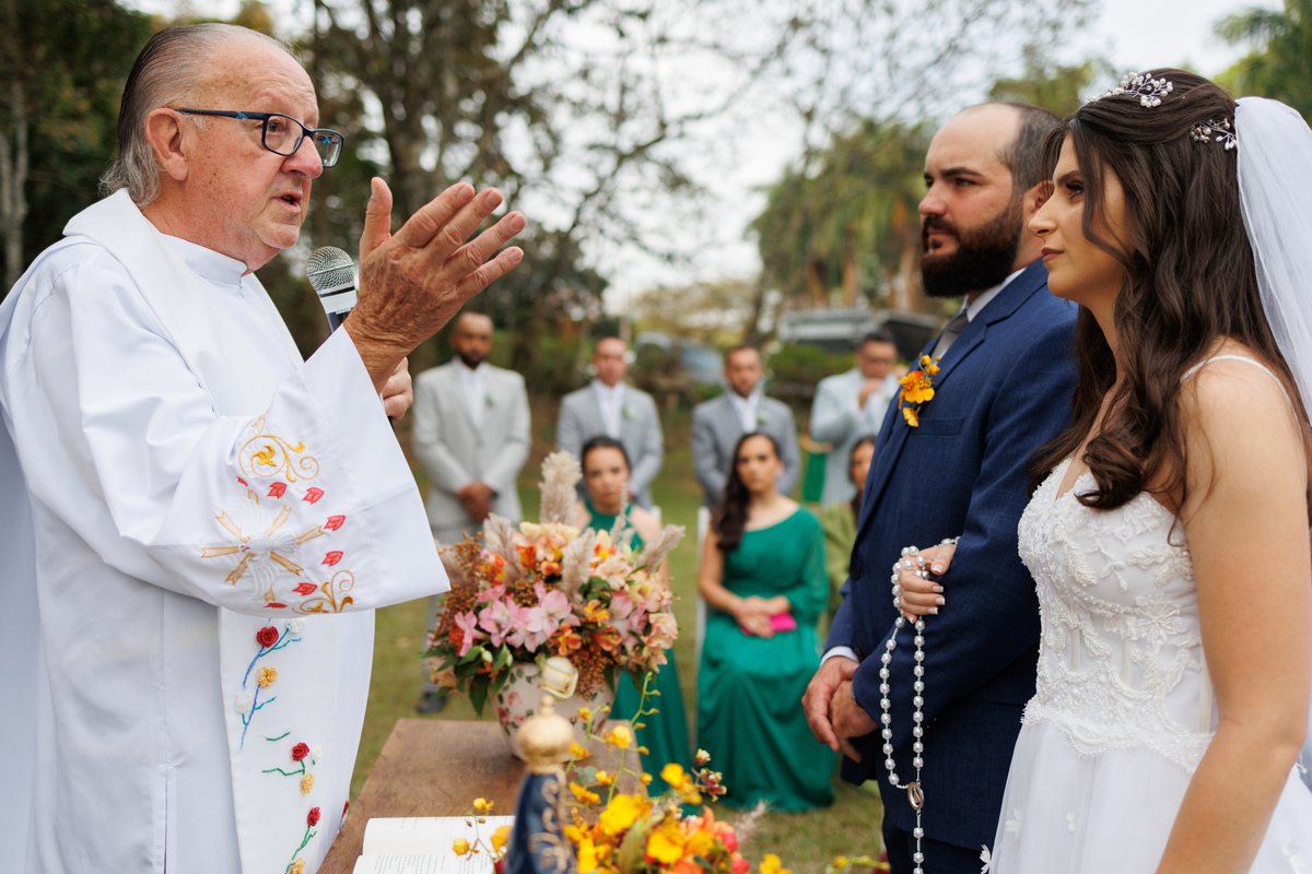 Aquele casal que o auto astral é incrível, a animação nem se fala, o dia deles não podia ser diferente, eles tiveram uma linda cerimônia no campo, com o fundo sendo uma capela linda, e do outro lado coqueiros, imagina se o cenário não simplesmente incrível?!