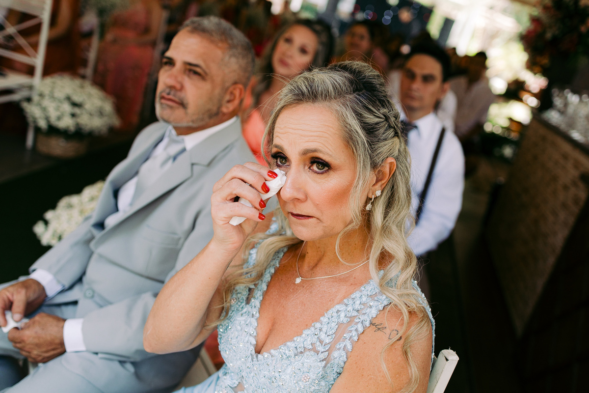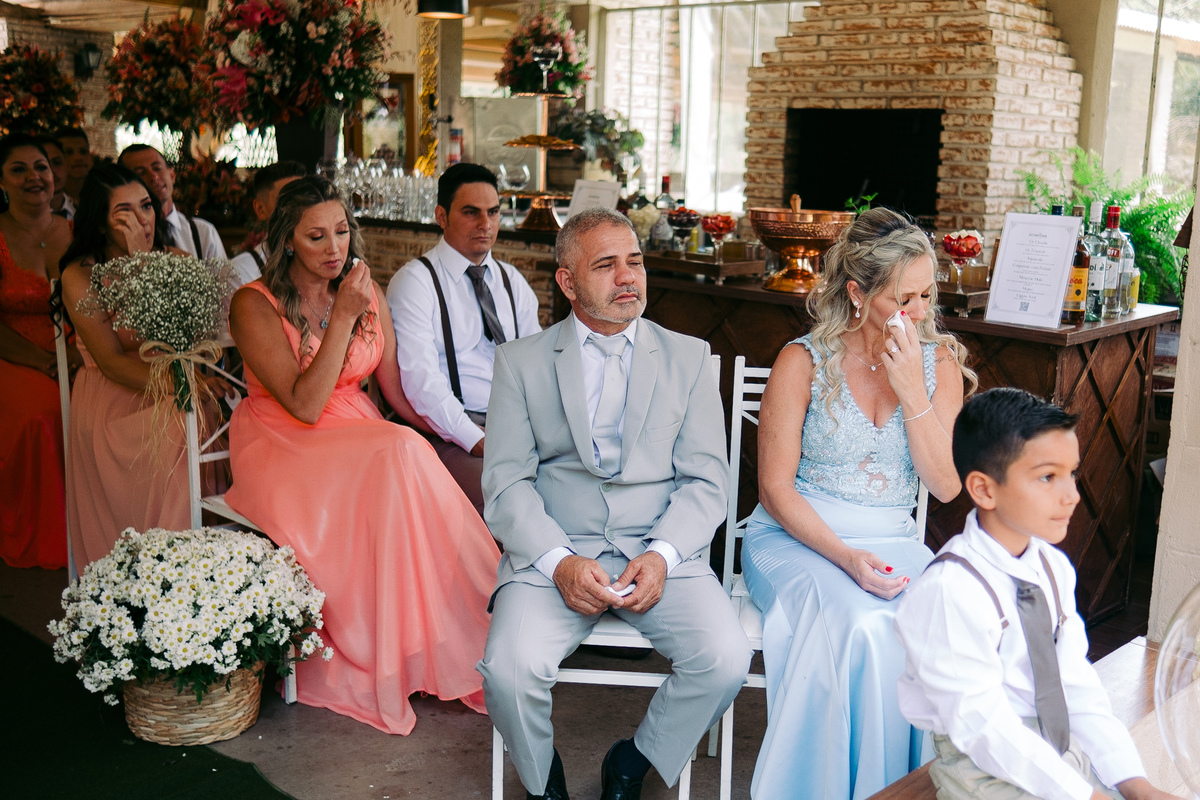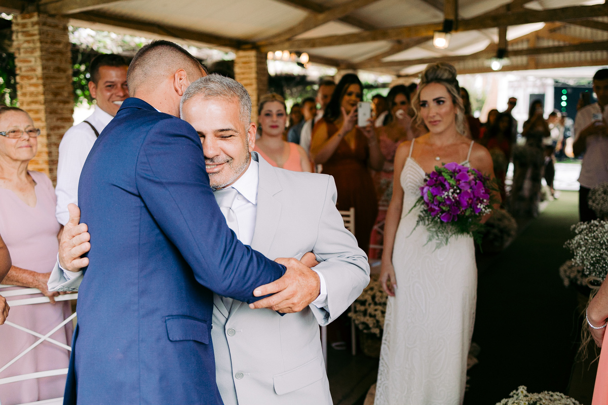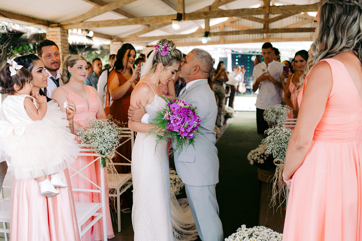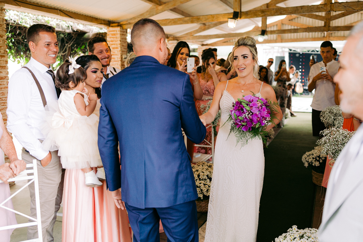 O momento que todos esperavam finalmente chegou, quando Rafaela e Gustavo se viram pela primeira vez na hora da cerimônia. O brilho em seus olhos refletia a alegria e a emoção de se tornarem marido e mulher diante daquele cenário de tirar o fôlego. O sol dourado iluminava o altar improvisado, enquanto o som suave da cachoeira preenchia o ar, criando uma atmosfera mágica e serena.