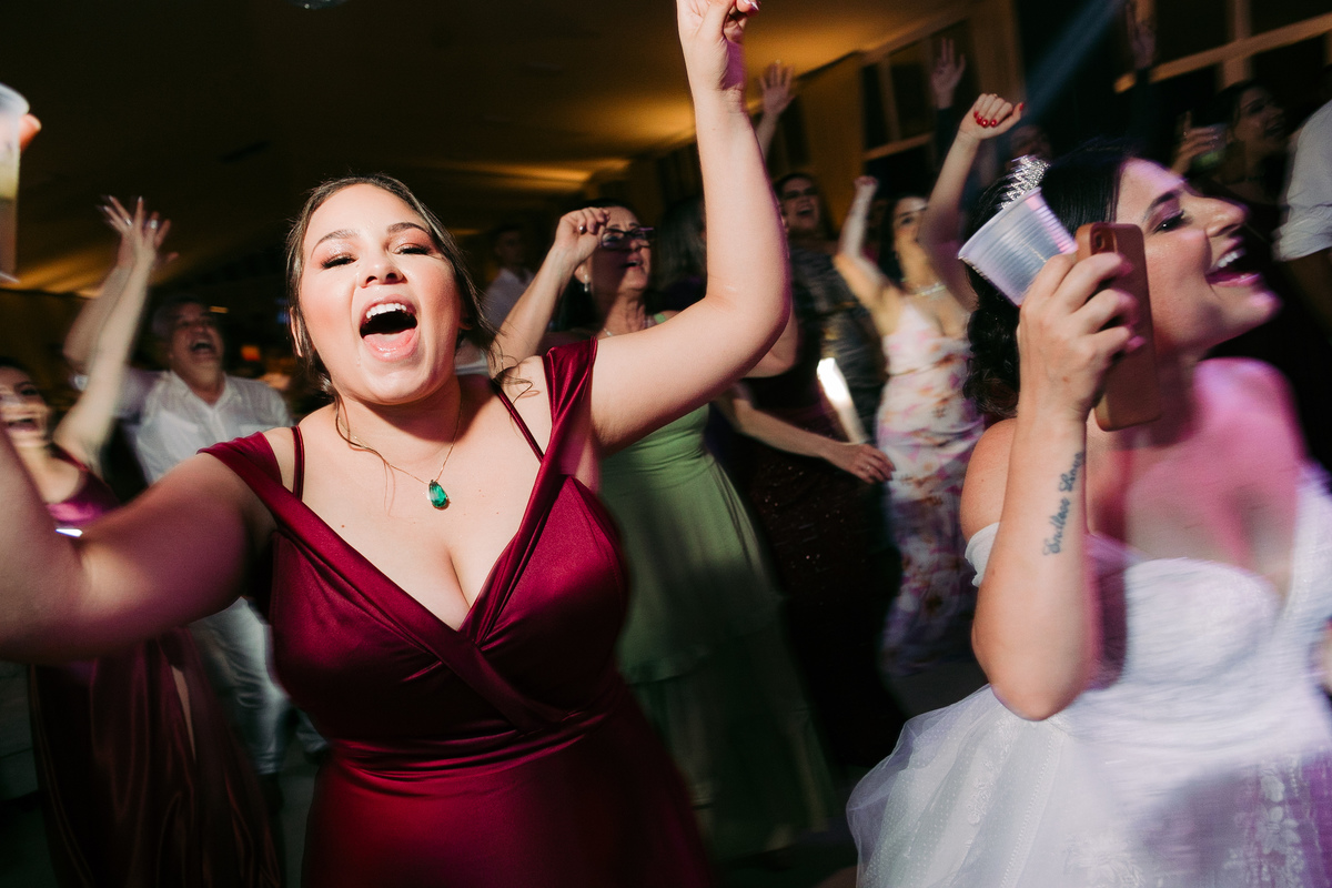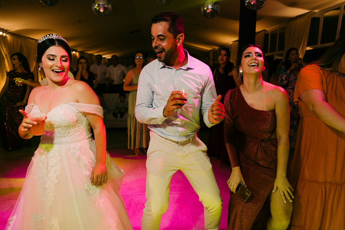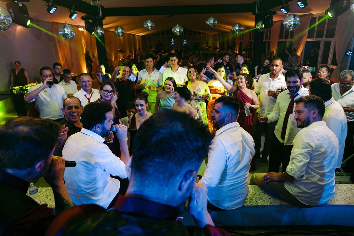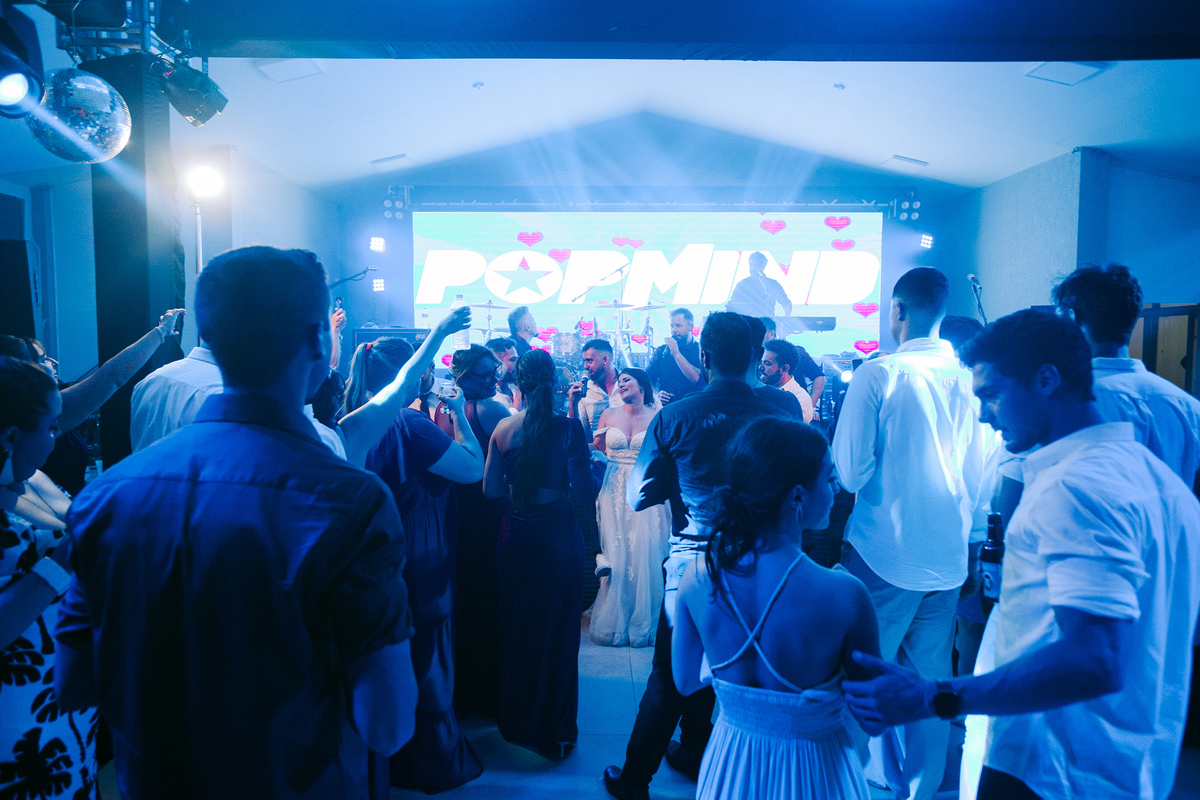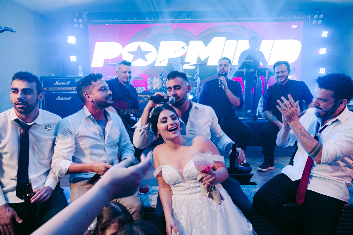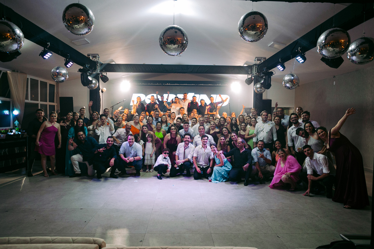 Ao final da tarde, o cenário se transformou em um espetáculo de cores e luzes, marcando o início de uma festa inesquecível. A banda PopMind agitou a pista de dança, garantindo que ninguém ficasse parado. E não foi apenas a banda que animou a festa; o noivo e seus amigos também deram seu show particular, cantando e contagiando a todos com sua alegria.