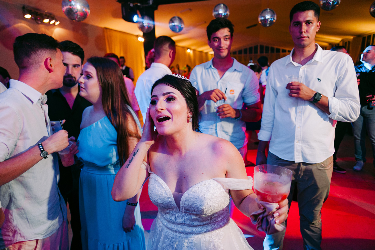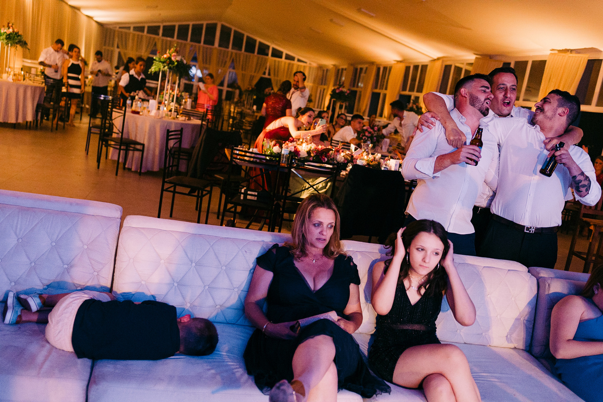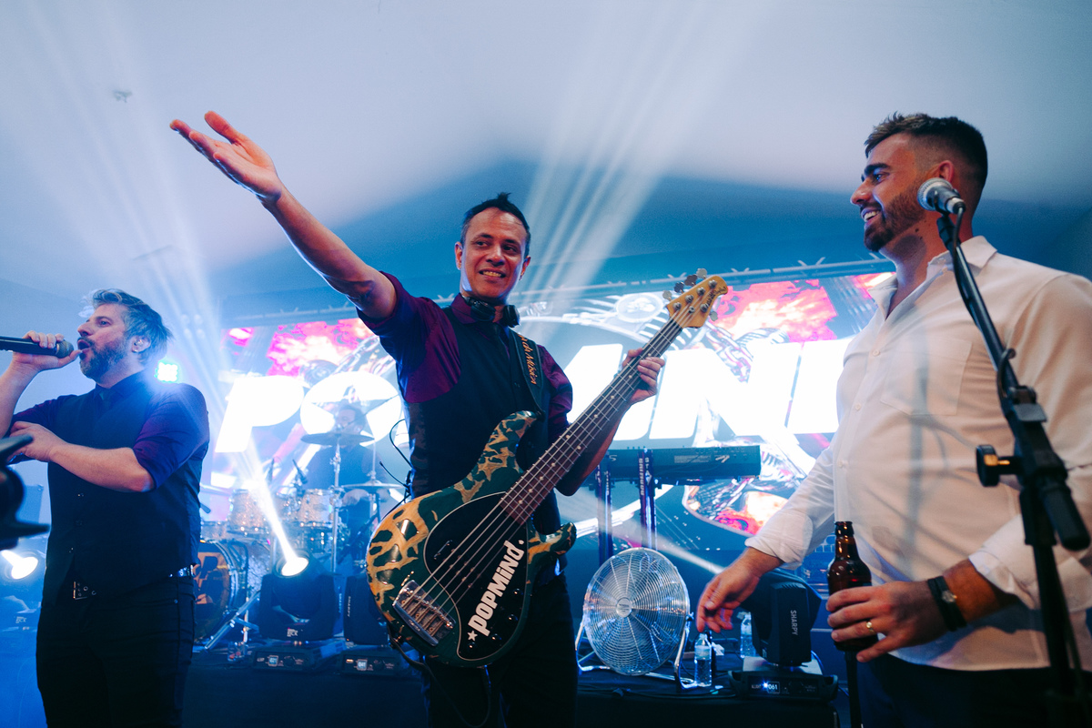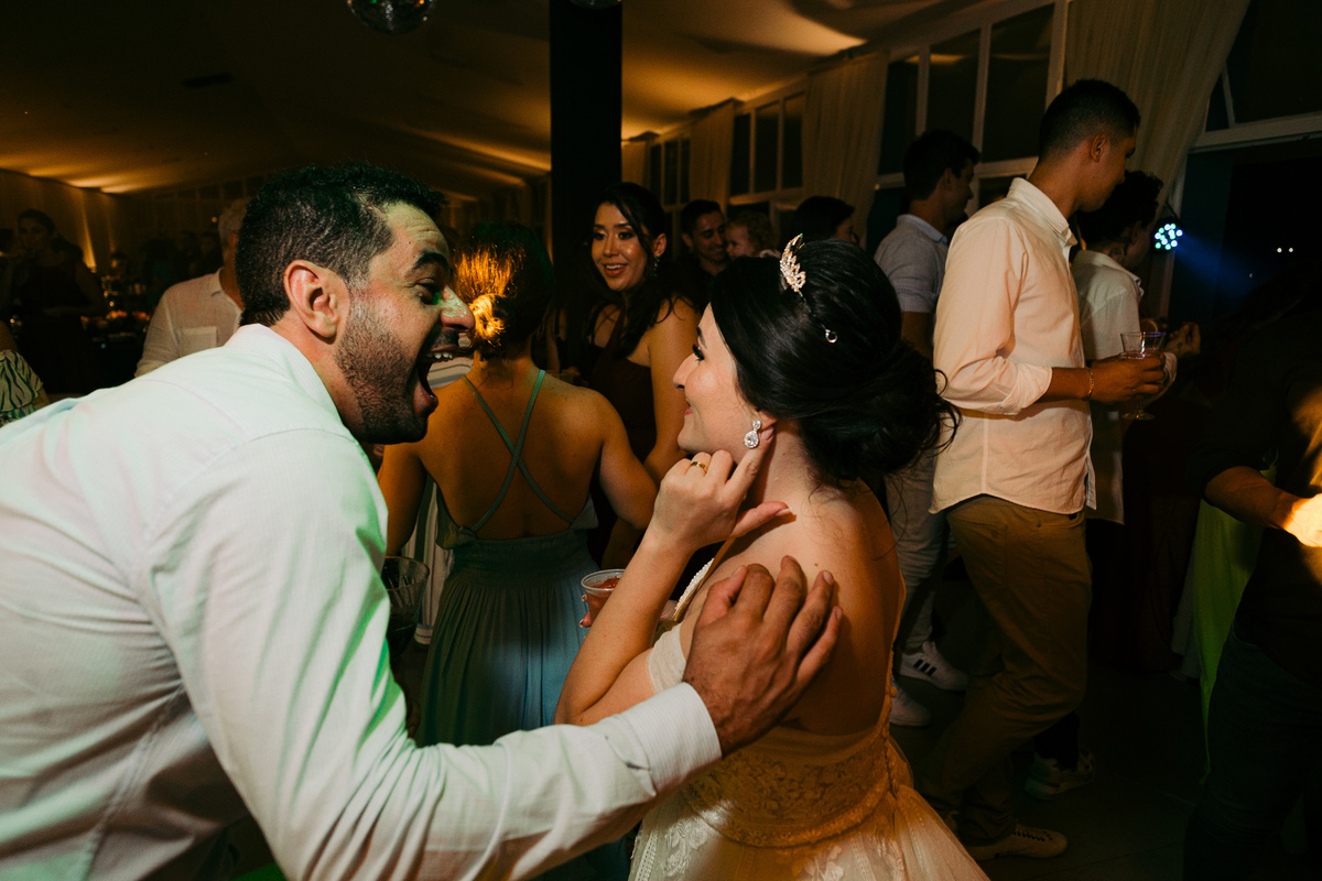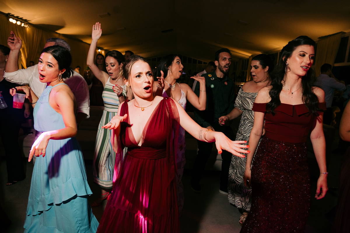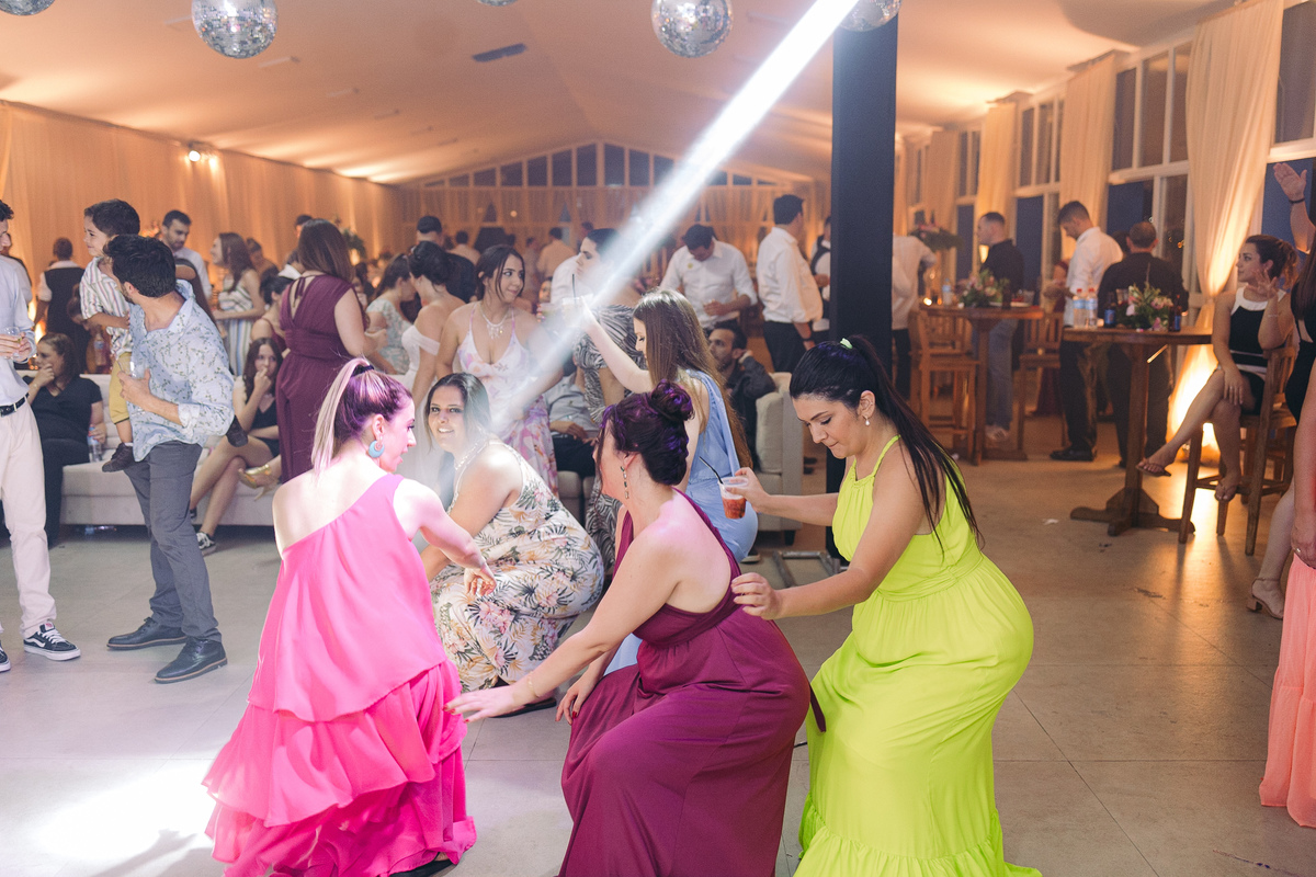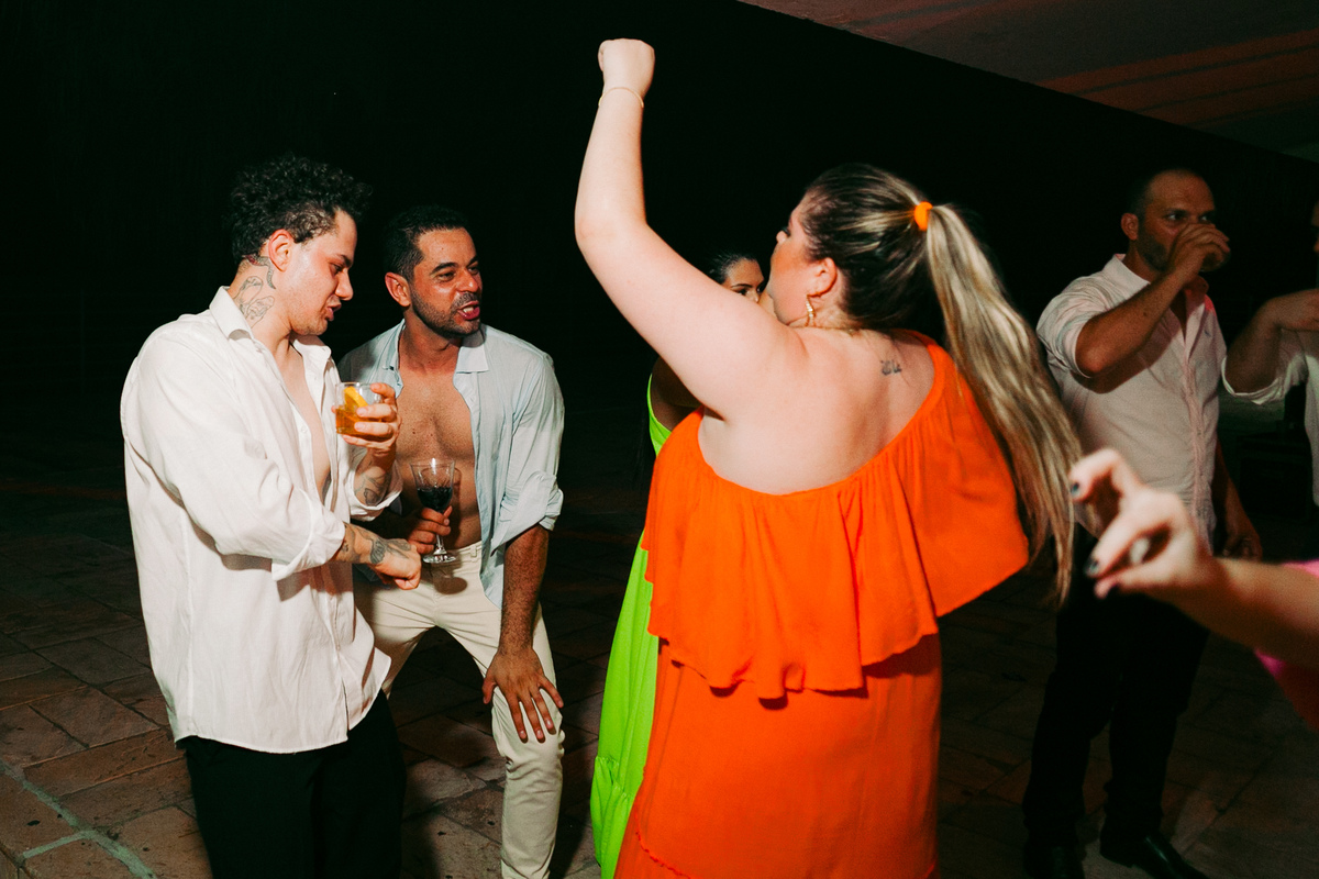 Ao final da tarde, o cenário se transformou em um espetáculo de cores e luzes, marcando o início de uma festa inesquecível. A banda PopMind agitou a pista de dança, garantindo que ninguém ficasse parado. E não foi apenas a banda que animou a festa; o noivo e seus amigos também deram seu show particular, cantando e contagiando a todos com sua alegria.