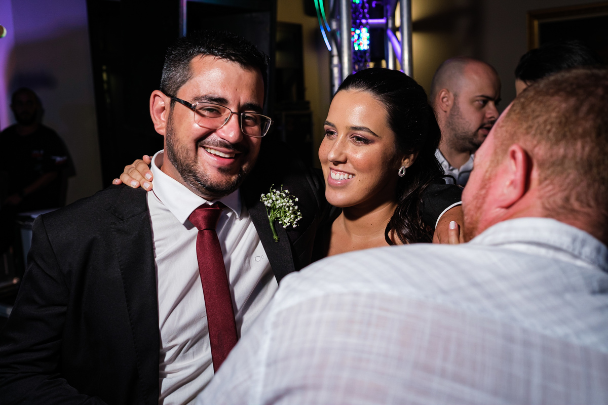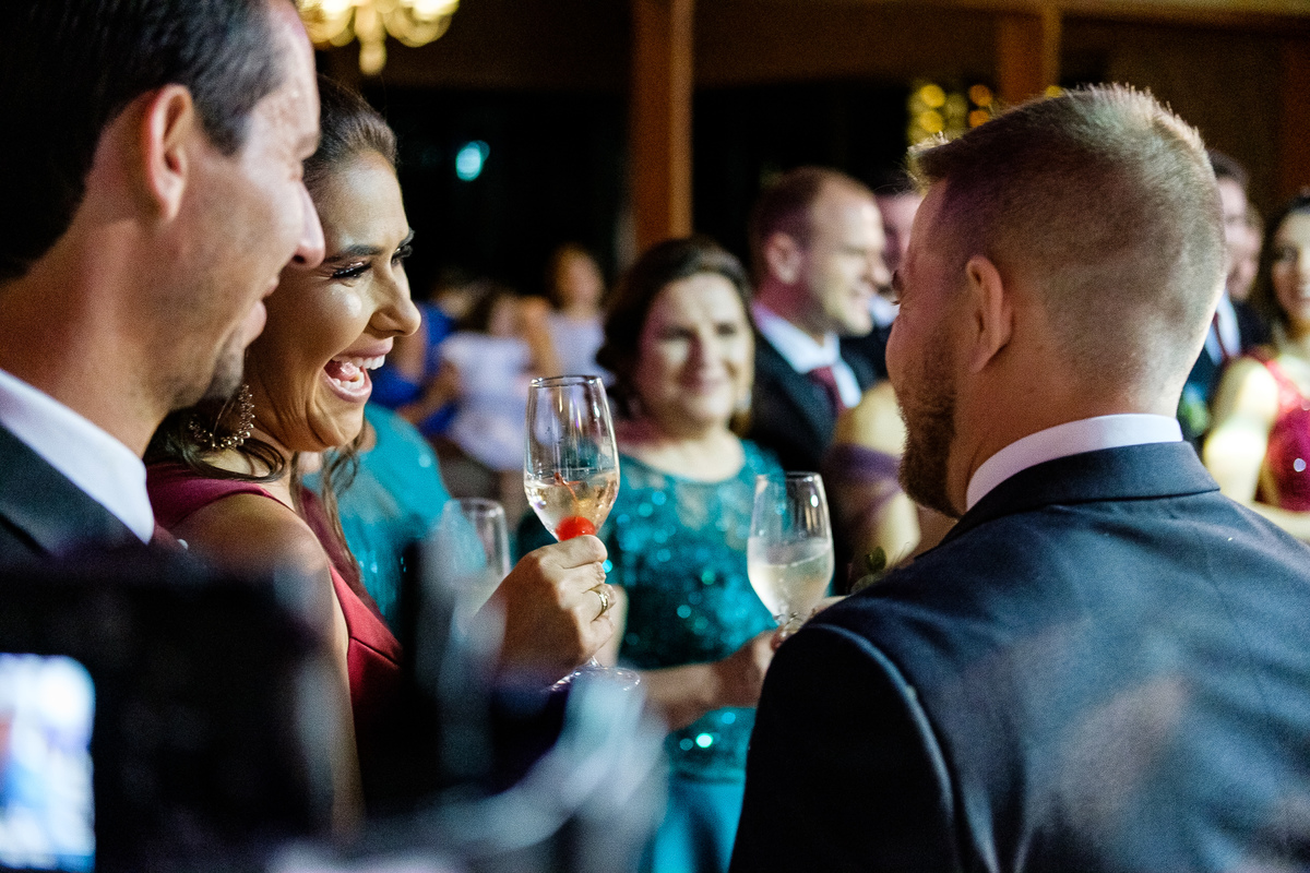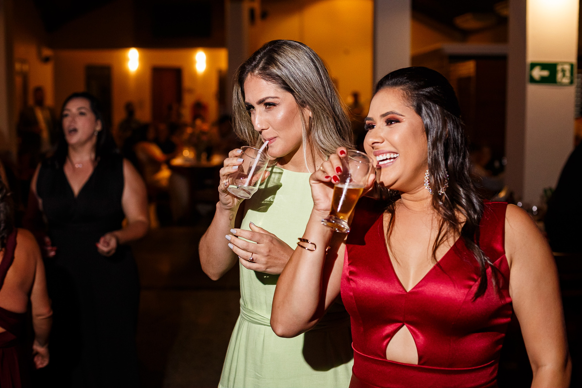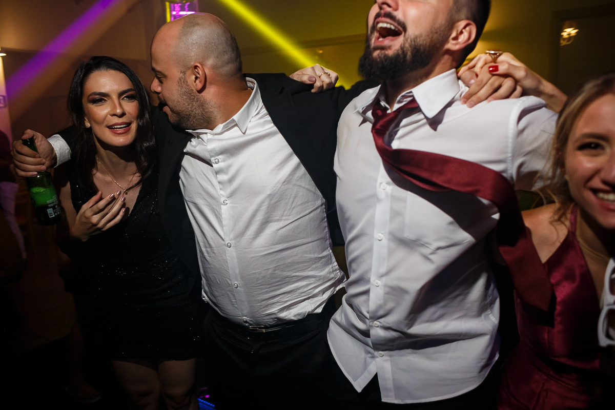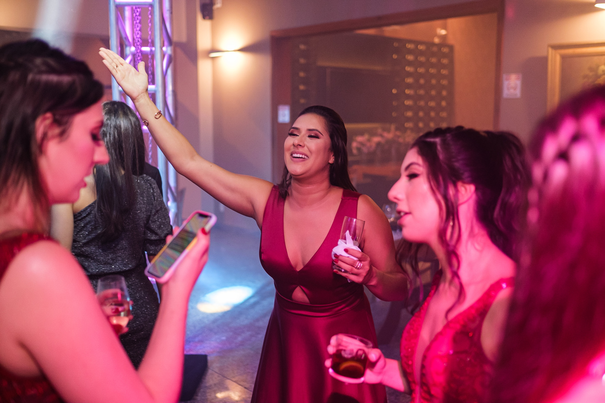 Após a cerimônia, a festa começou e foi absolutamente animada. A energia contagiante dos noivos se espalhou por todo o salão, e logo todos estavam dançando e celebrando a união do casal. A pista de dança esteve movimentada durante toda a noite, com os convidados se divertindo.