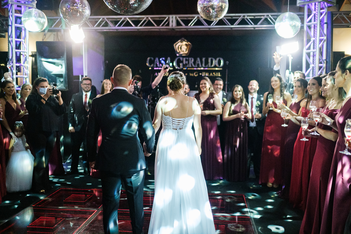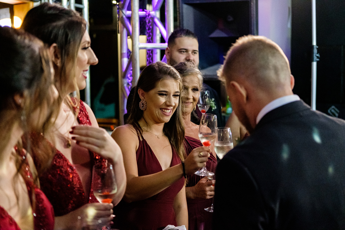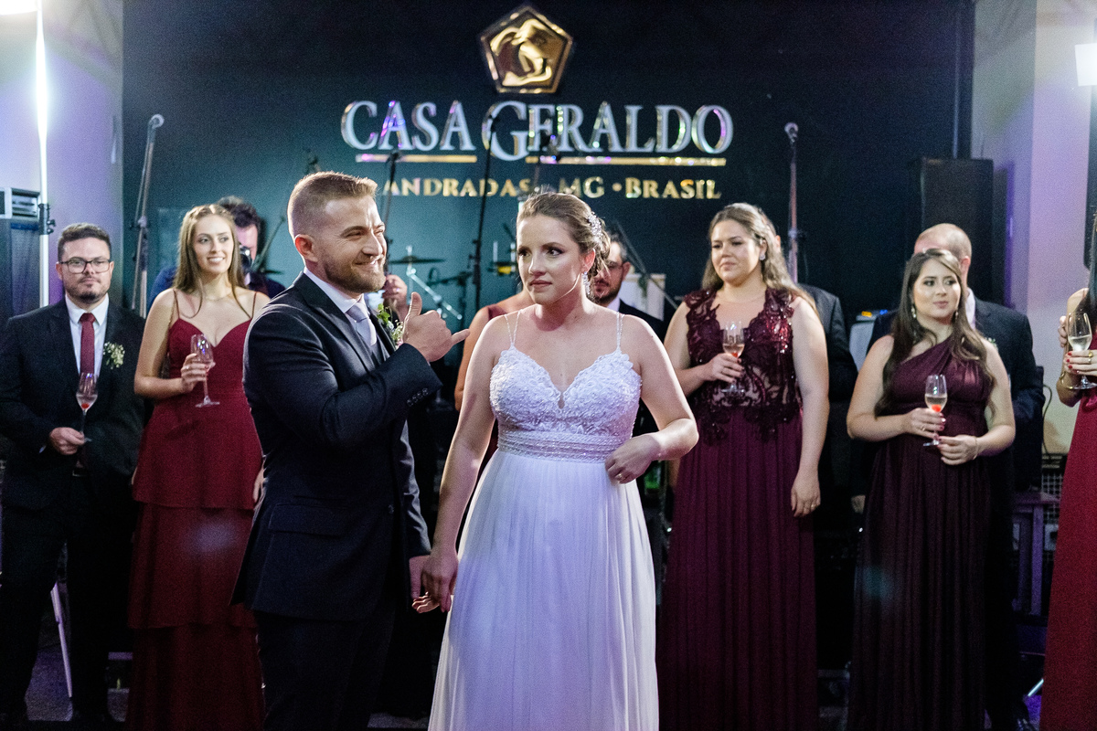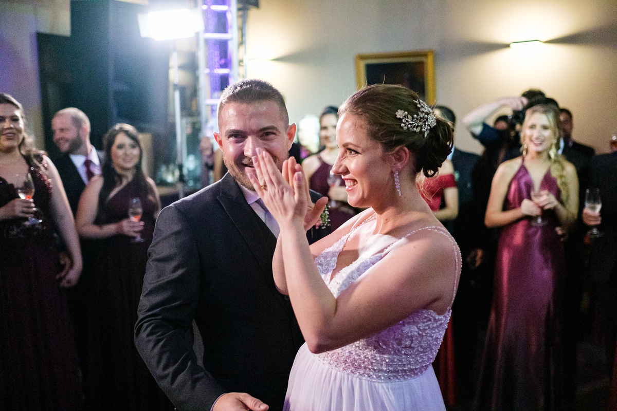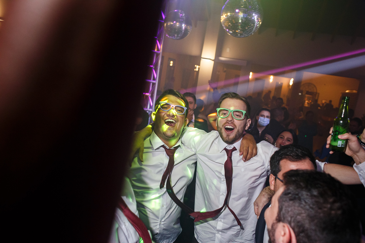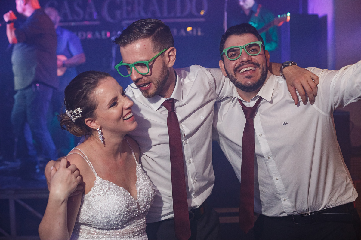 Após a cerimônia, a festa começou e foi absolutamente animada. A energia contagiante dos noivos se espalhou por todo o salão, e logo todos estavam dançando e celebrando a união do casal. A pista de dança esteve movimentada durante toda a noite, com os convidados se divertindo.