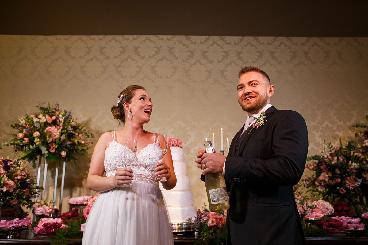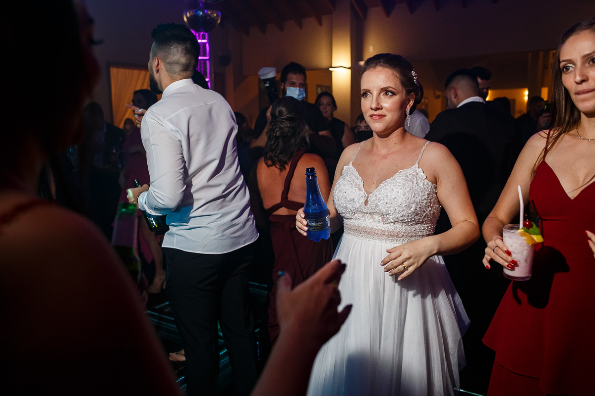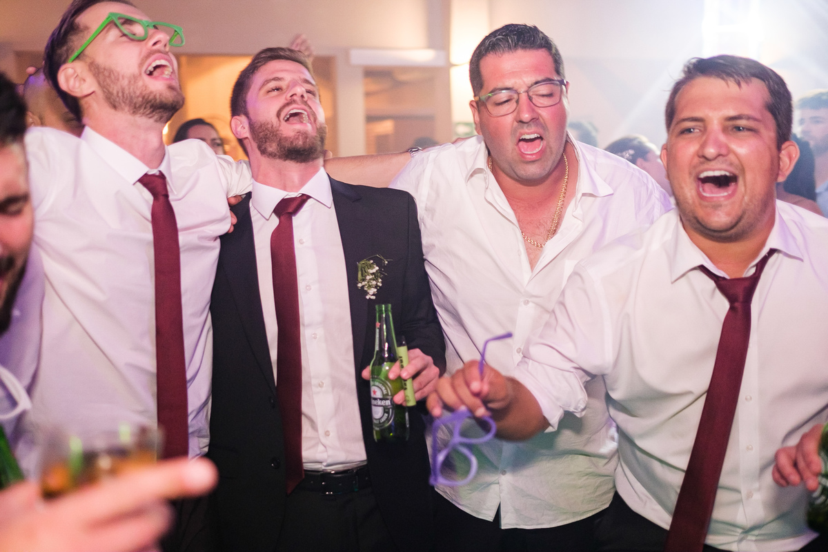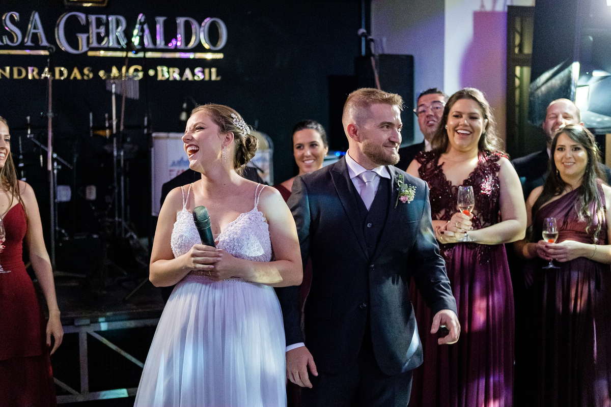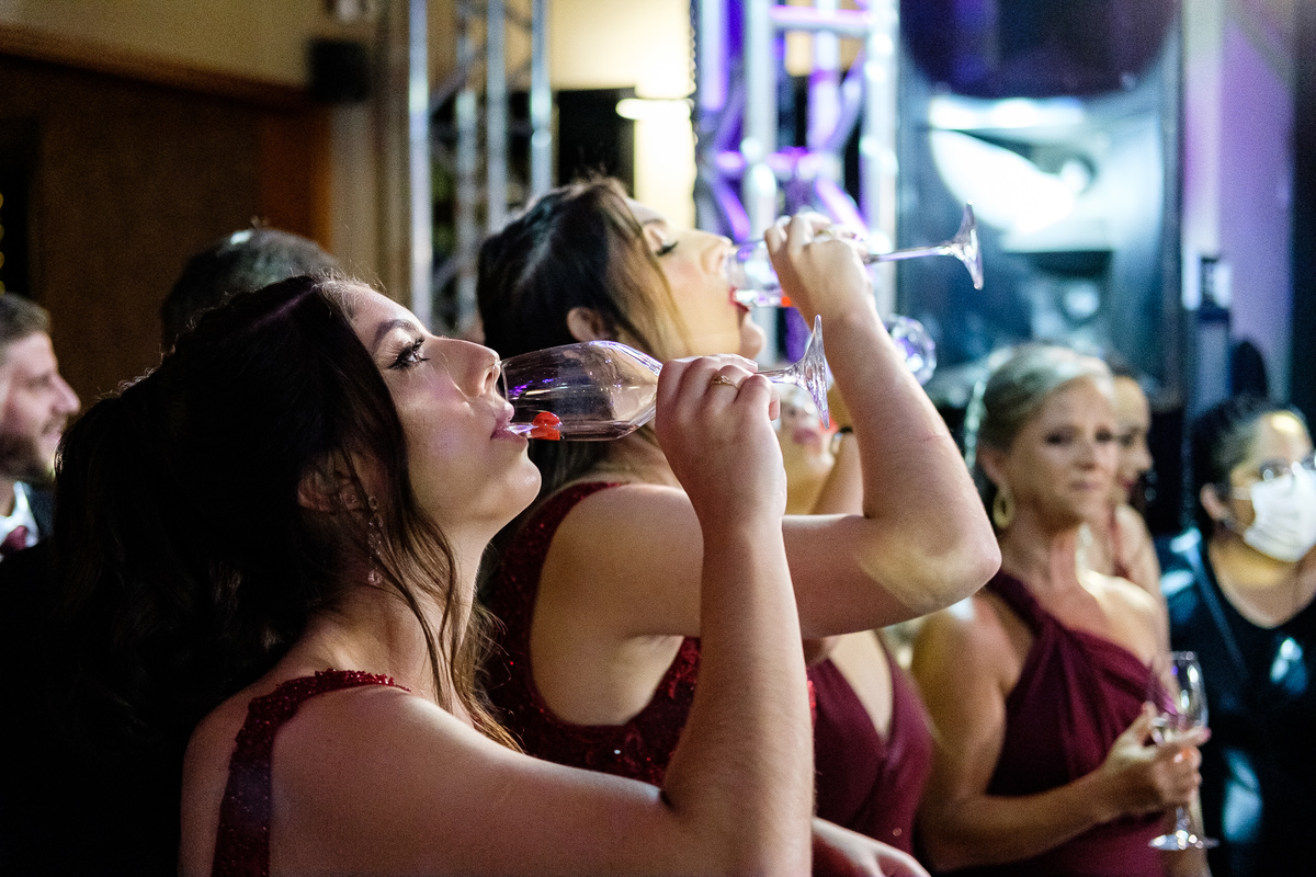 Após a cerimônia, a festa começou e foi absolutamente animada. A energia contagiante dos noivos se espalhou por todo o salão, e logo todos estavam dançando e celebrando a união do casal. A pista de dança esteve movimentada durante toda a noite, com os convidados se divertindo.