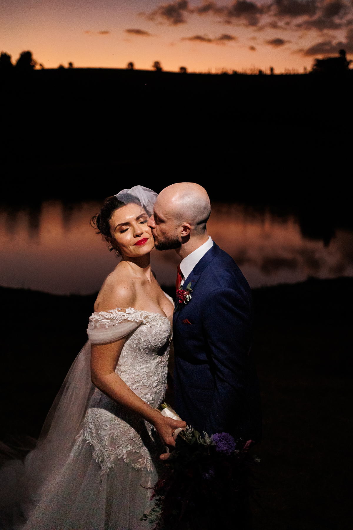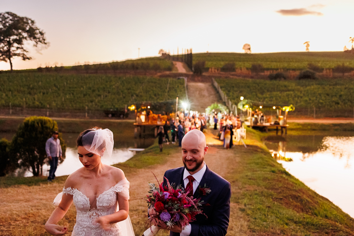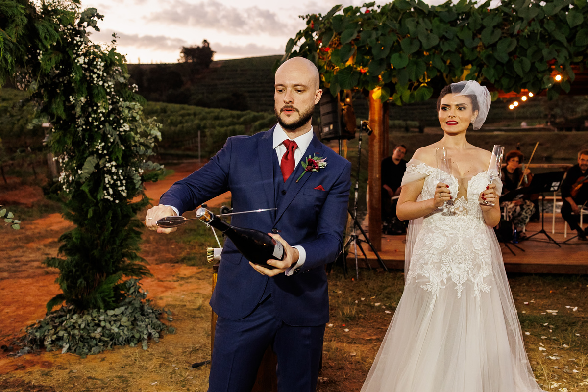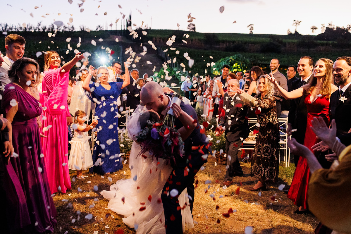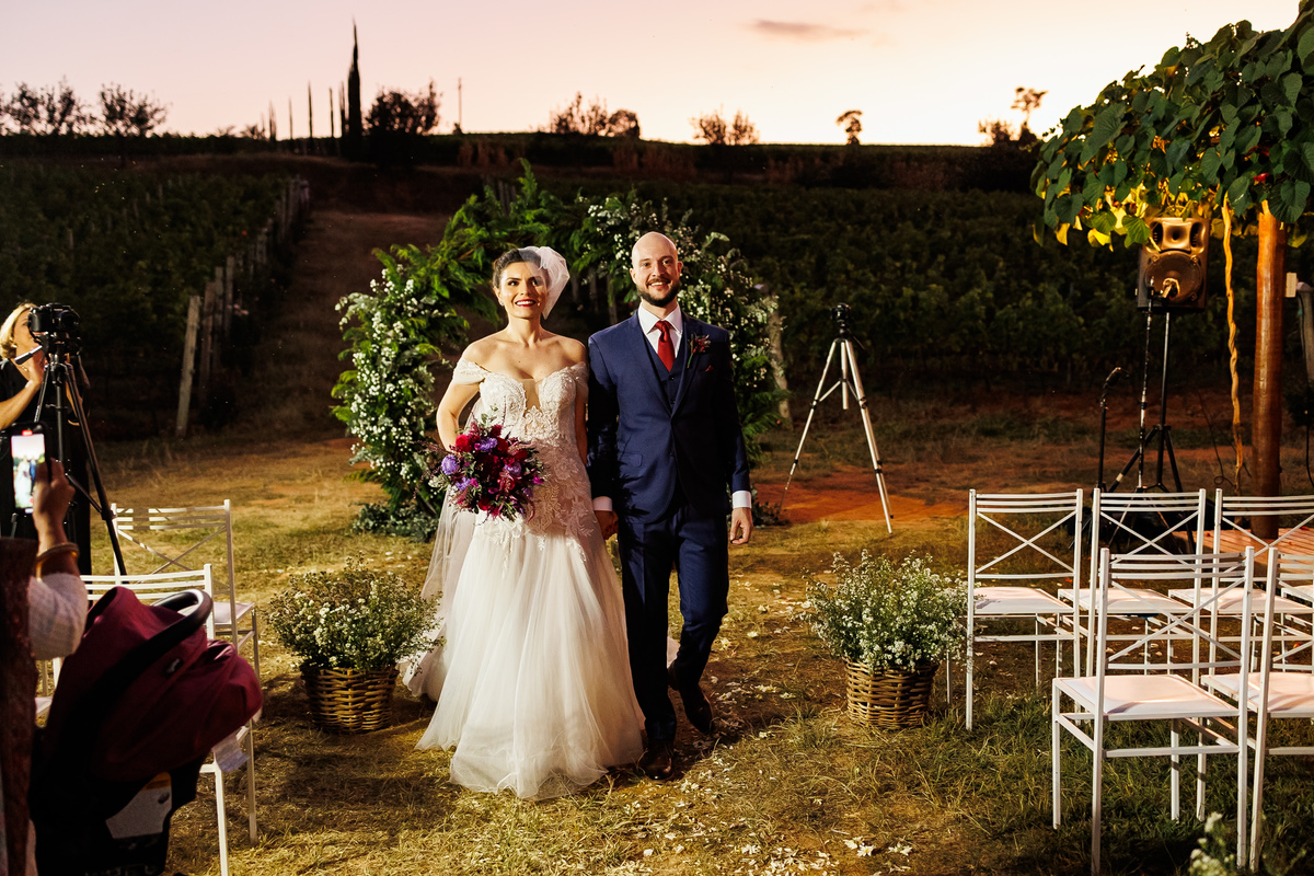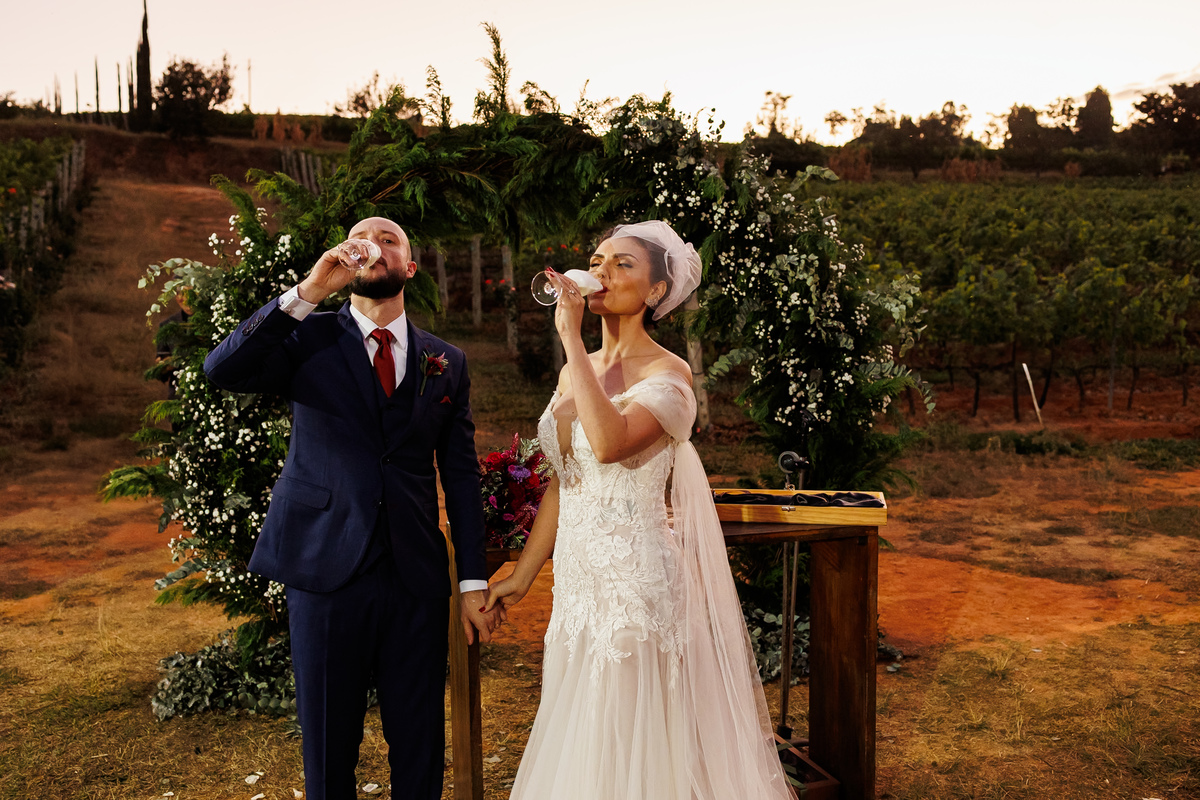 A cerimônia aconteceu no pitoresco parreiral da Vinícola Casa Geraldo, um local de beleza singular que proporcionou um cenário perfeito para o grande dia. O pôr do sol foi simplesmente espetacular, pintando o céu com tons quentes de laranja e rosa, criando uma atmosfera mágica que refletia o amor de Fabiana e Dante.