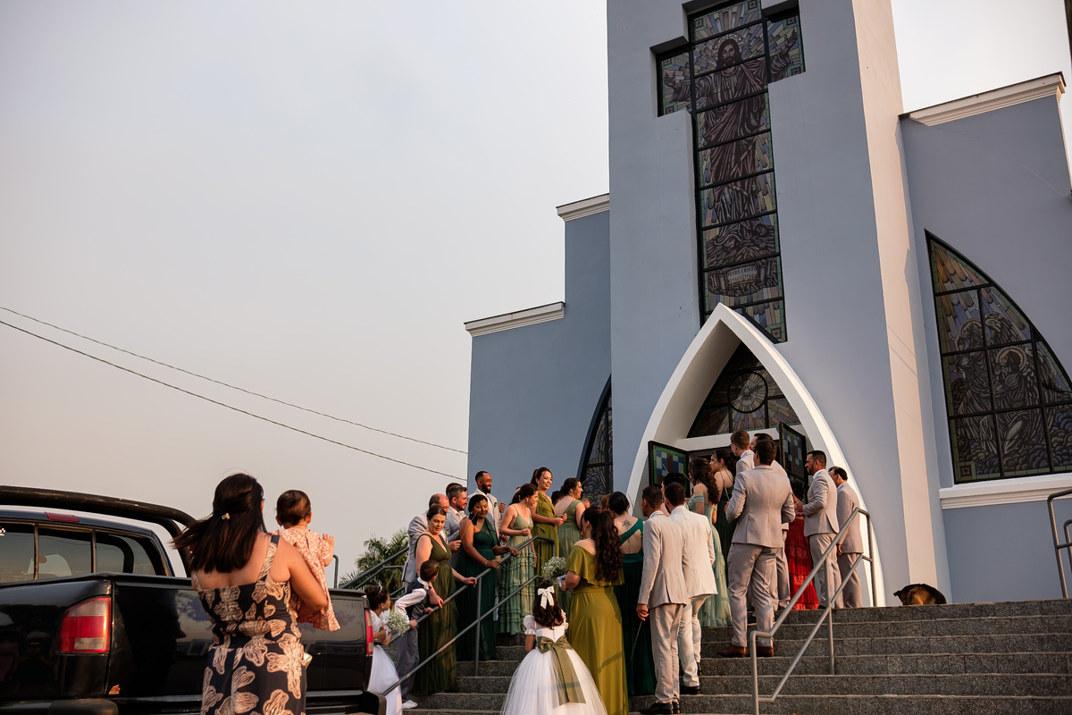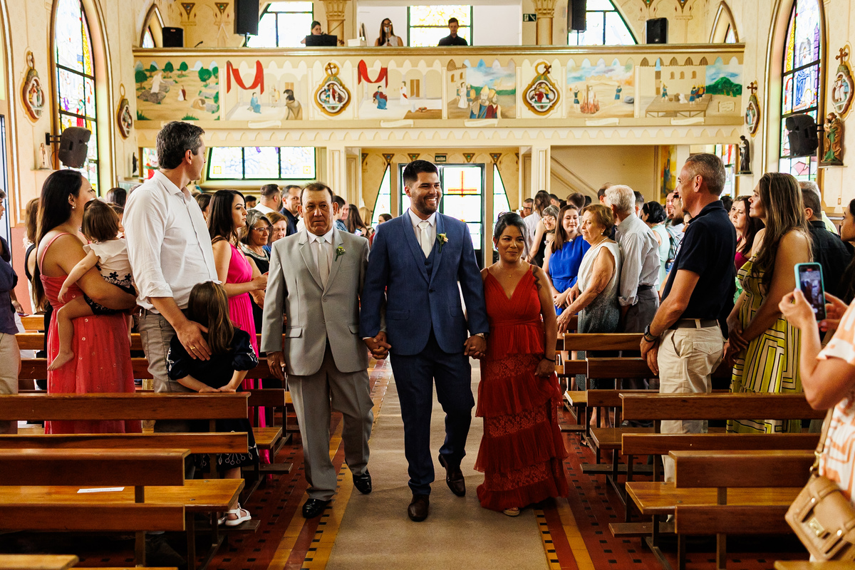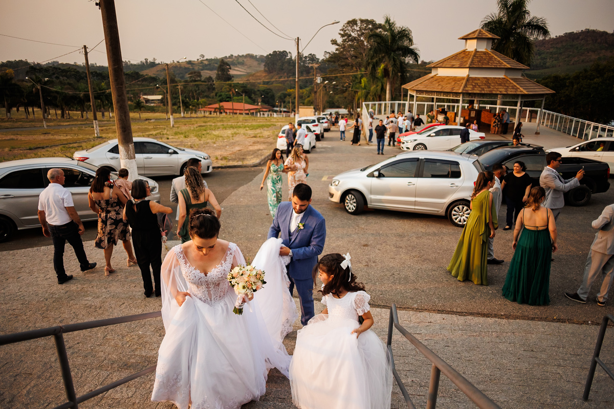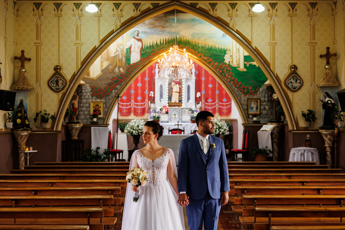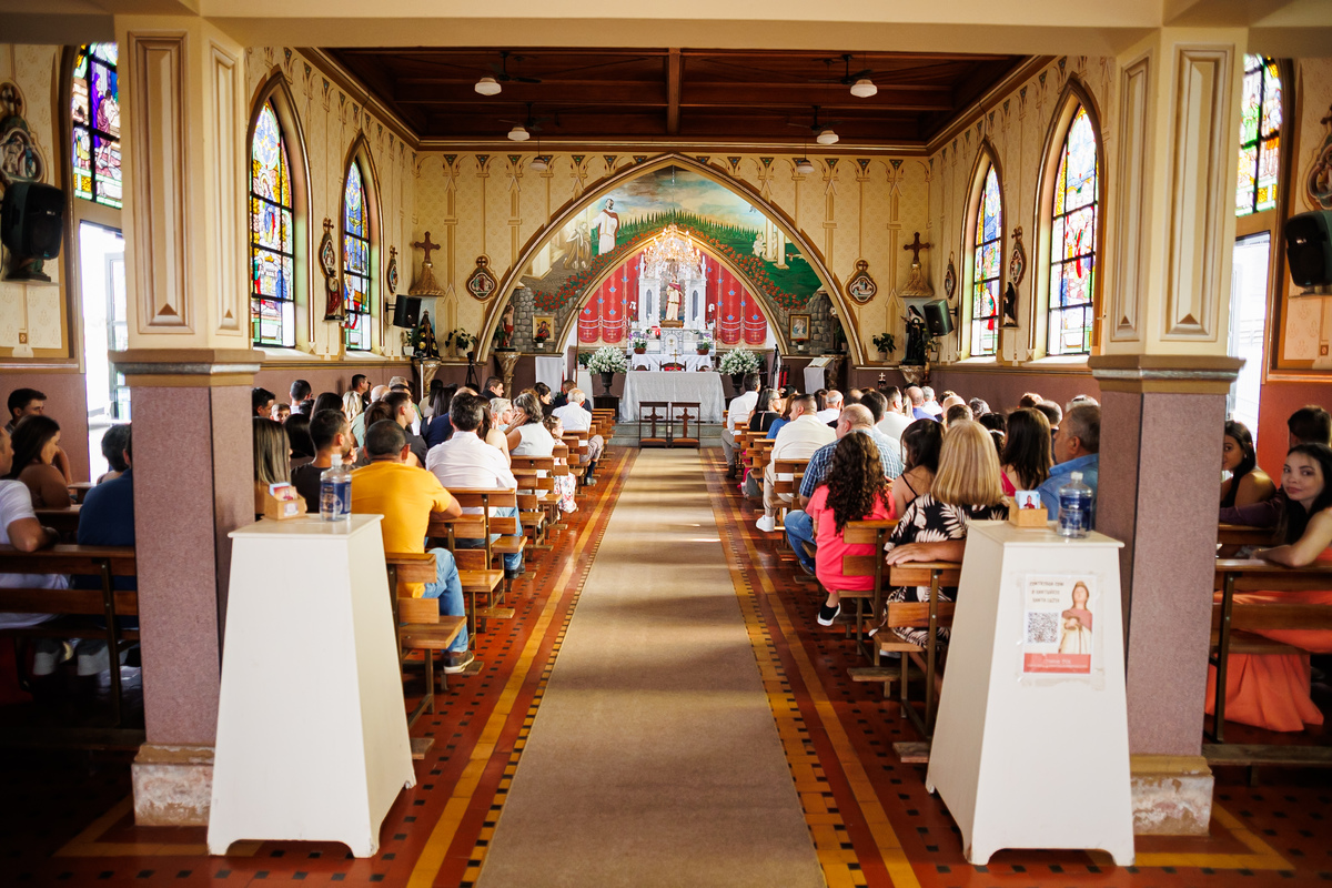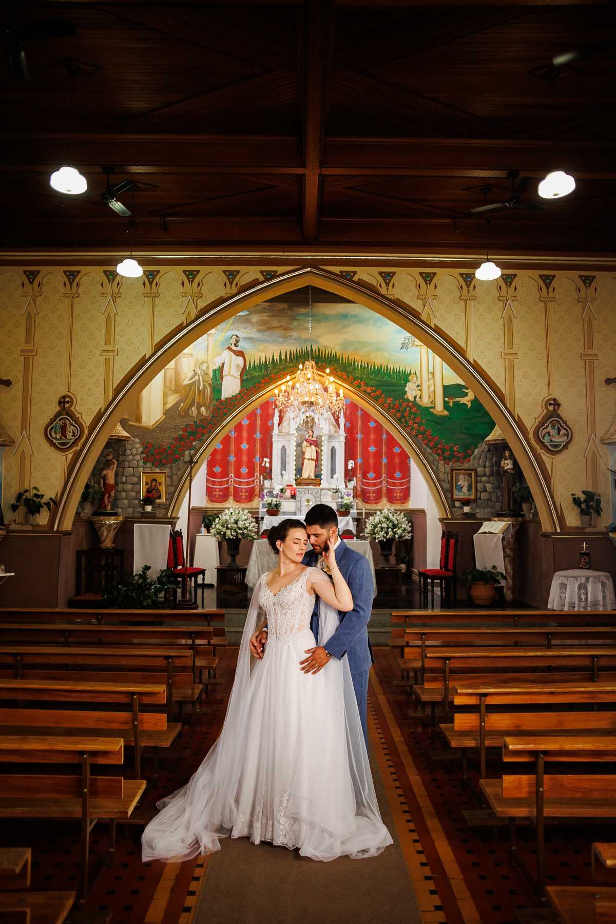 Após a cerimônia, fizemos um ensaio dos recém-casados na própria igreja, aproveitando o ambiente ainda repleto de emoção. Enquanto isso, os convidados se dirigiam ao Tuia Véia, onde a festa já prometia ser animada.