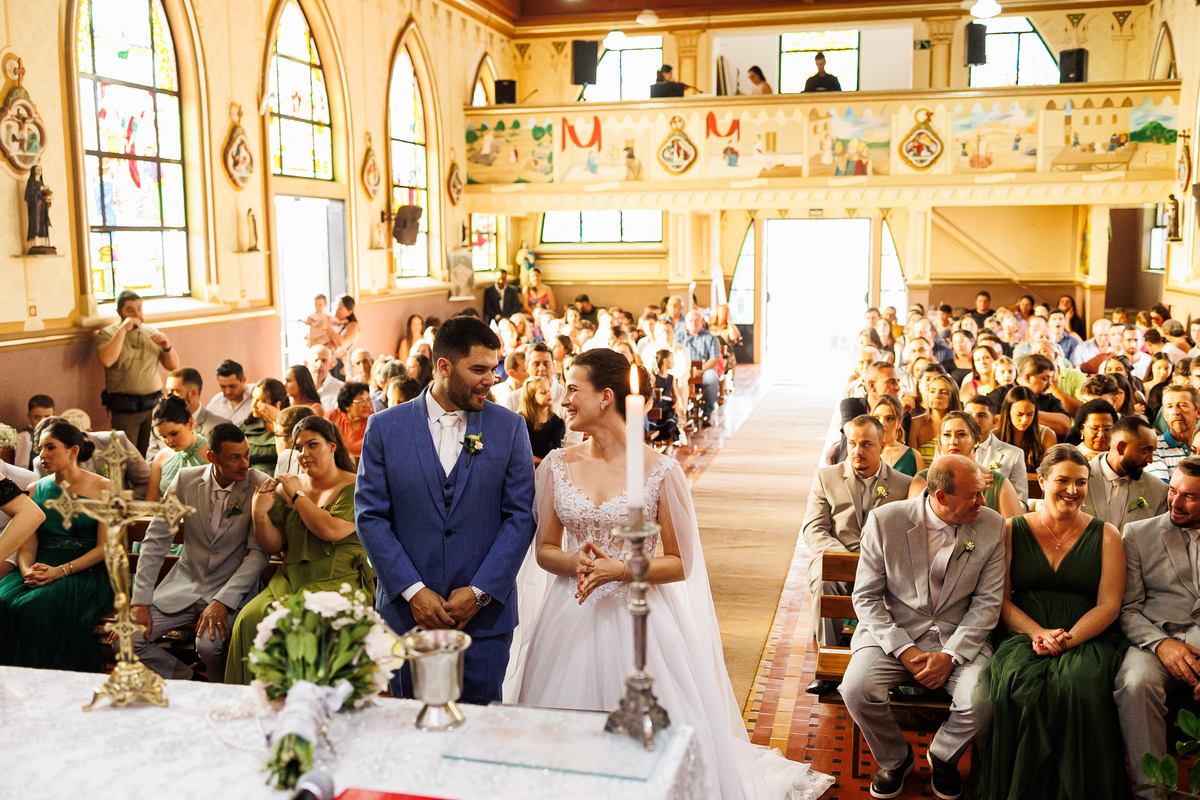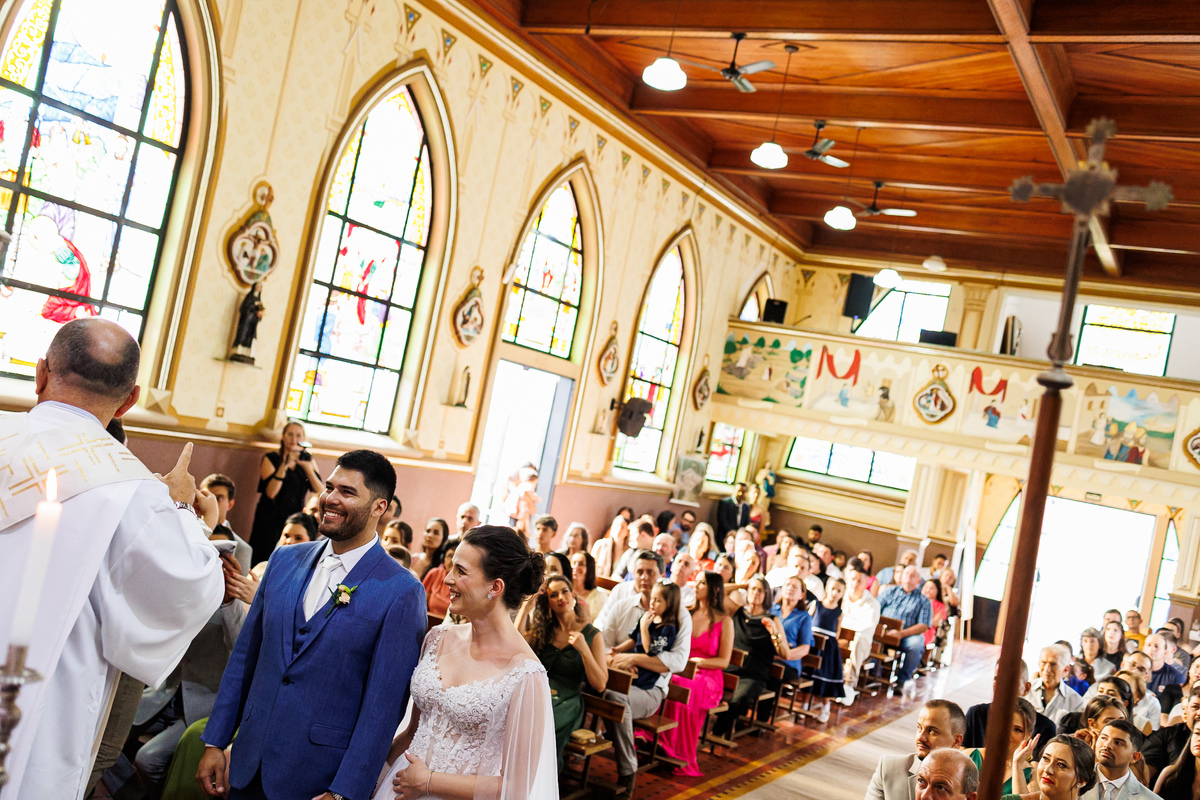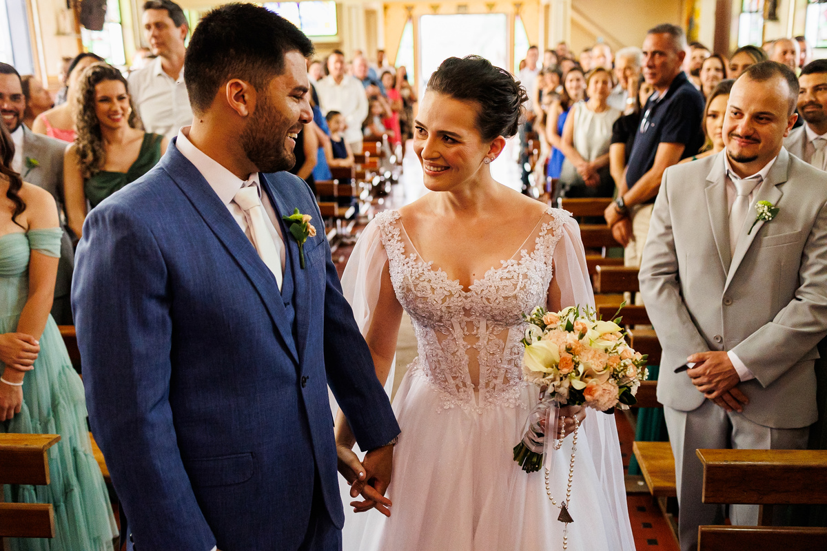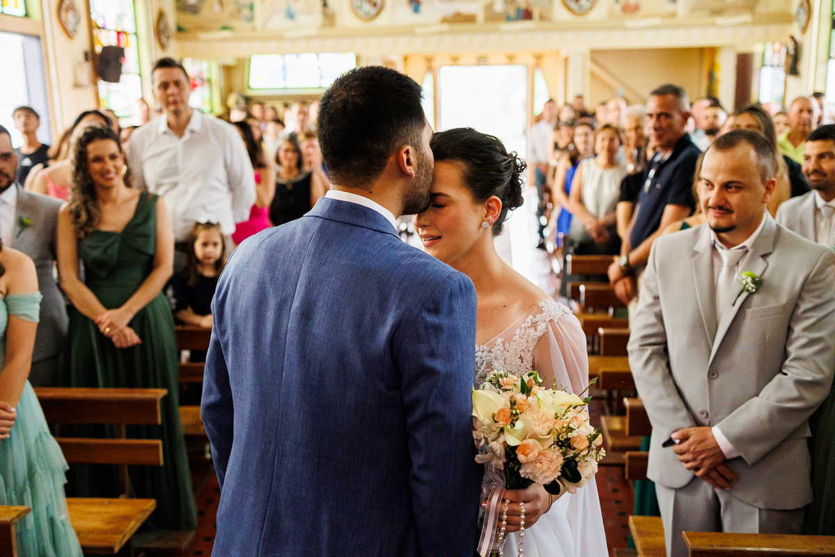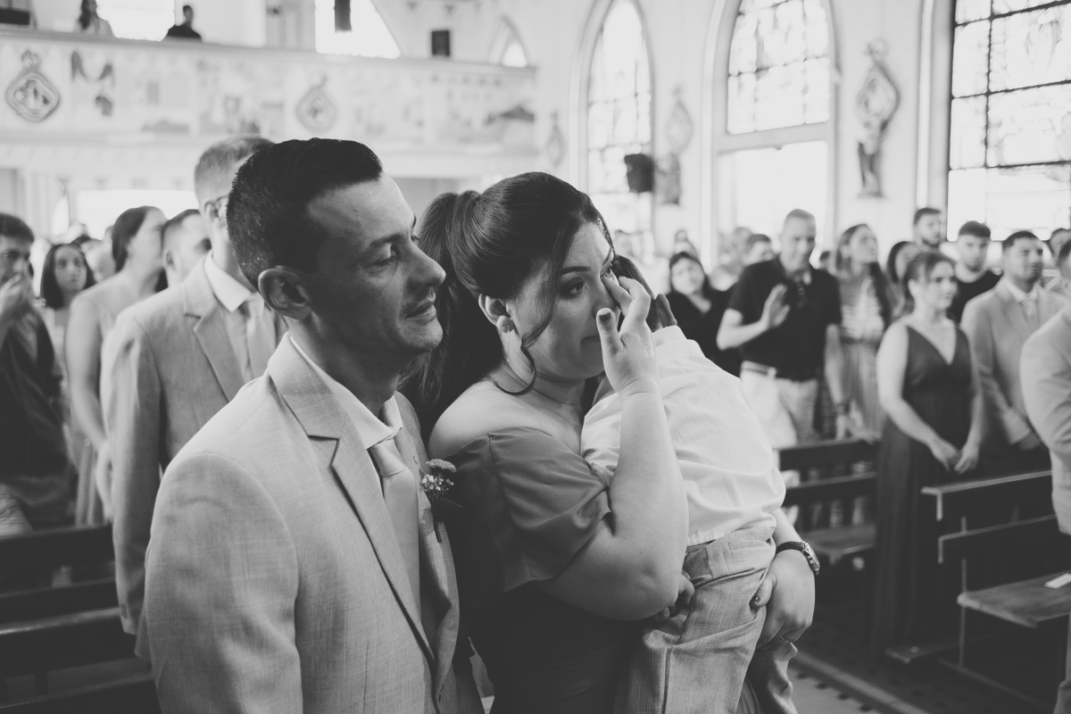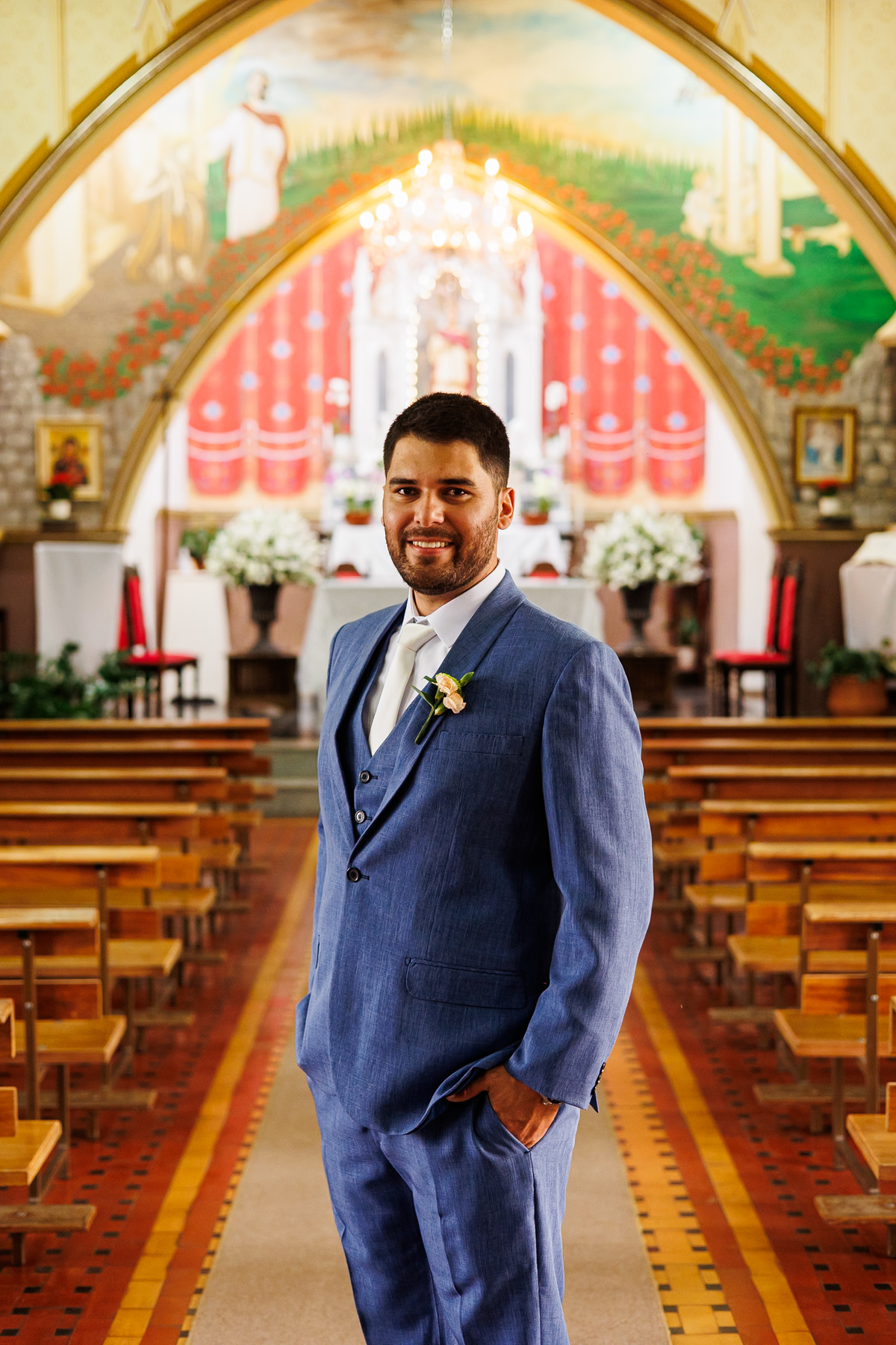 Após a cerimônia, fizemos um ensaio dos recém-casados na própria igreja, aproveitando o ambiente ainda repleto de emoção. Enquanto isso, os convidados se dirigiam ao Tuia Véia, onde a festa já prometia ser animada.