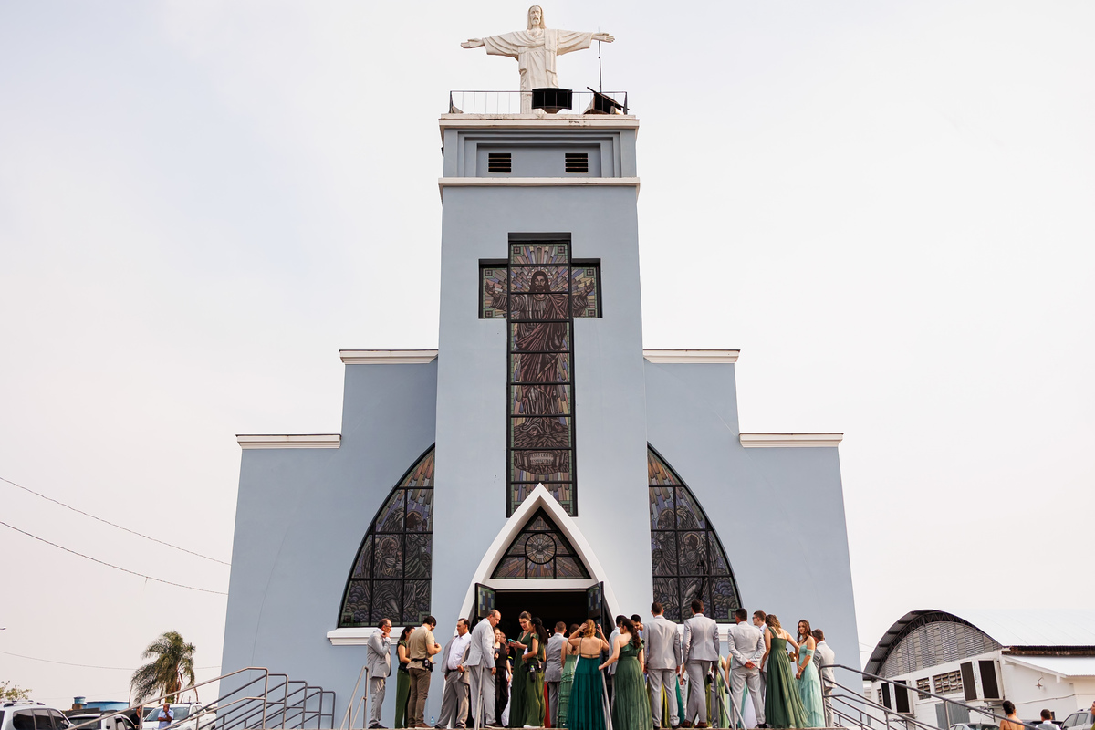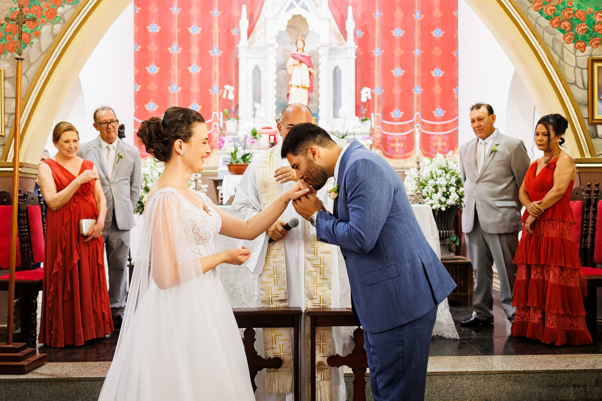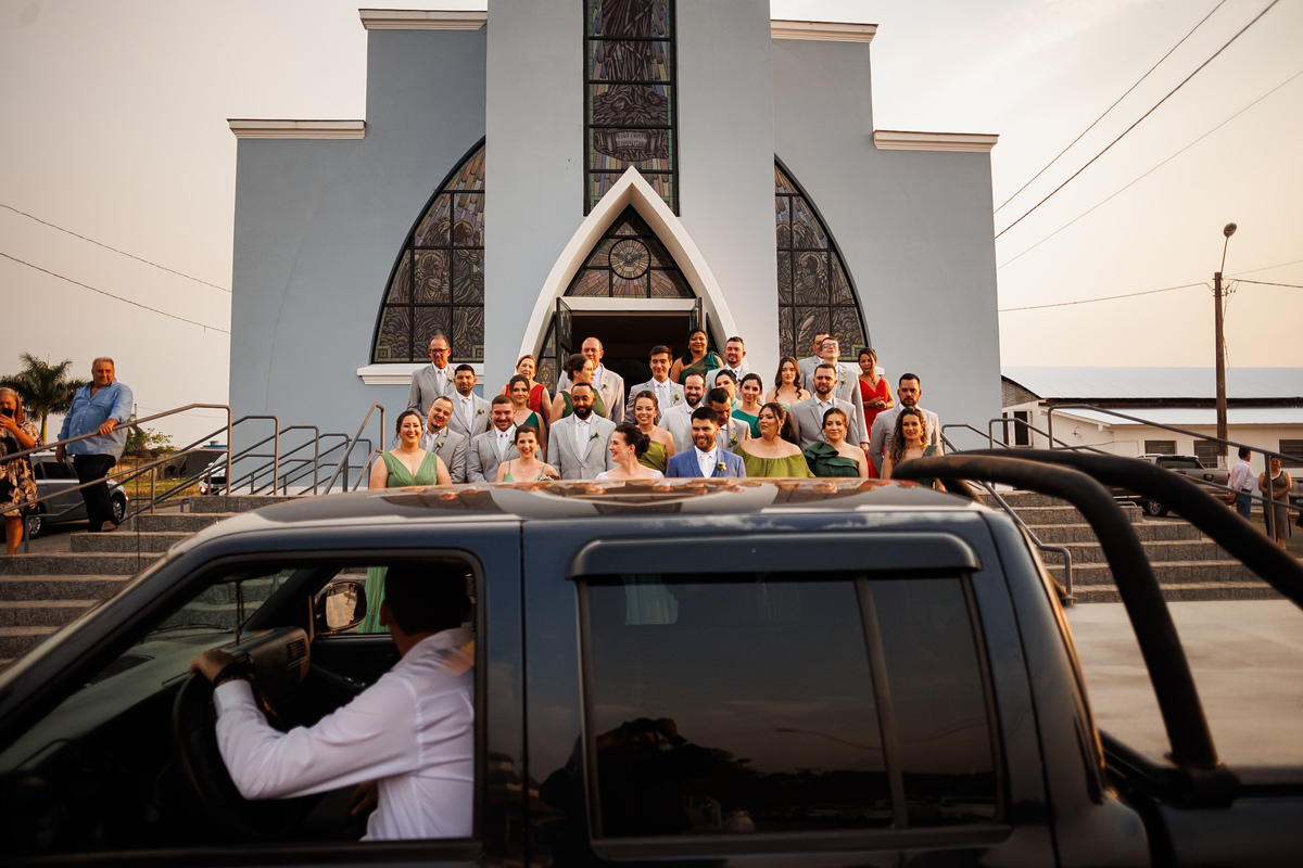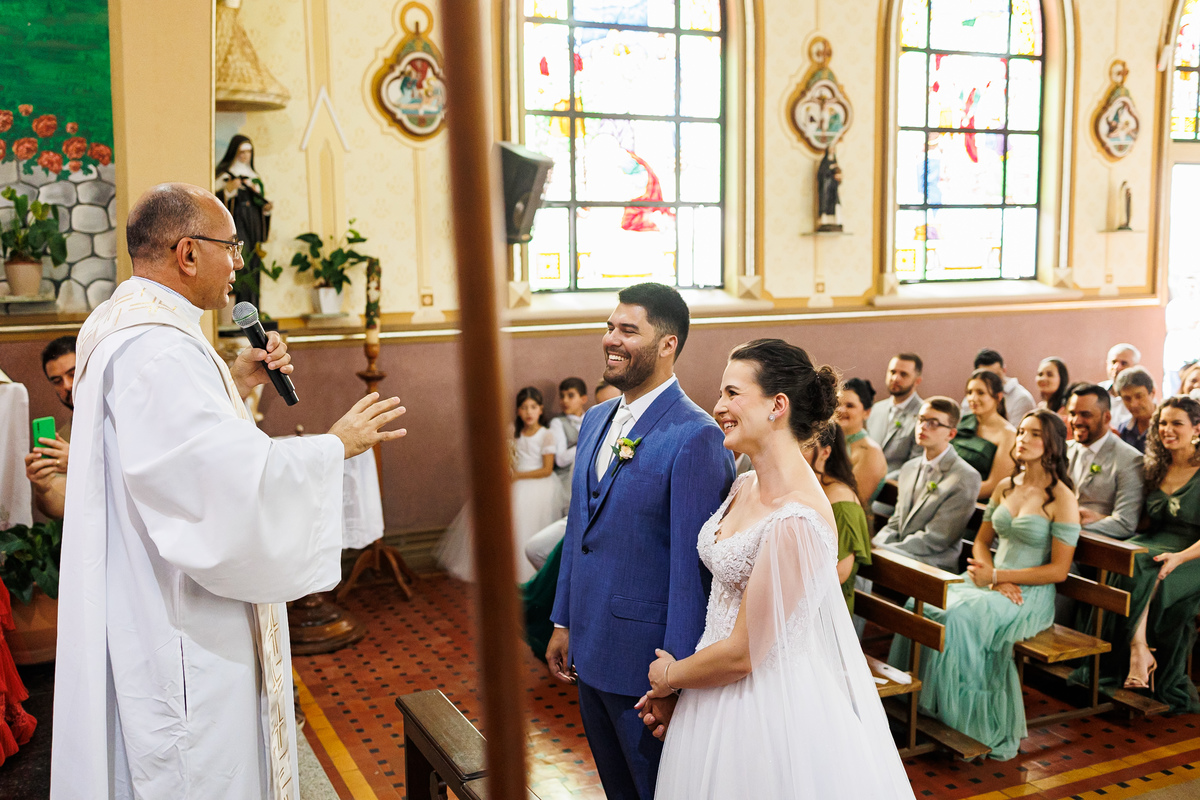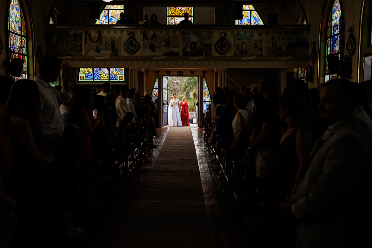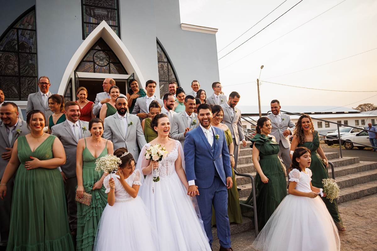 Após a cerimônia, fizemos um ensaio dos recém-casados na própria igreja, aproveitando o ambiente ainda repleto de emoção. Enquanto isso, os convidados se dirigiam ao Tuia Véia, onde a festa já prometia ser animada.