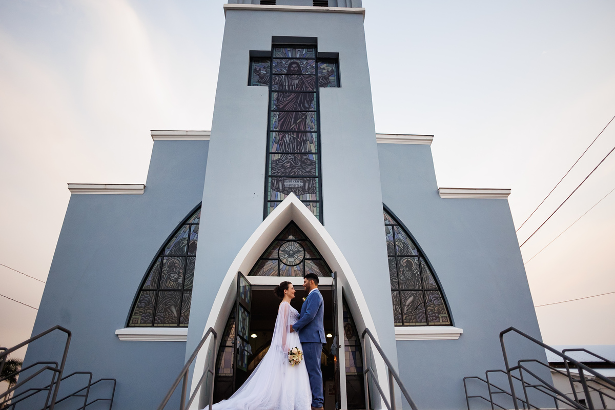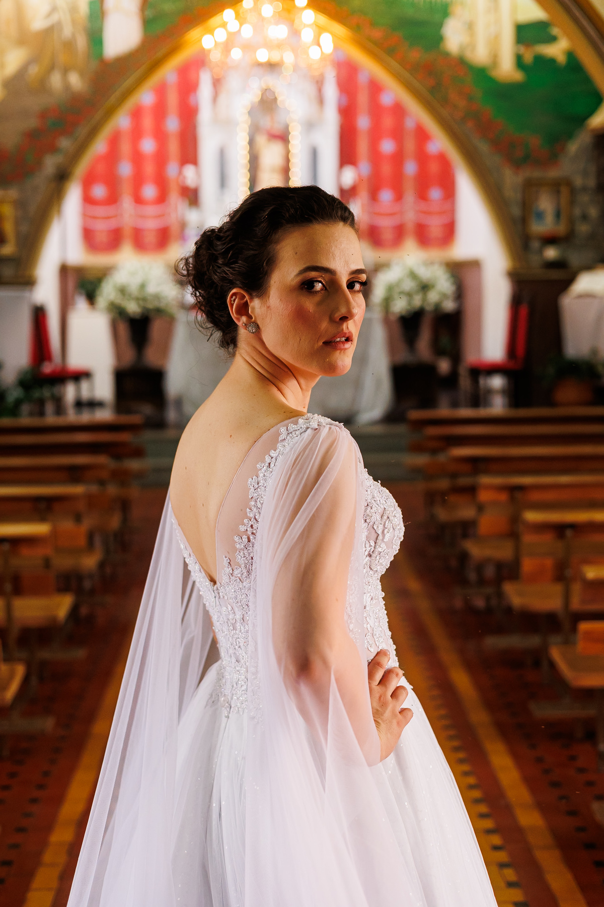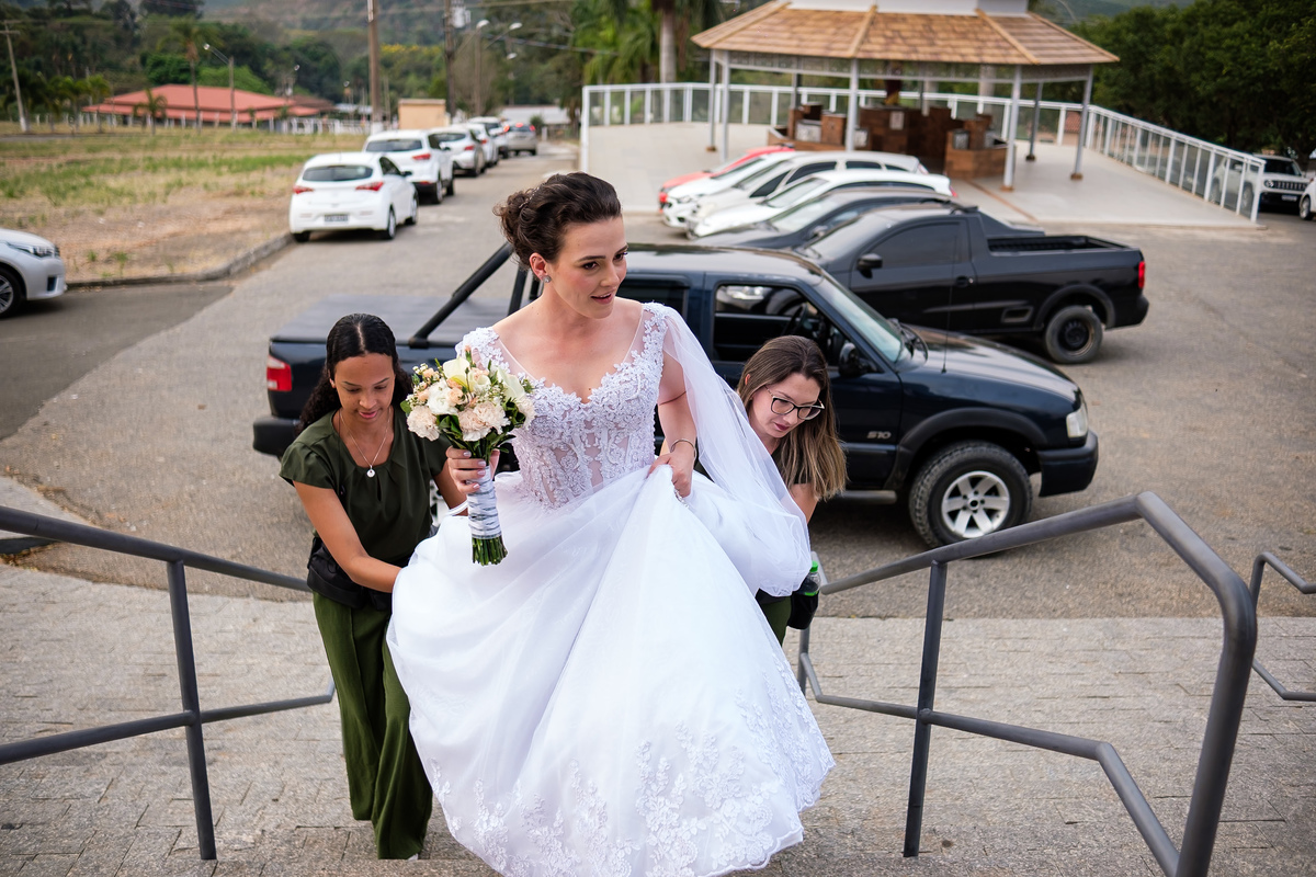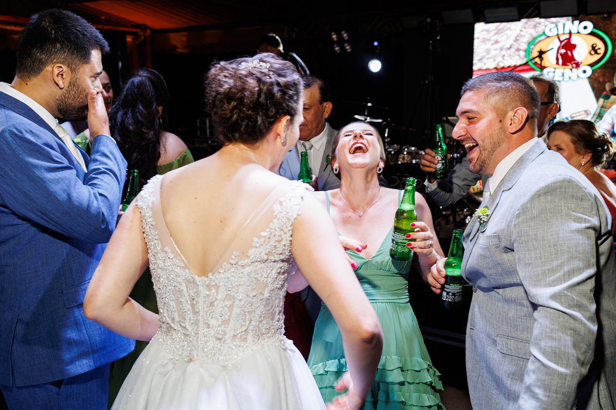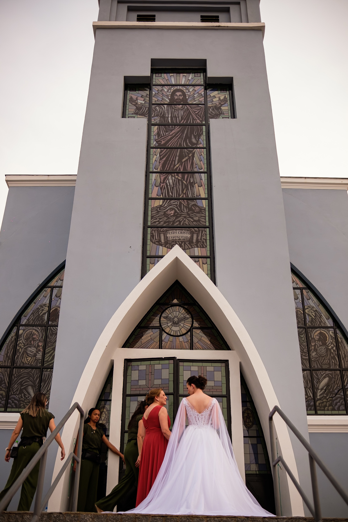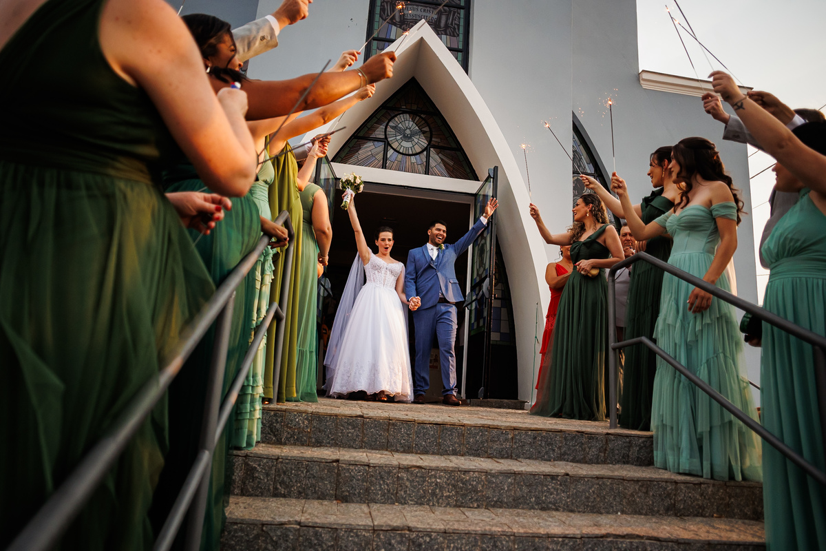 Após a cerimônia, fizemos um ensaio dos recém-casados na própria igreja, aproveitando o ambiente ainda repleto de emoção. Enquanto isso, os convidados se dirigiam ao Tuia Véia, onde a festa já prometia ser animada.