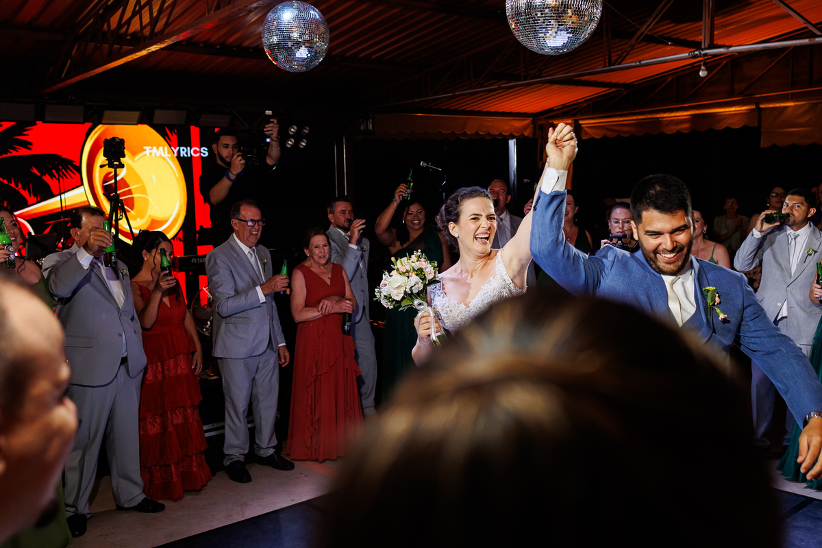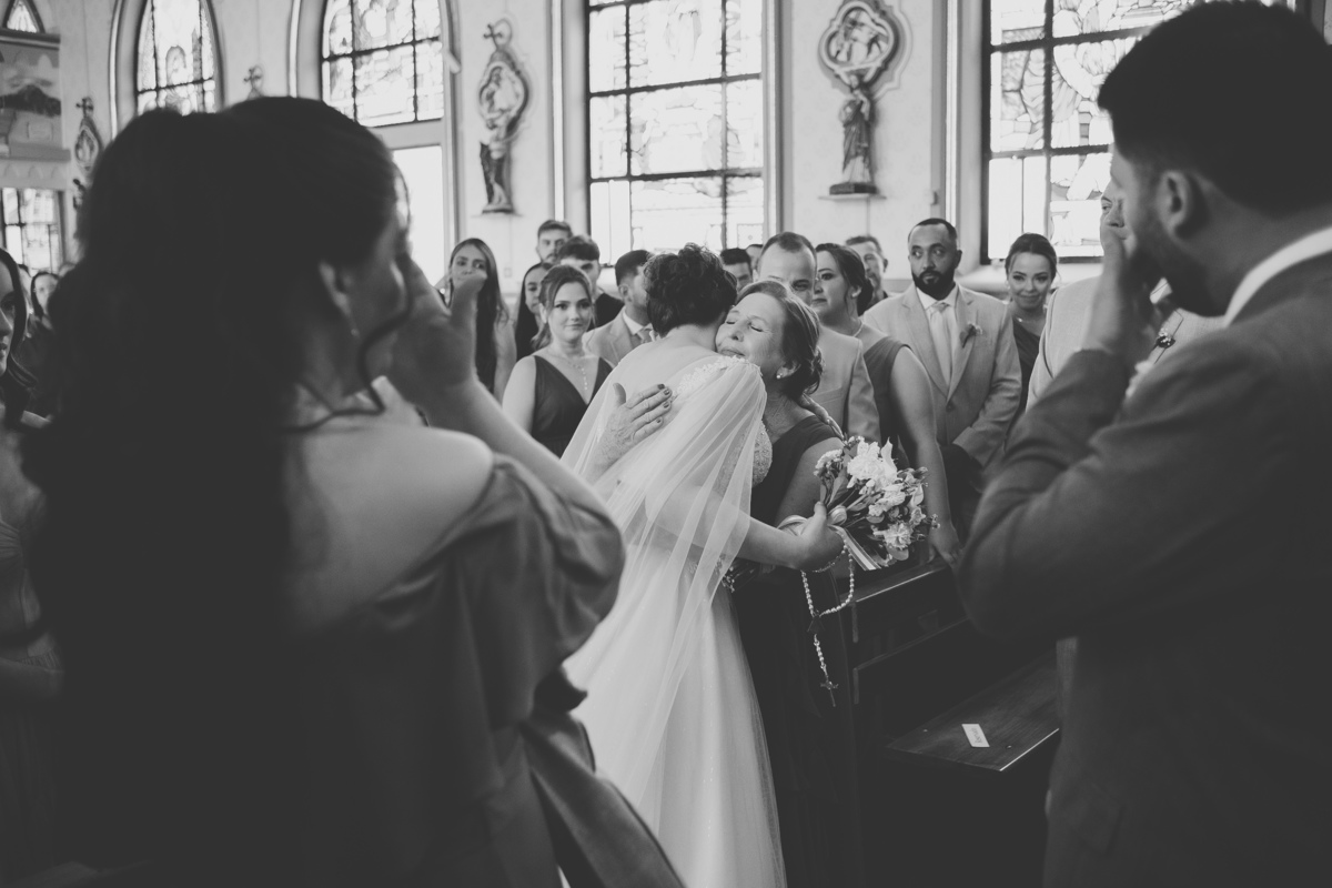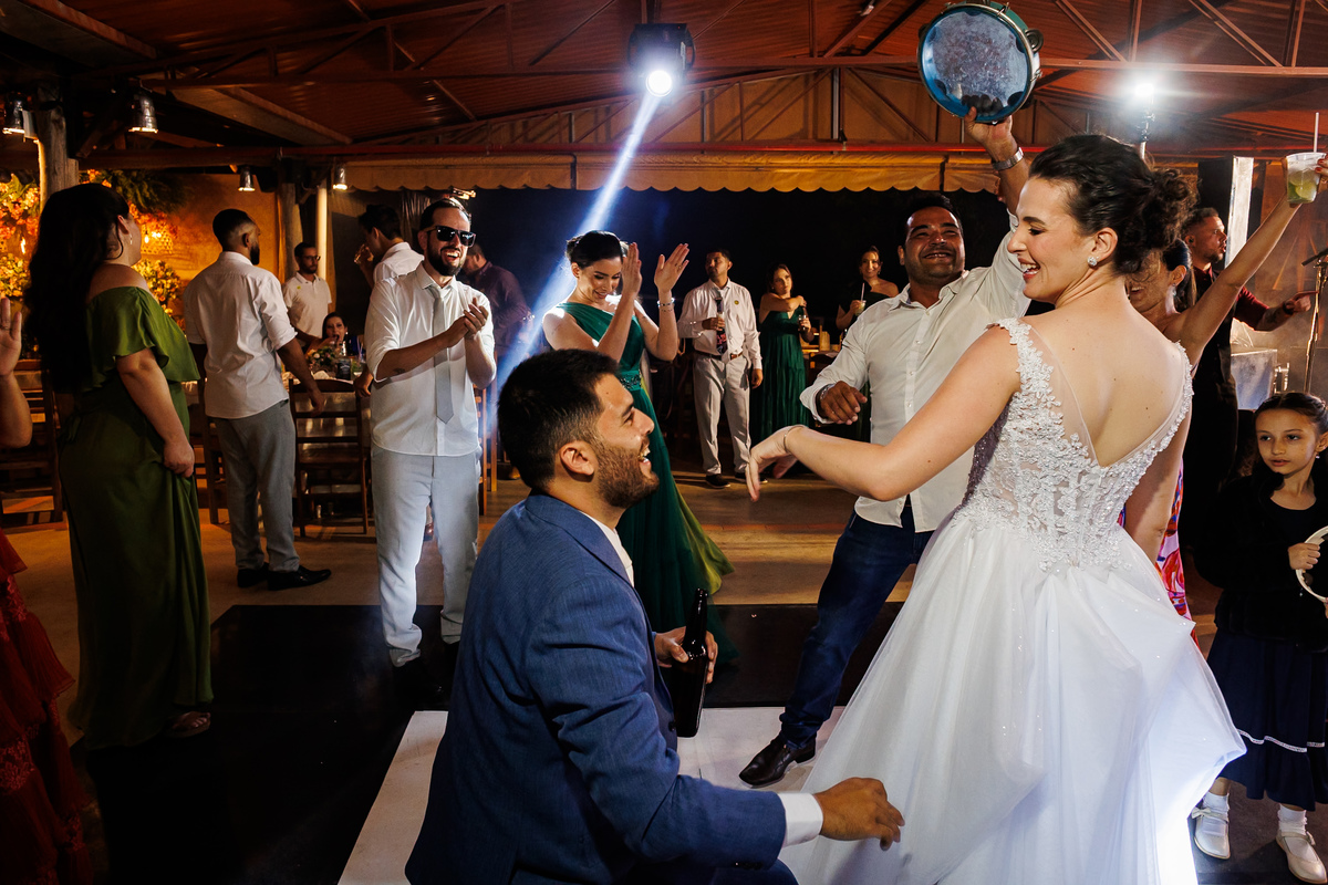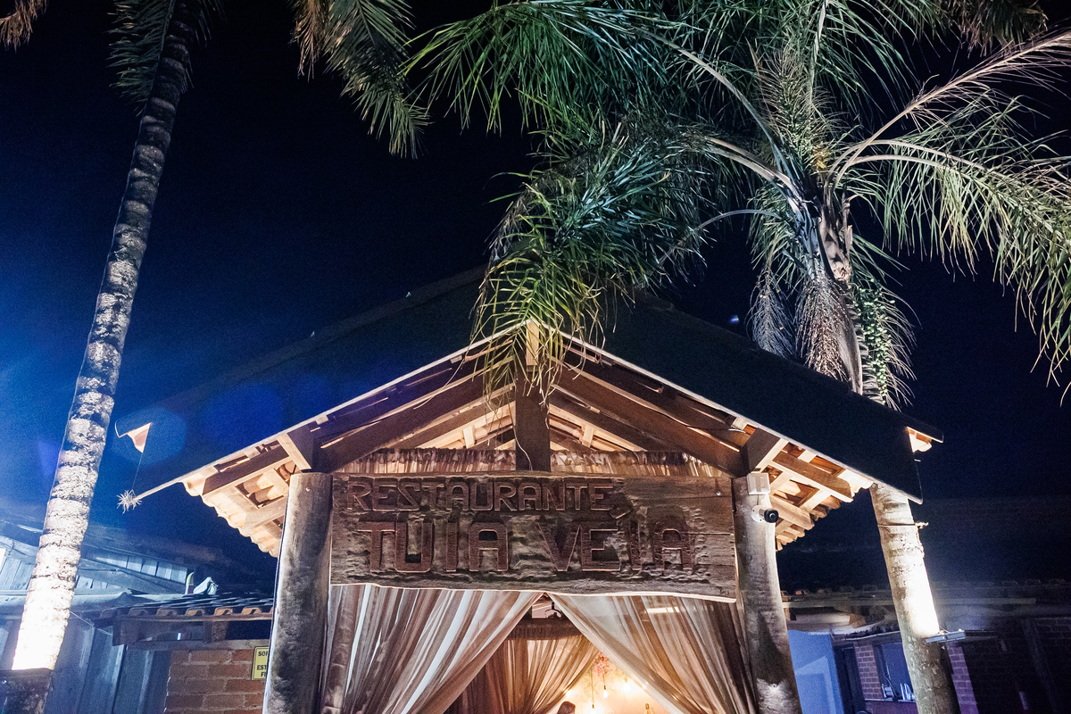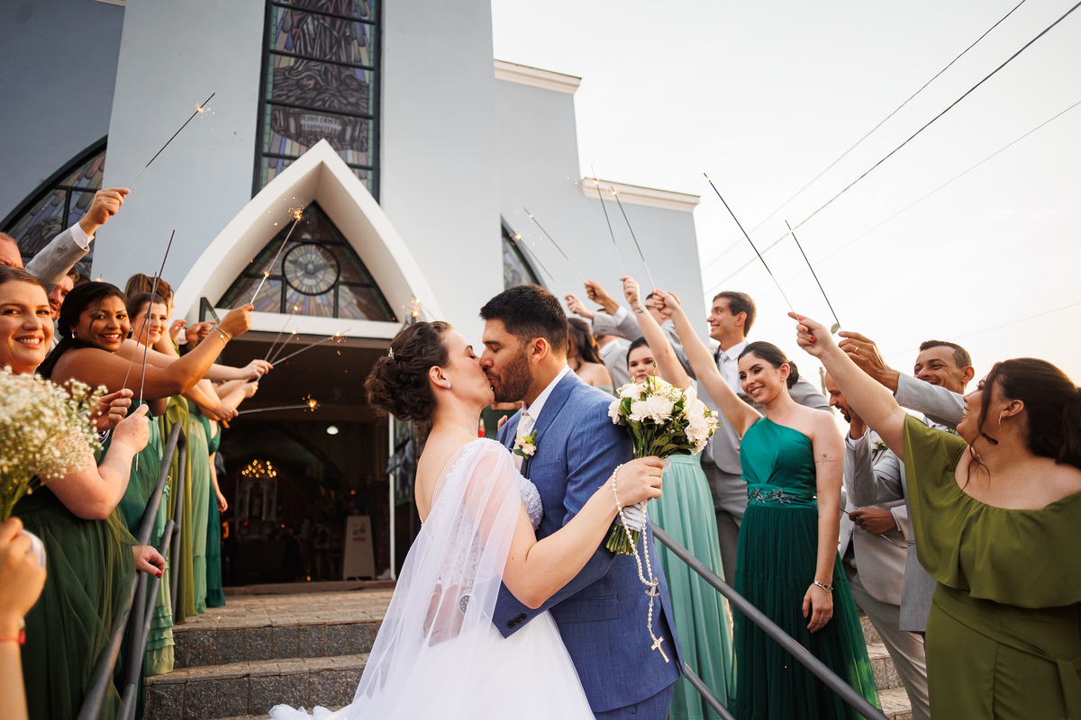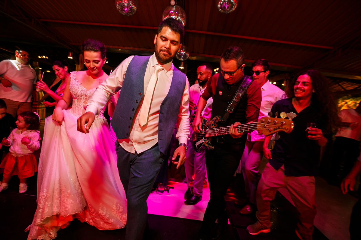 Após a cerimônia, fizemos um ensaio dos recém-casados na própria igreja, aproveitando o ambiente ainda repleto de emoção. Enquanto isso, os convidados se dirigiam ao Tuia Véia, onde a festa já prometia ser animada.