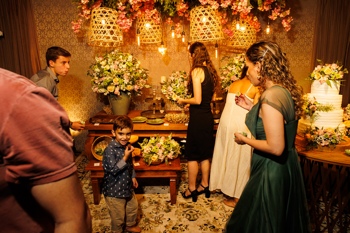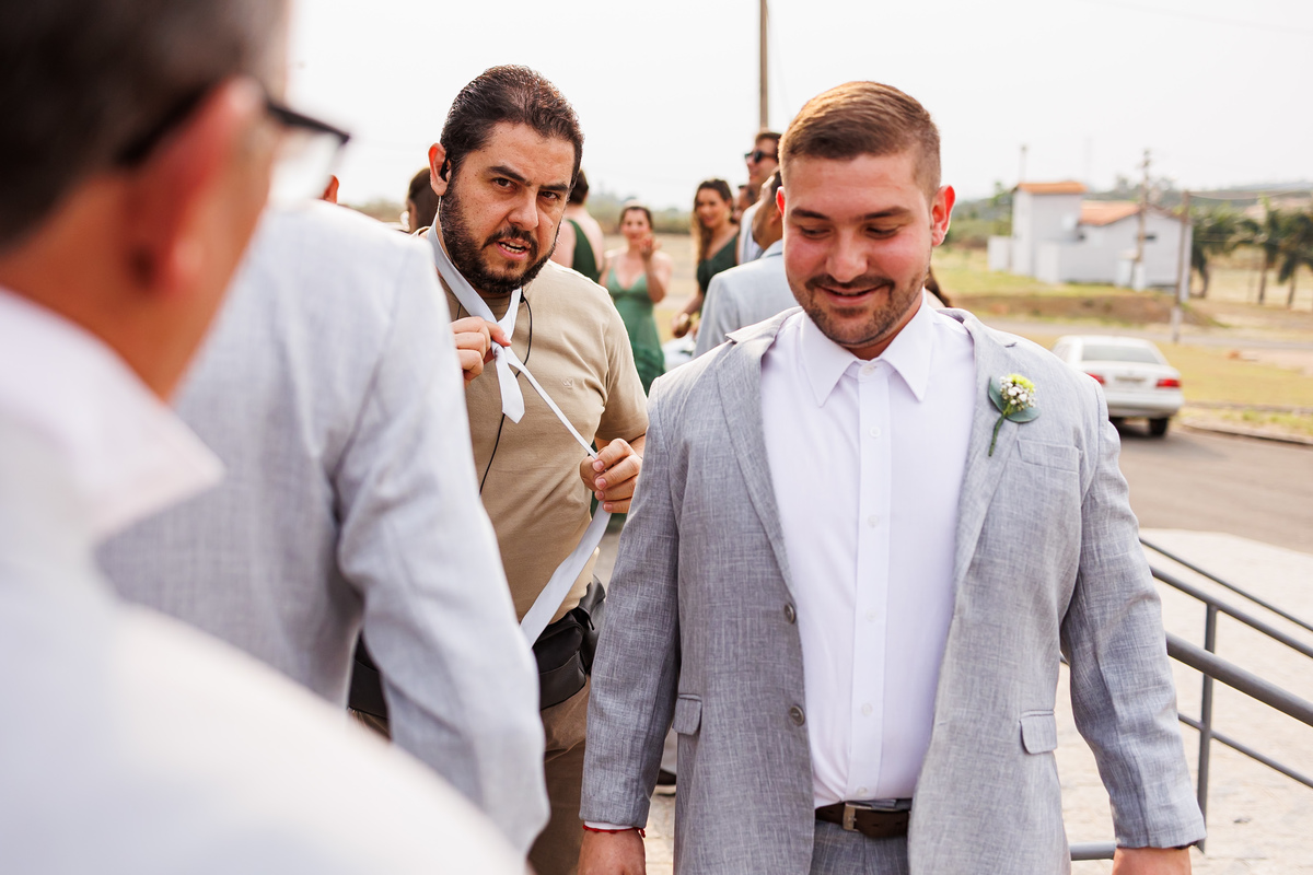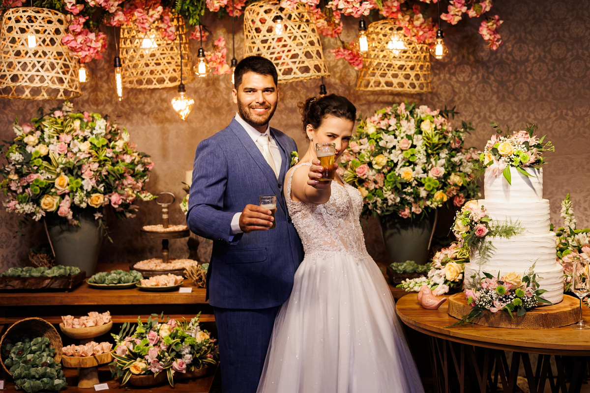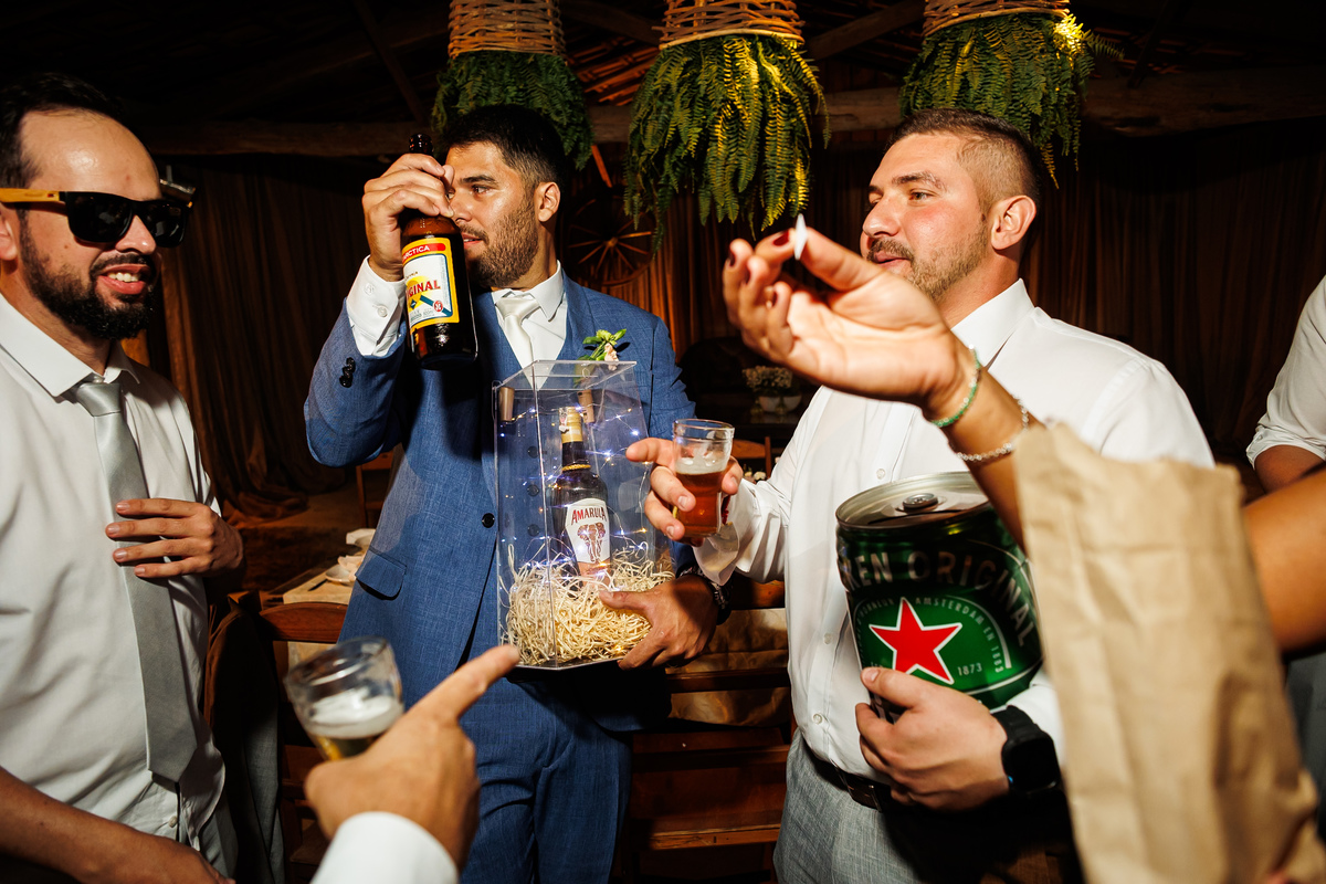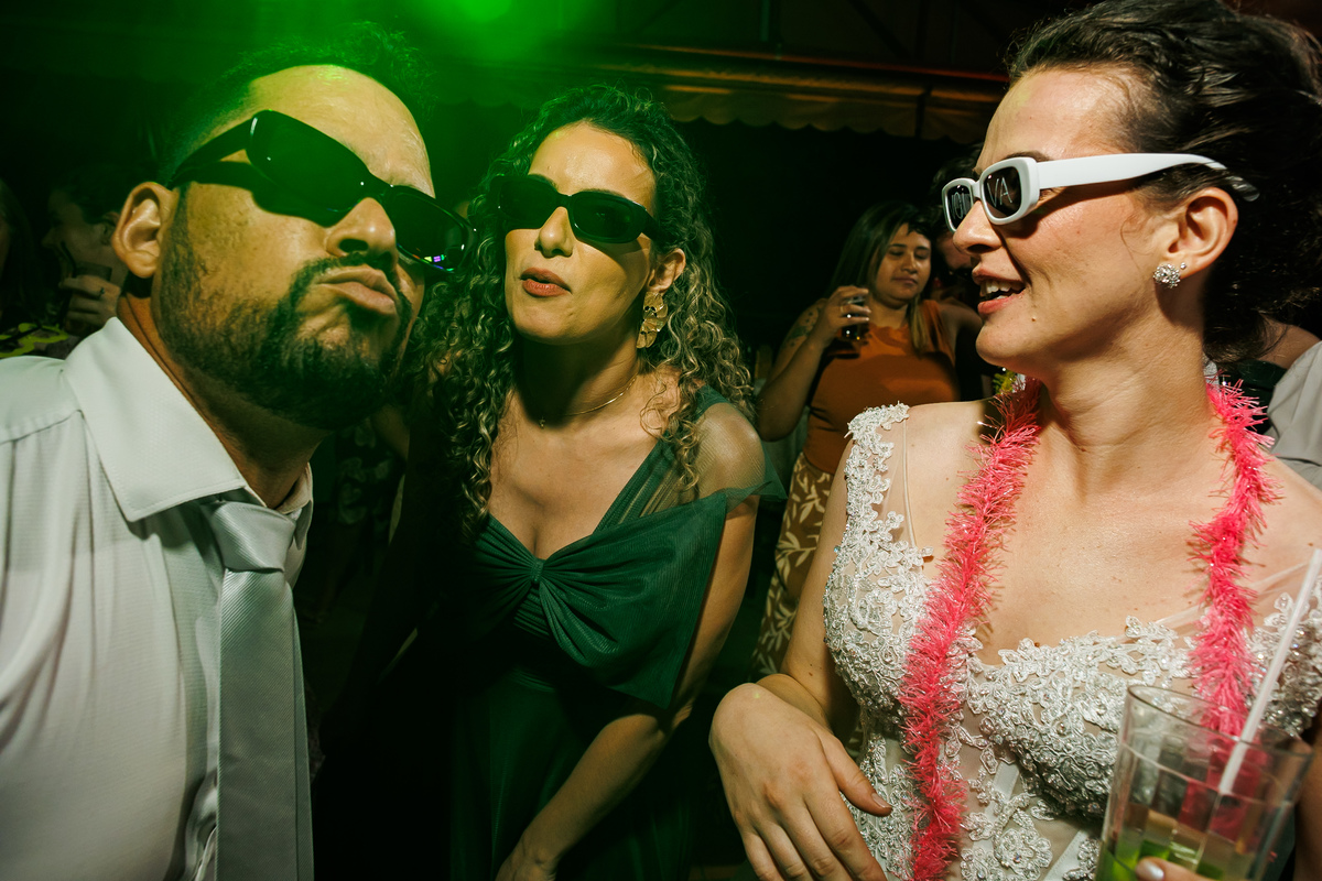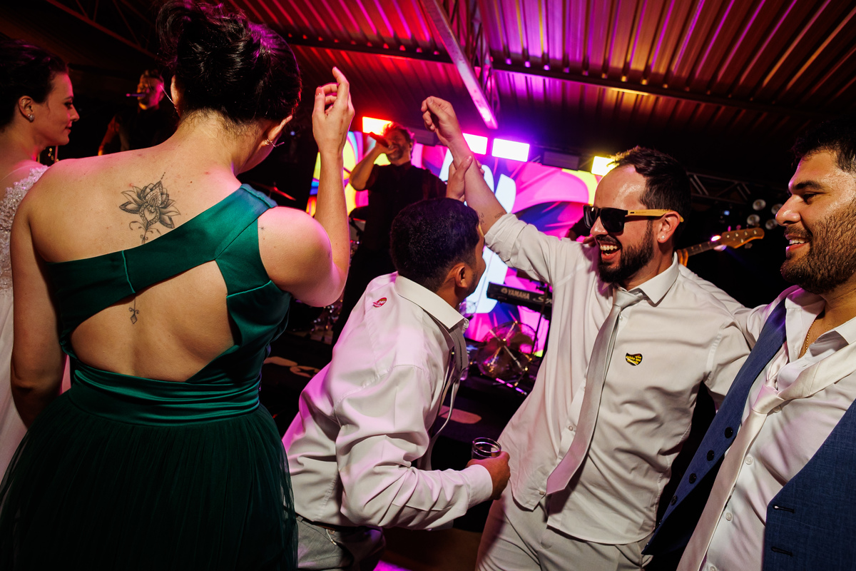 Após a cerimônia, fizemos um ensaio dos recém-casados na própria igreja, aproveitando o ambiente ainda repleto de emoção. Enquanto isso, os convidados se dirigiam ao Tuia Véia, onde a festa já prometia ser animada.