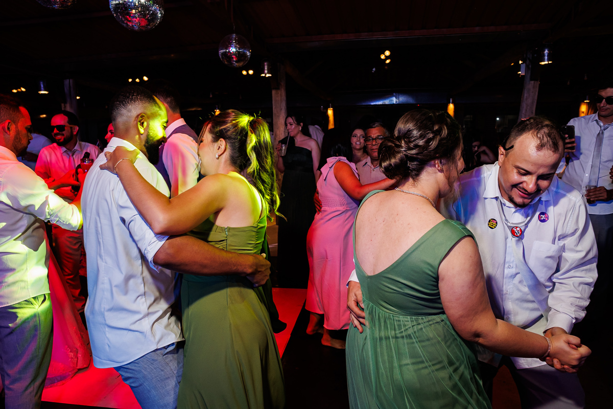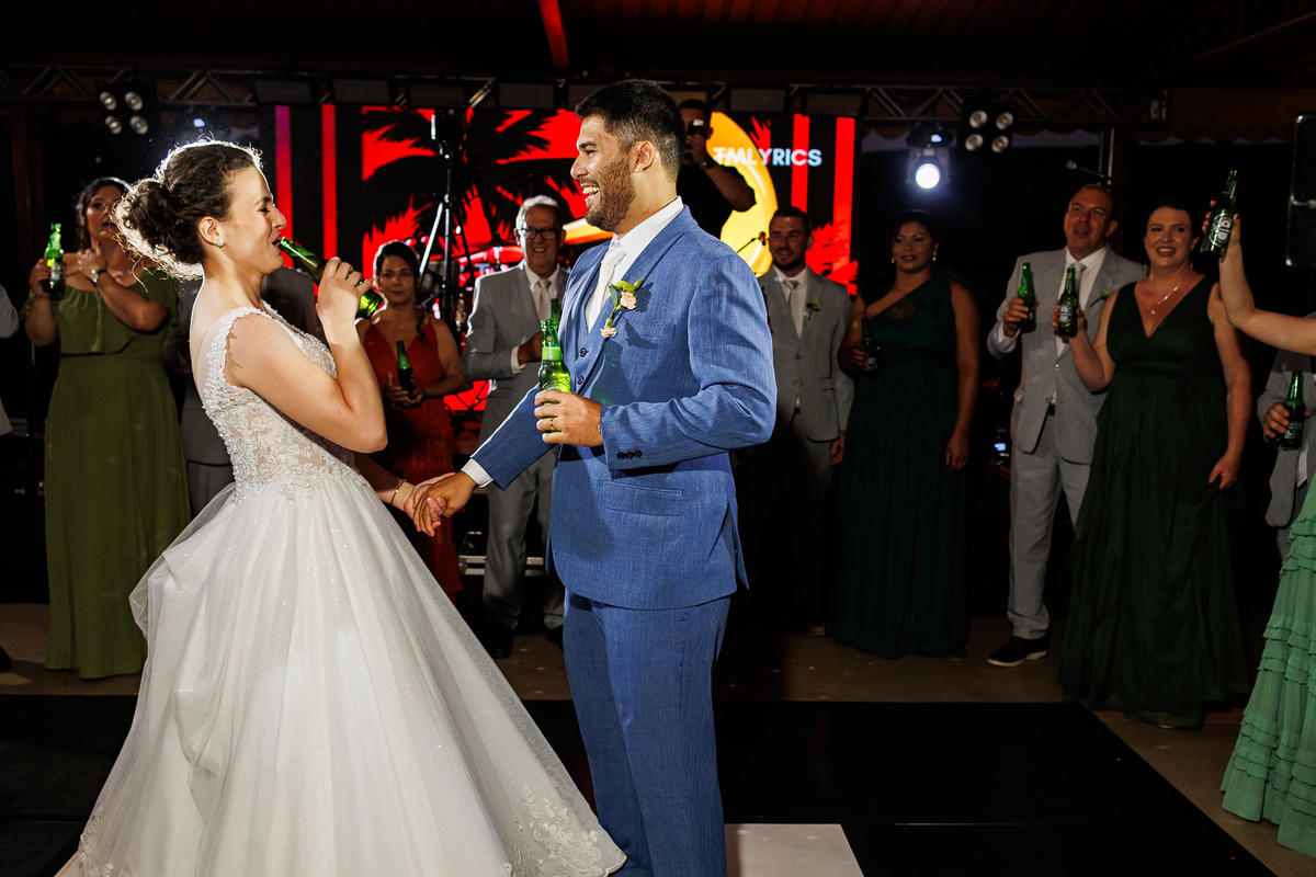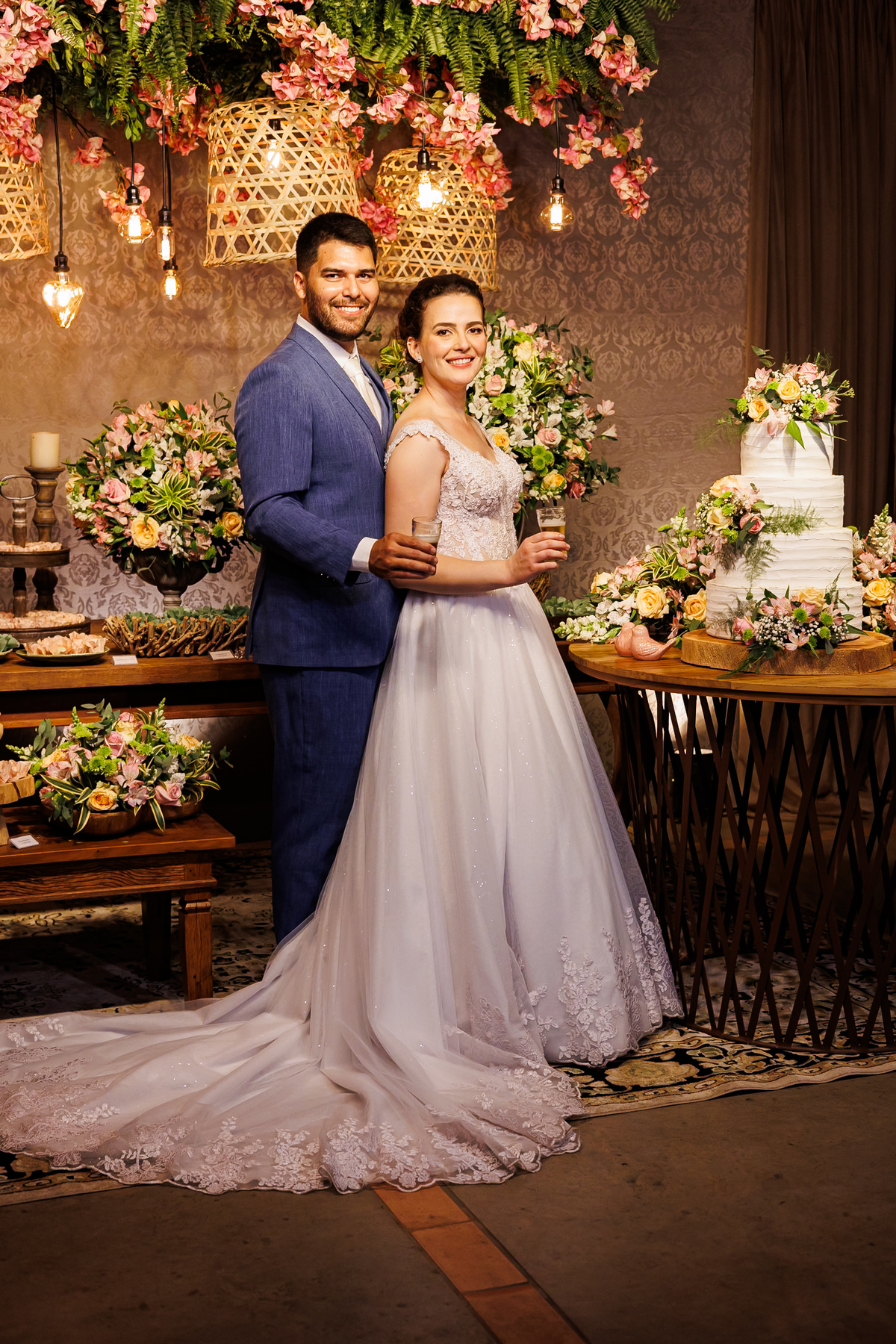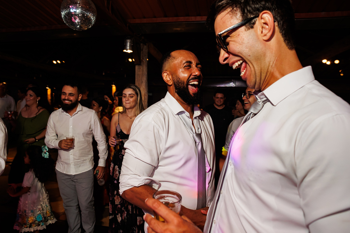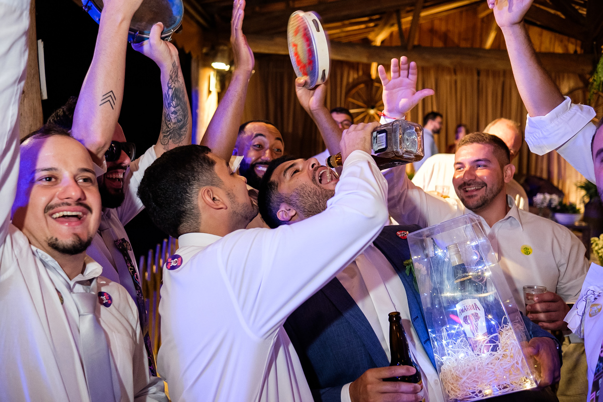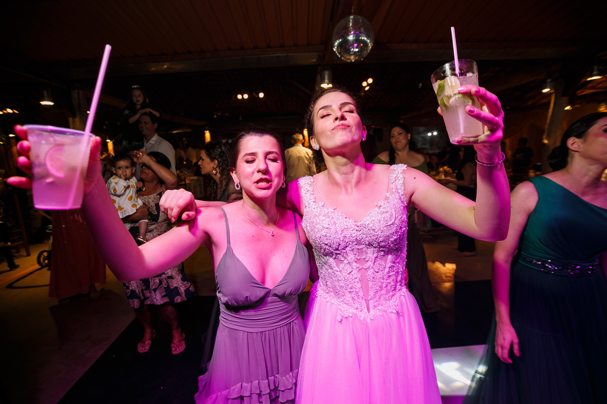 Após a cerimônia, fizemos um ensaio dos recém-casados na própria igreja, aproveitando o ambiente ainda repleto de emoção. Enquanto isso, os convidados se dirigiam ao Tuia Véia, onde a festa já prometia ser animada.