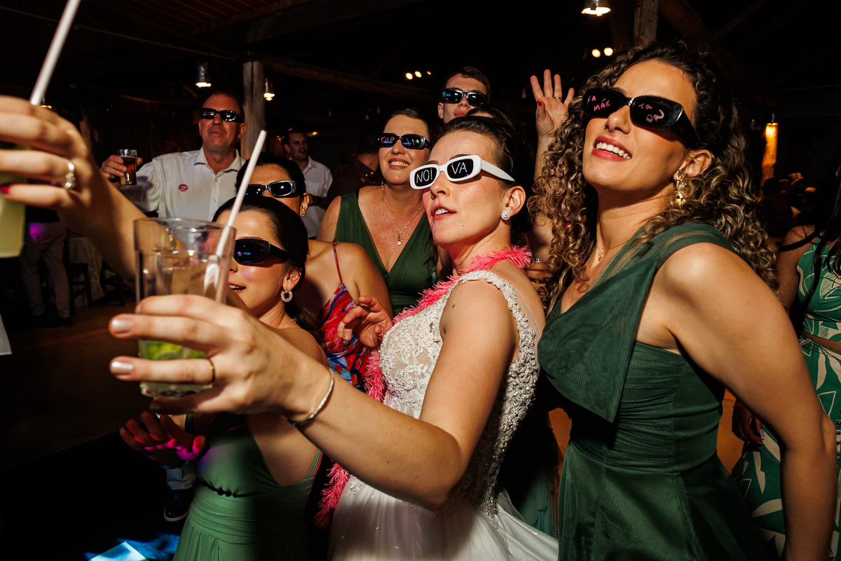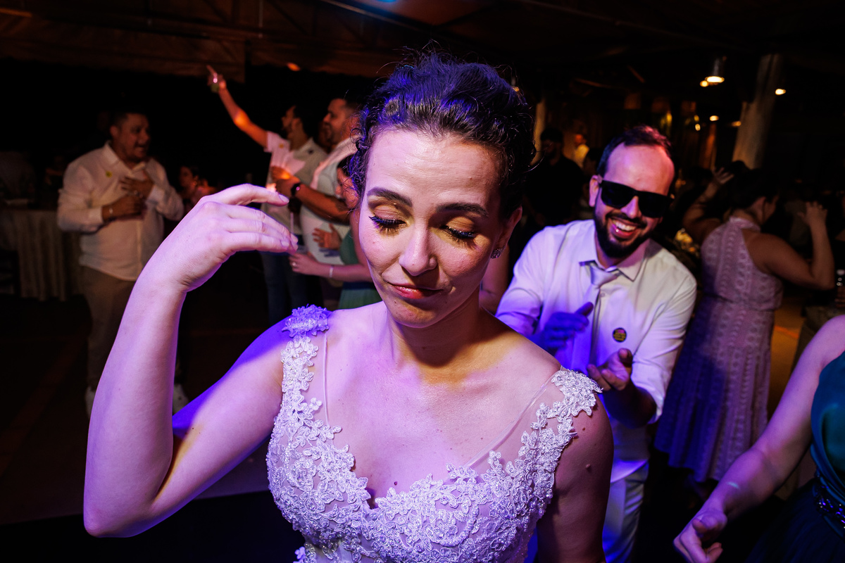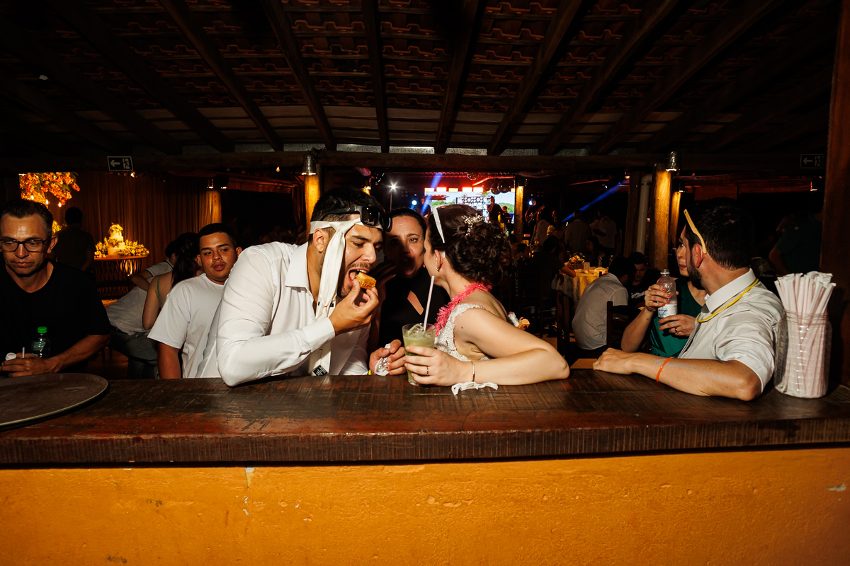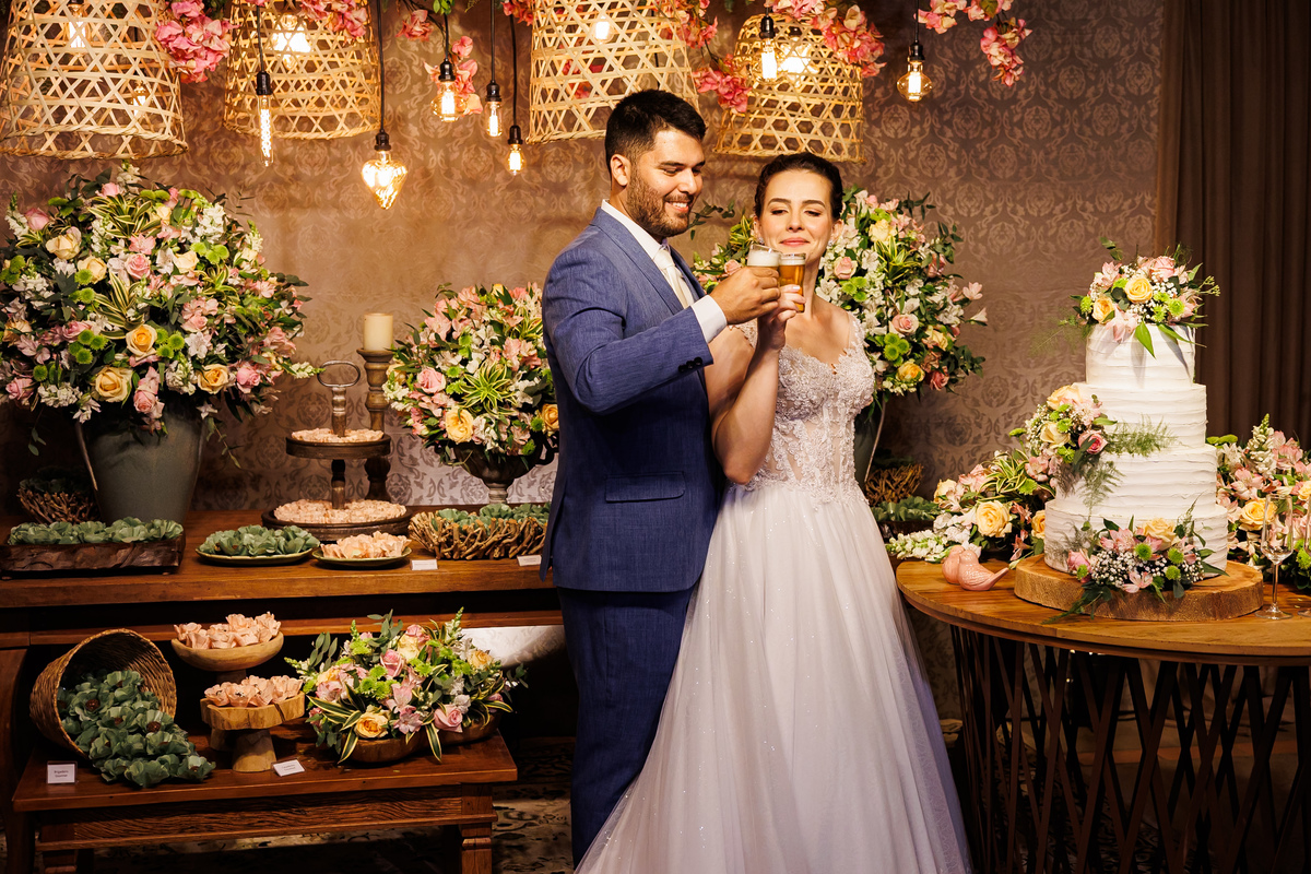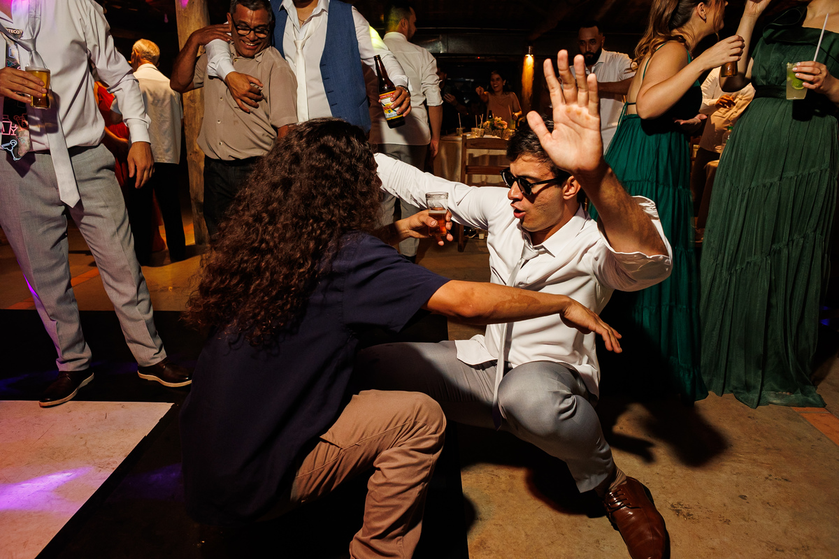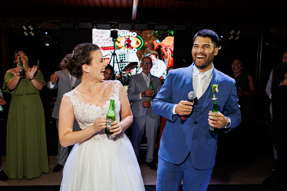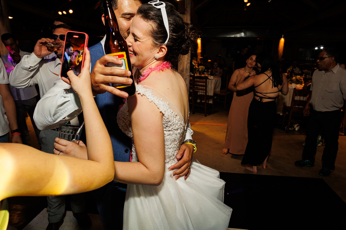 Após a cerimônia, fizemos um ensaio dos recém-casados na própria igreja, aproveitando o ambiente ainda repleto de emoção. Enquanto isso, os convidados se dirigiam ao Tuia Véia, onde a festa já prometia ser animada.