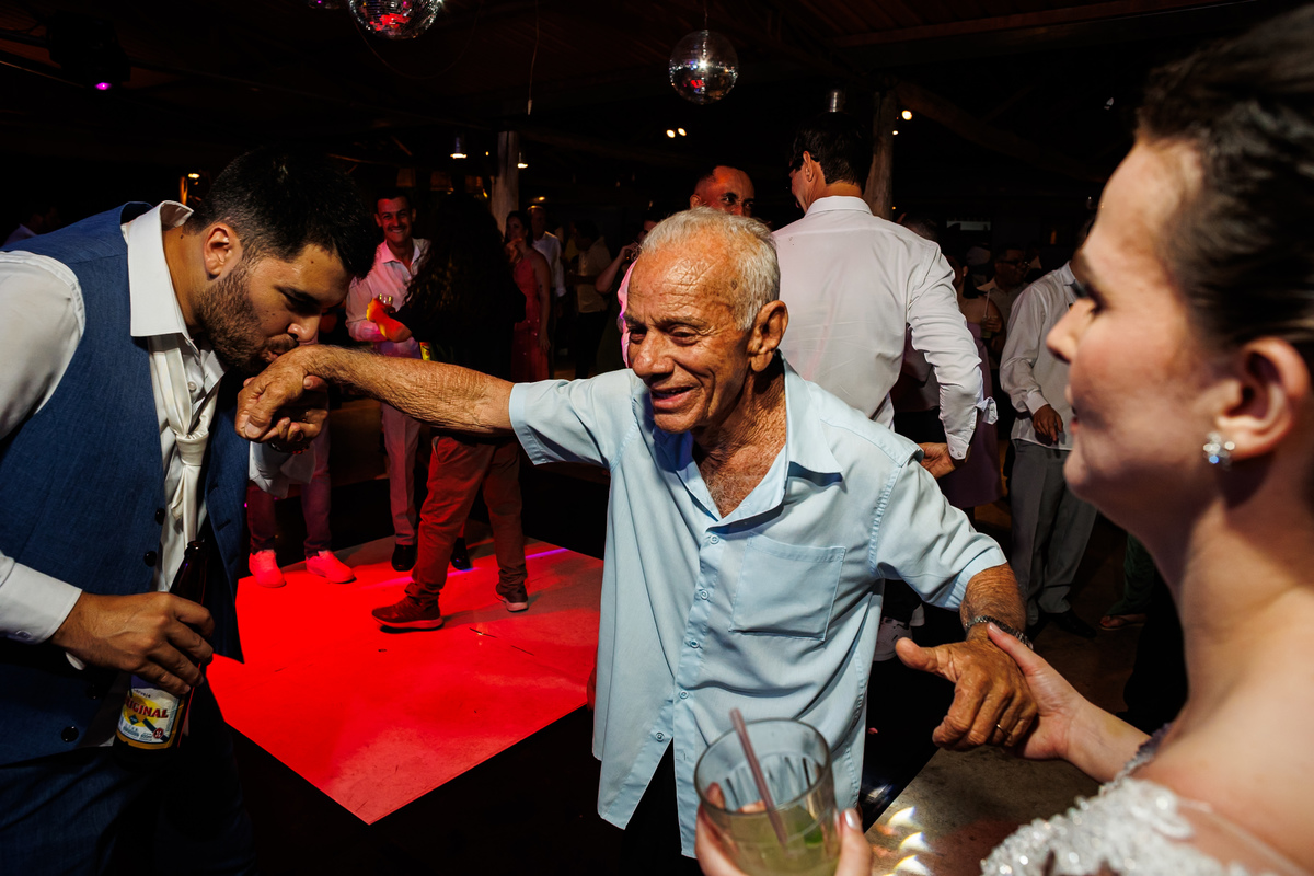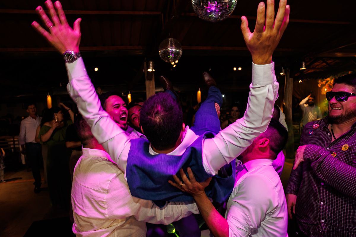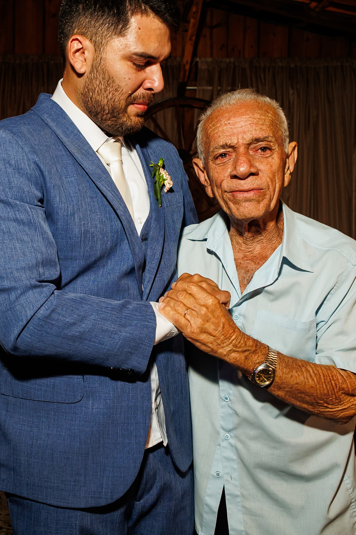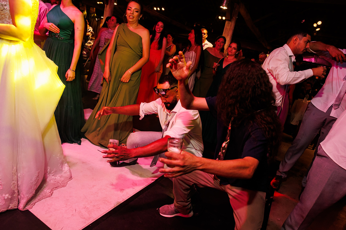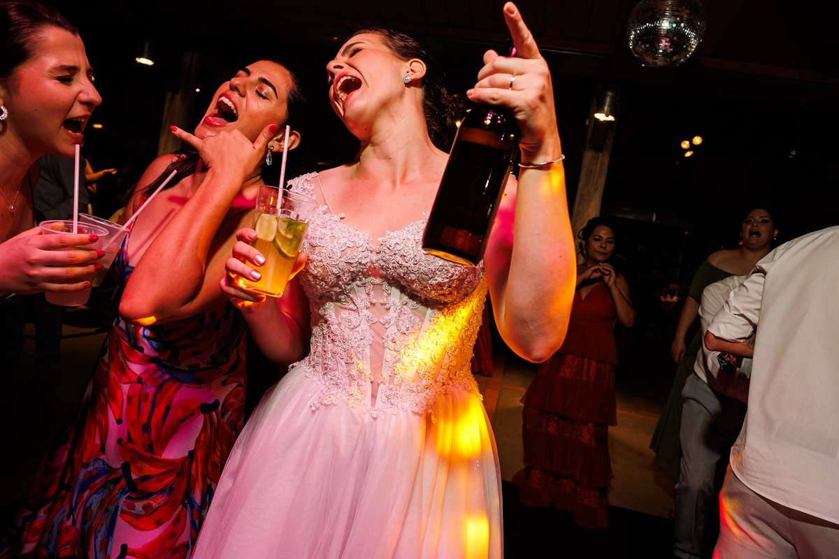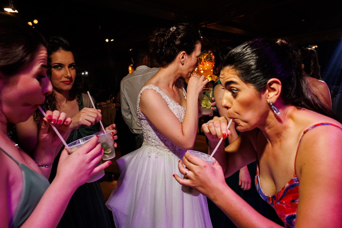 Após a cerimônia, fizemos um ensaio dos recém-casados na própria igreja, aproveitando o ambiente ainda repleto de emoção. Enquanto isso, os convidados se dirigiam ao Tuia Véia, onde a festa já prometia ser animada.
