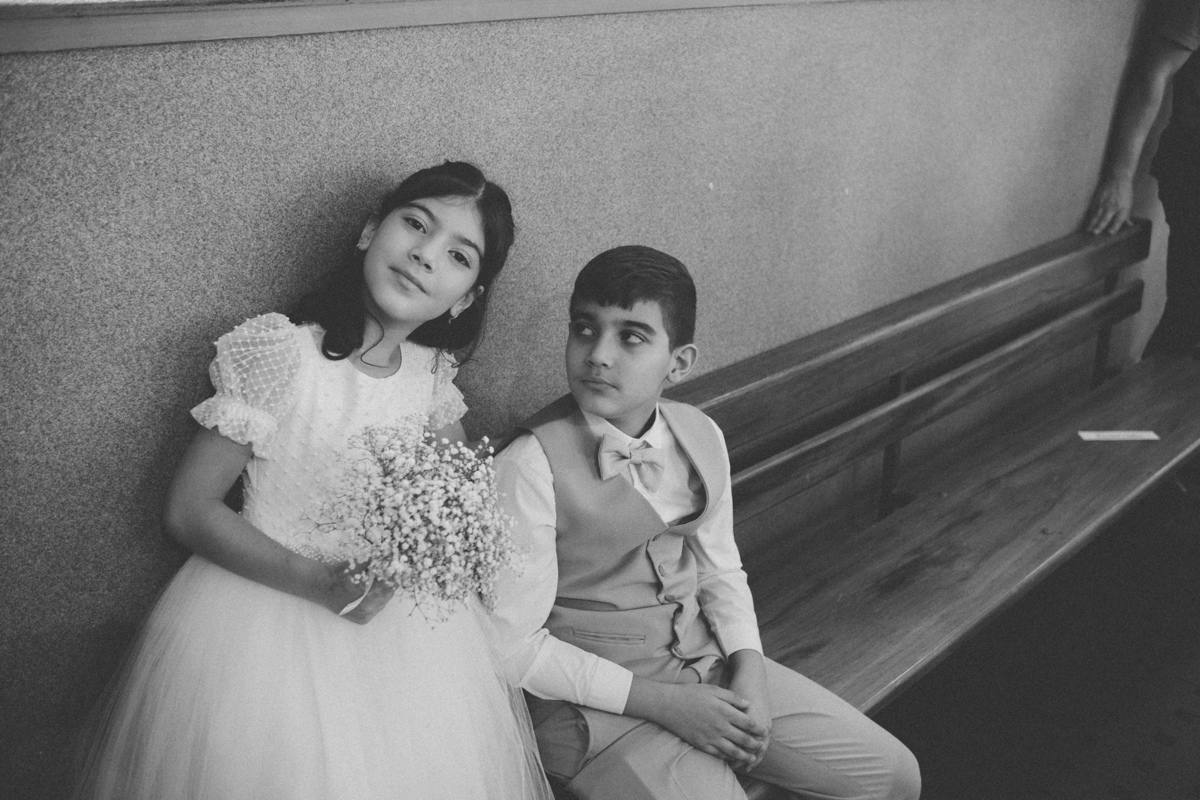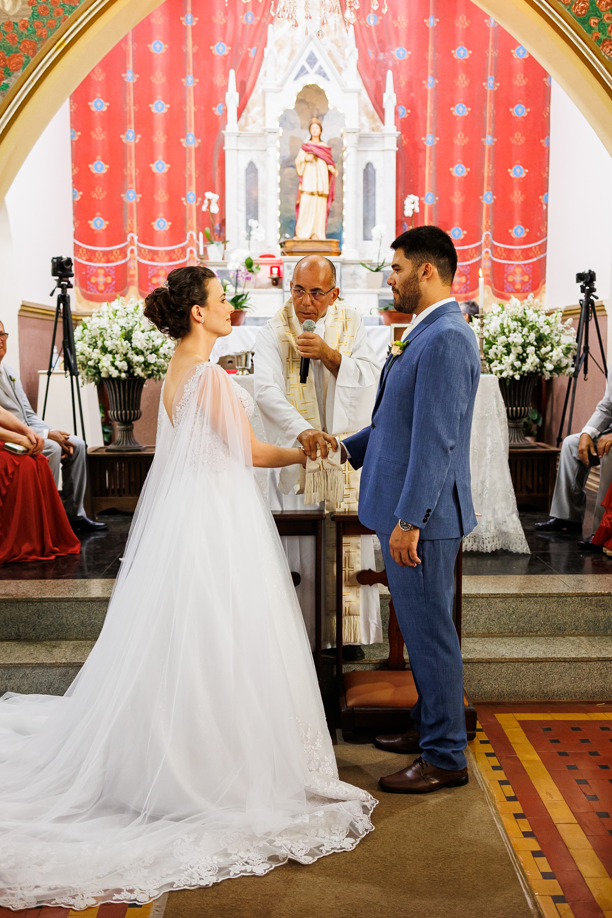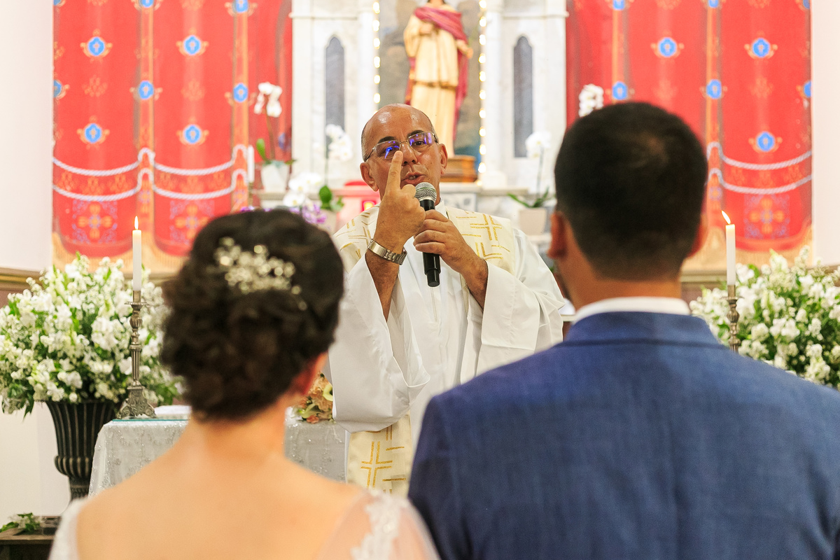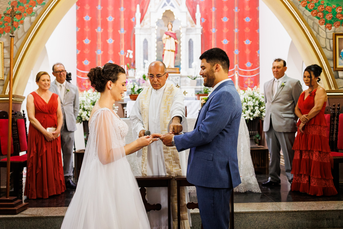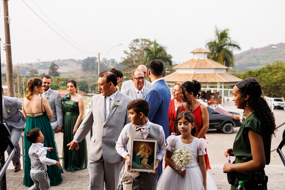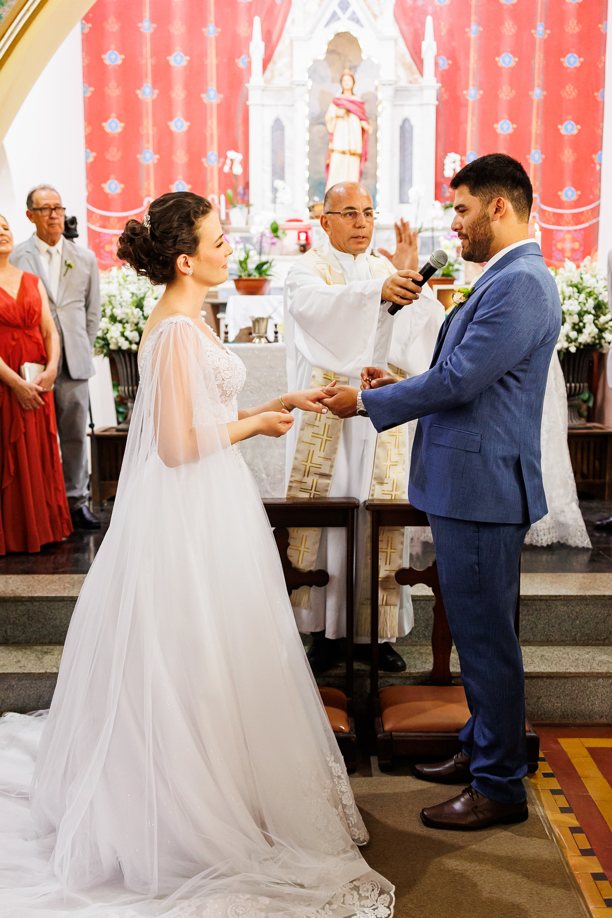 A cerimônia foi de uma beleza única. As entradas foram cuidadosas e cheias de significado, mas a entrada de Paula como noiva emocionou a todos. O olhar de Marcelo ao vê-la pela primeira vez naquele momento não deixou dúvidas do amor profundo que os unia. O Pe. Adilson conduziu a cerimônia com sua habitual energia e palavras tocantes, mantendo a atmosfera animada e participativa. As crianças presentes foram uma atração à parte, arrancando risadas com suas espontaneidades.
