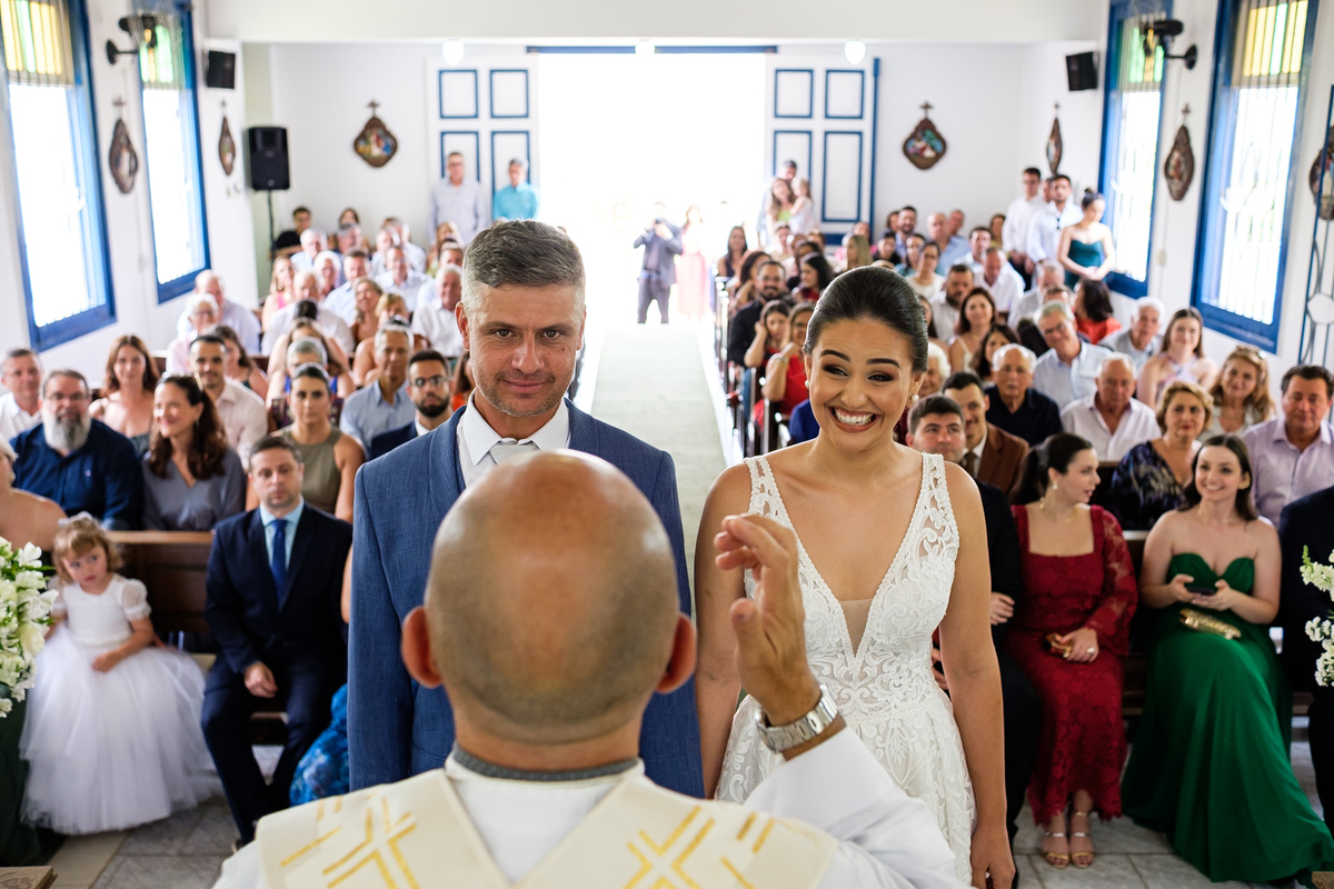 A cerimônia aconteceu na encantadora Igreja de Santa Terezinha, um lugar cheio de charme e aconchego, conhecido por suas portas e janelas azuis que dão um toque quase mágico ao cenário. O Padre Adilson, com sua alegria característica, trouxe leveza e emoção ao momento, conduzindo cada palavra de forma a tocar os corações de todos os presentes. Ao ver Marina entrando, ao som suave dos sentimentos, enquanto Tiago, emocionado, aguardava sua amada no altar.