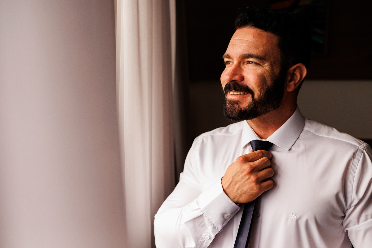 Enquanto isso, no mesmo hotel, o Douglas também se preparava. O making dele foi bonito, tranquilo, cheio de significado.