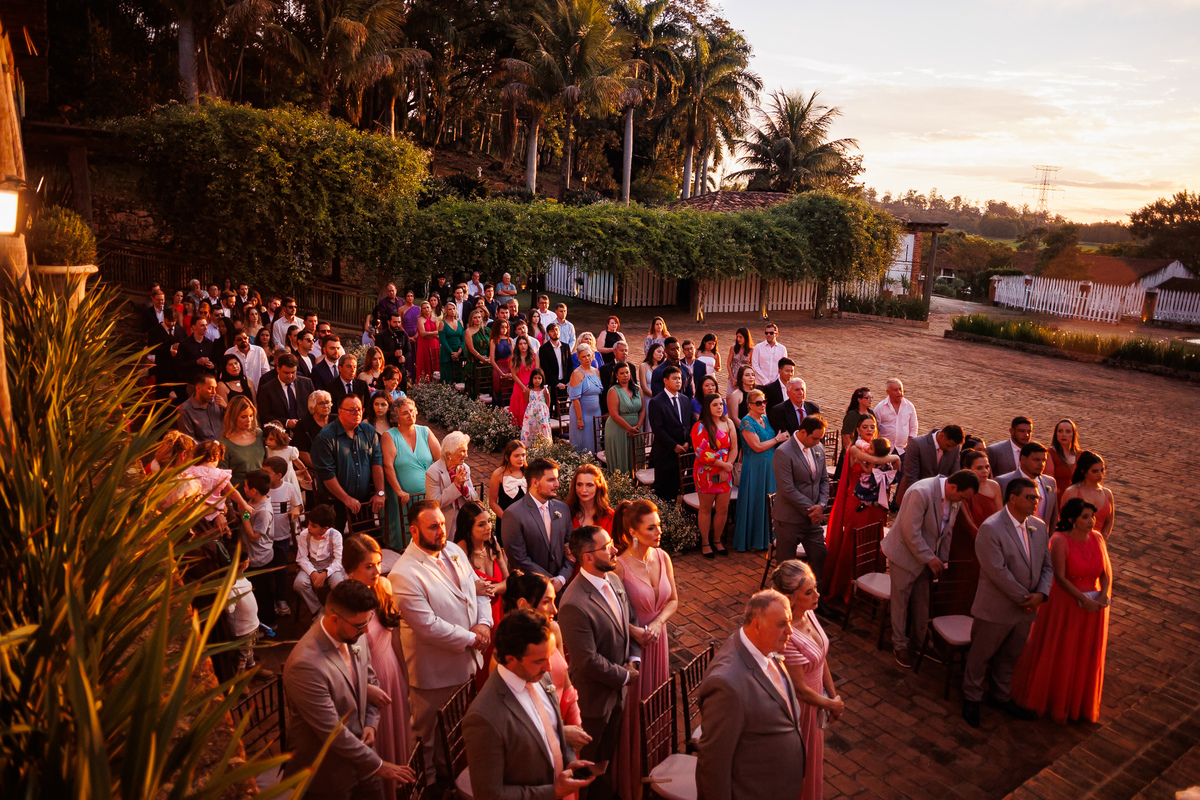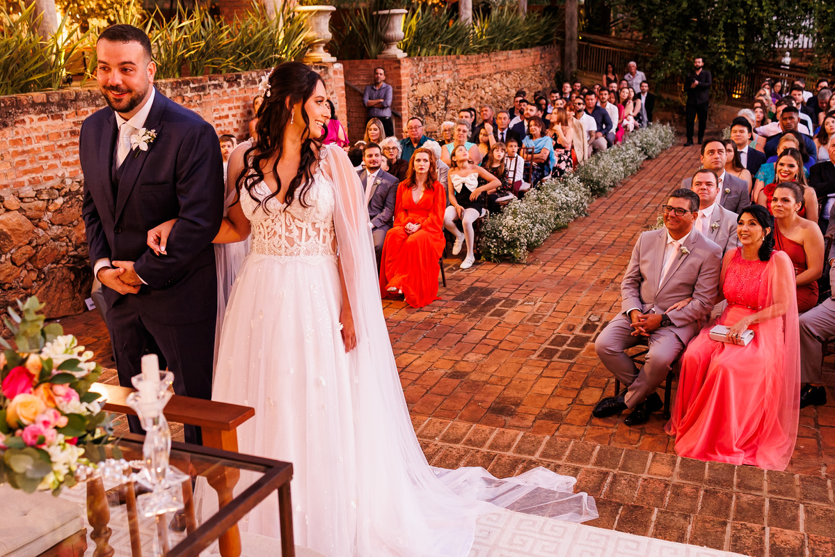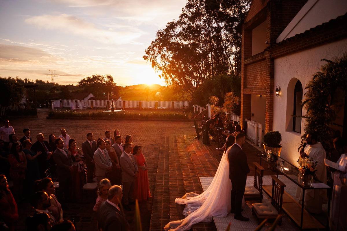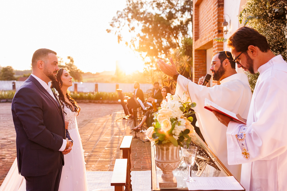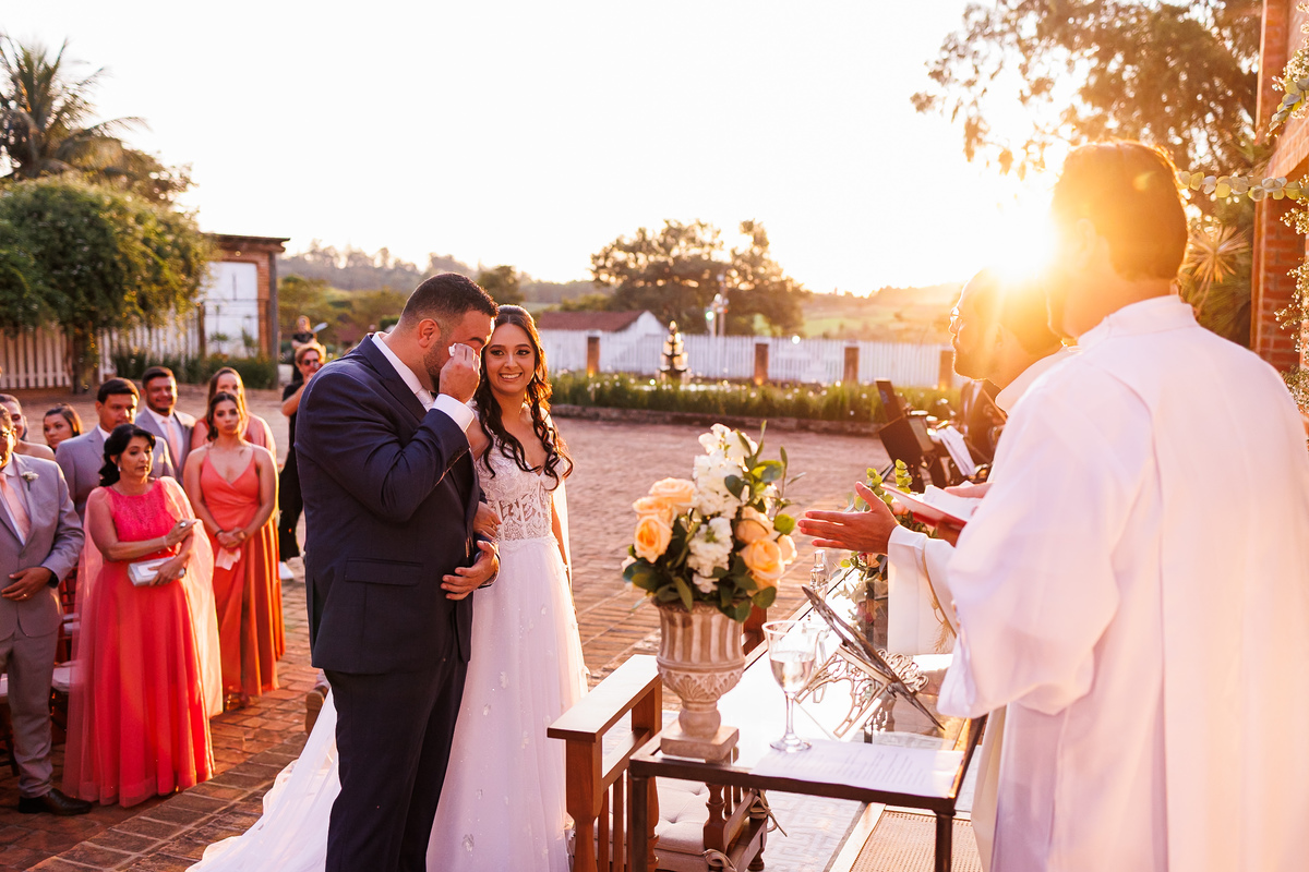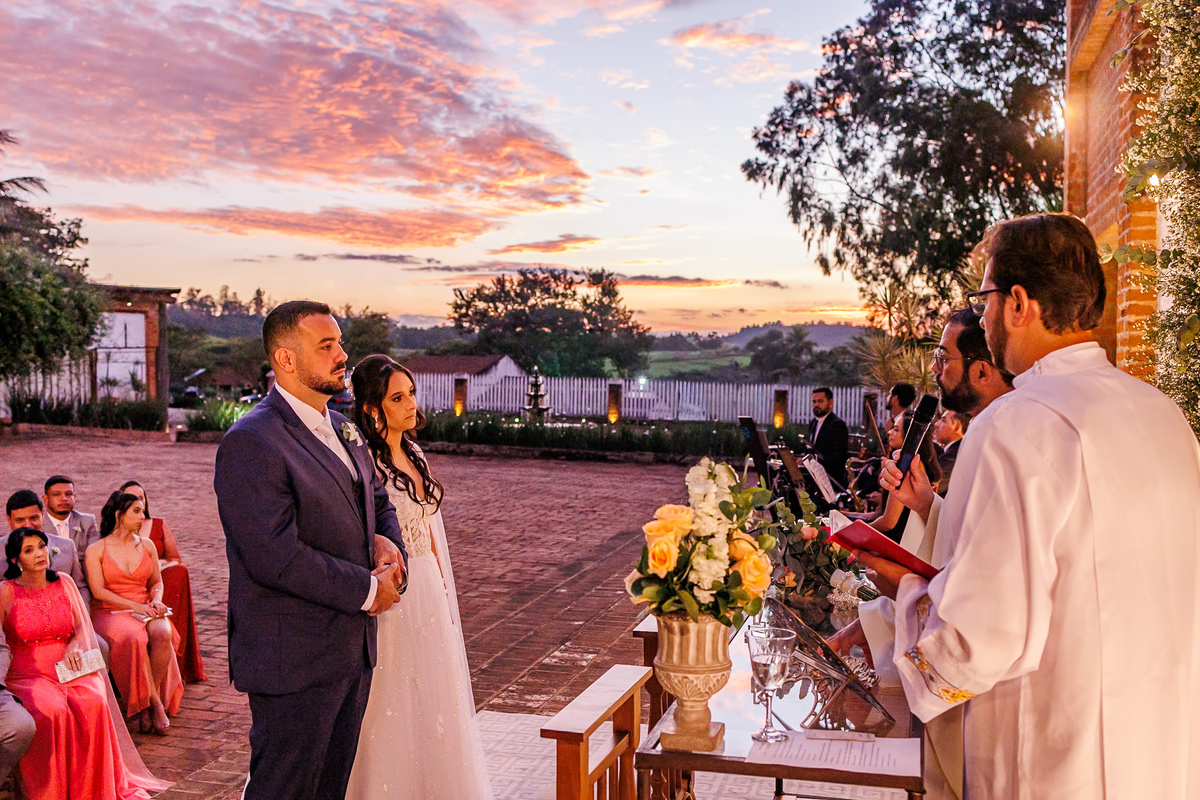 A cerimônia na Fazenda Casarão São Bento foi emocionante do começo ao fim. Não teve quem não se arrepiou. As palavras, os olhares, as mãos que se encontravam o tempo todo. E como se o dia tivesse combinado com eles, o pôr do sol apareceu no momento certo. O céu ganhou cores quentes, a luz ficou dourada e parecia que o tempo desacelerou só para que aquele instante fosse vivido com calma. As fotos desse momento carregam mais do que beleza. Carregam sentimento.