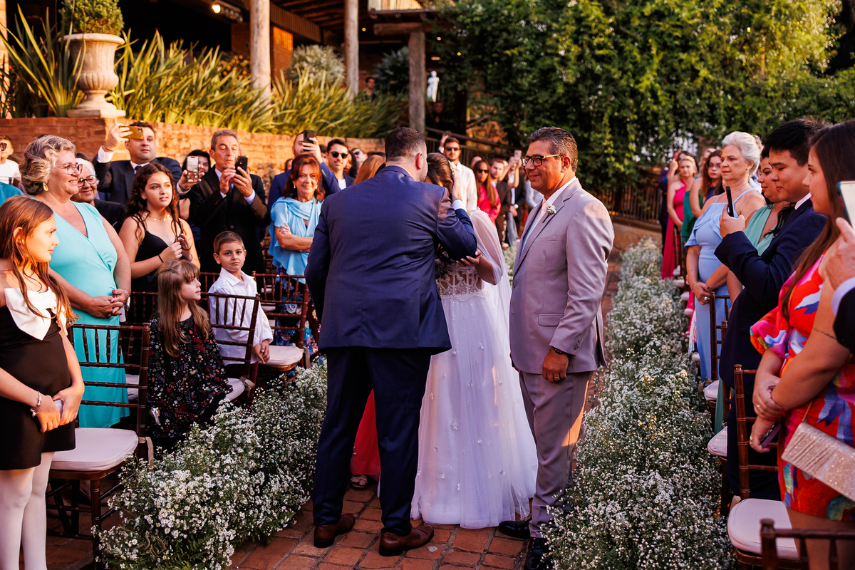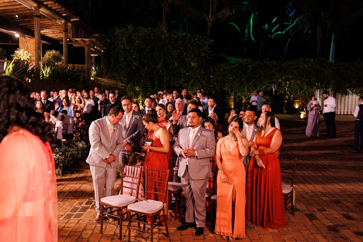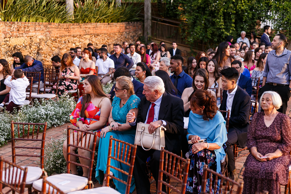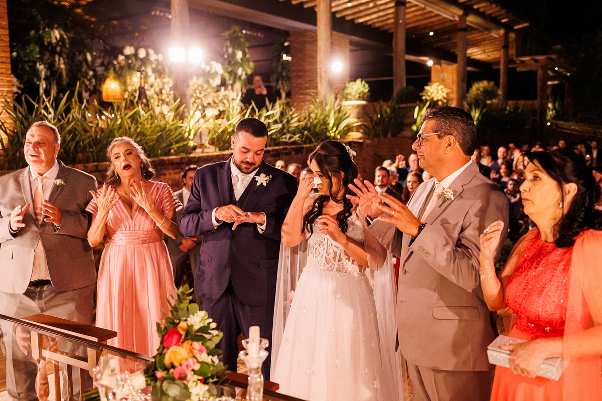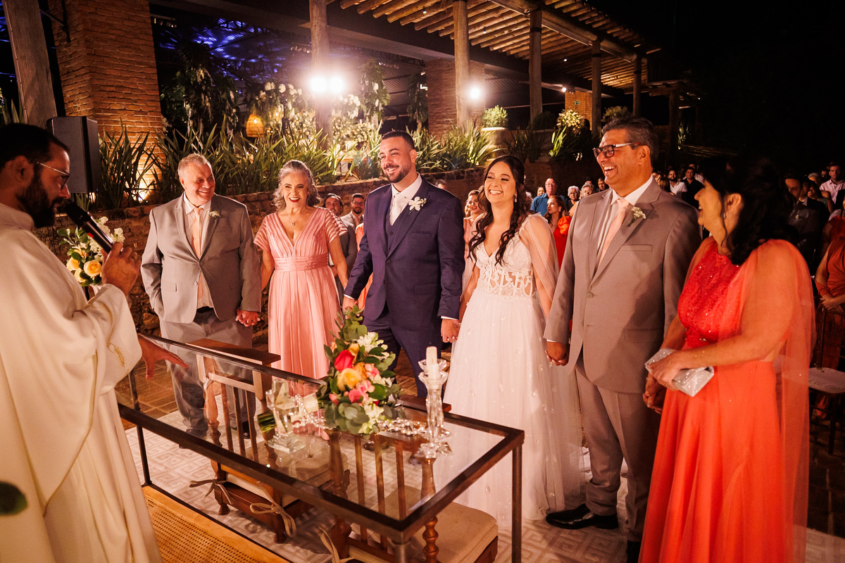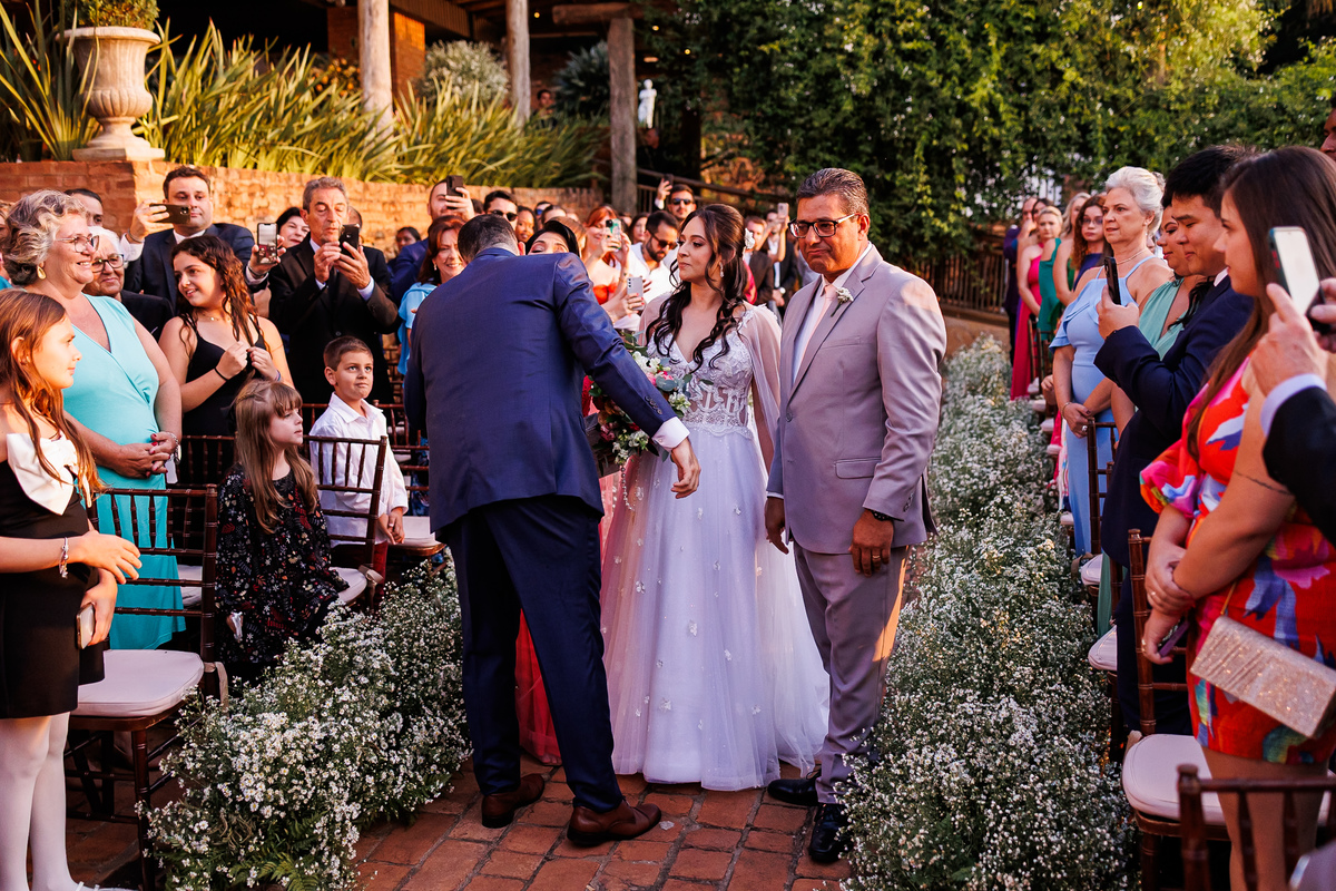 A cerimônia na Fazenda Casarão São Bento foi emocionante do começo ao fim. Não teve quem não se arrepiou. As palavras, os olhares, as mãos que se encontravam o tempo todo. E como se o dia tivesse combinado com eles, o pôr do sol apareceu no momento certo. O céu ganhou cores quentes, a luz ficou dourada e parecia que o tempo desacelerou só para que aquele instante fosse vivido com calma. As fotos desse momento carregam mais do que beleza. Carregam sentimento.