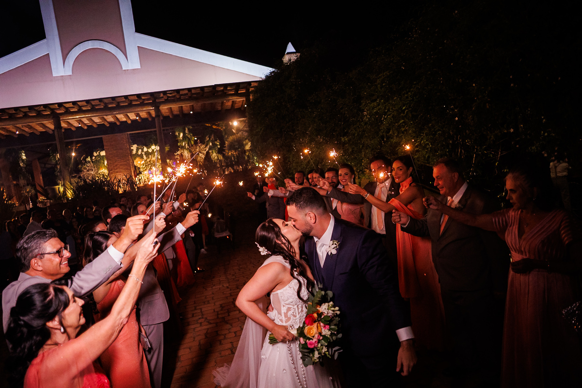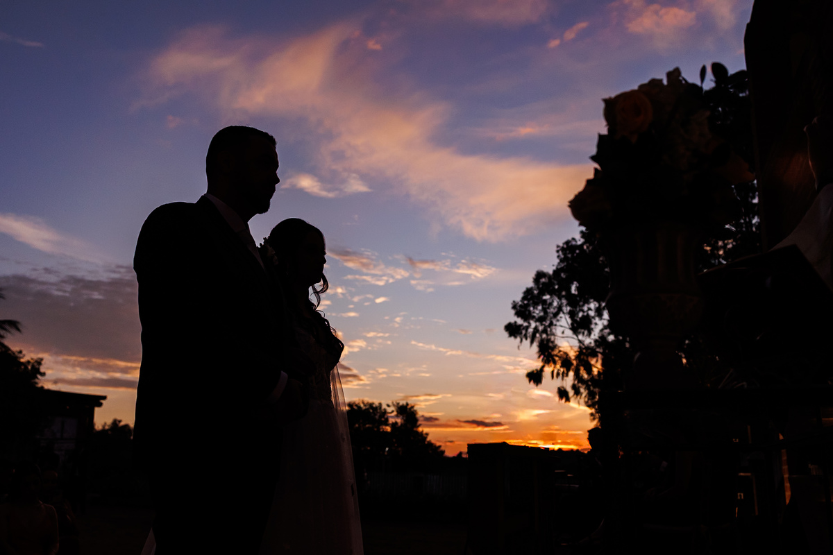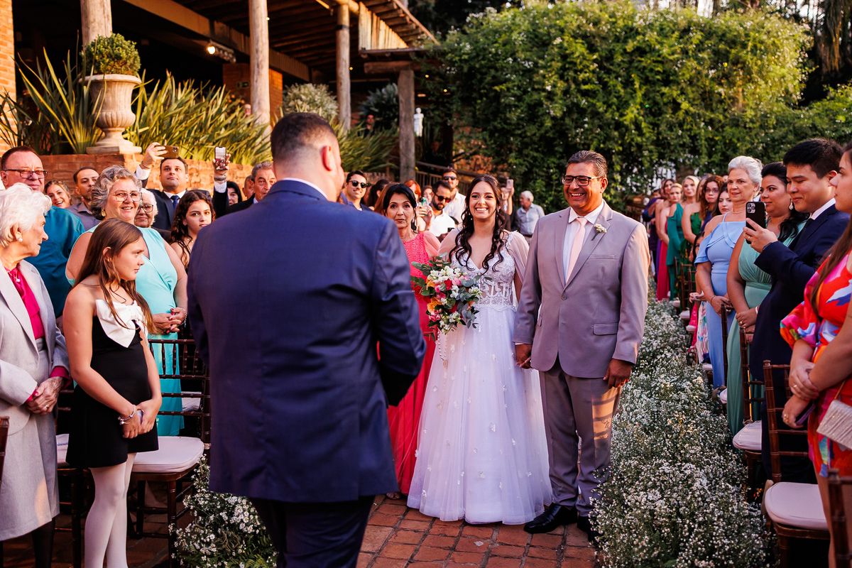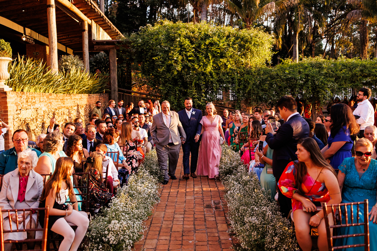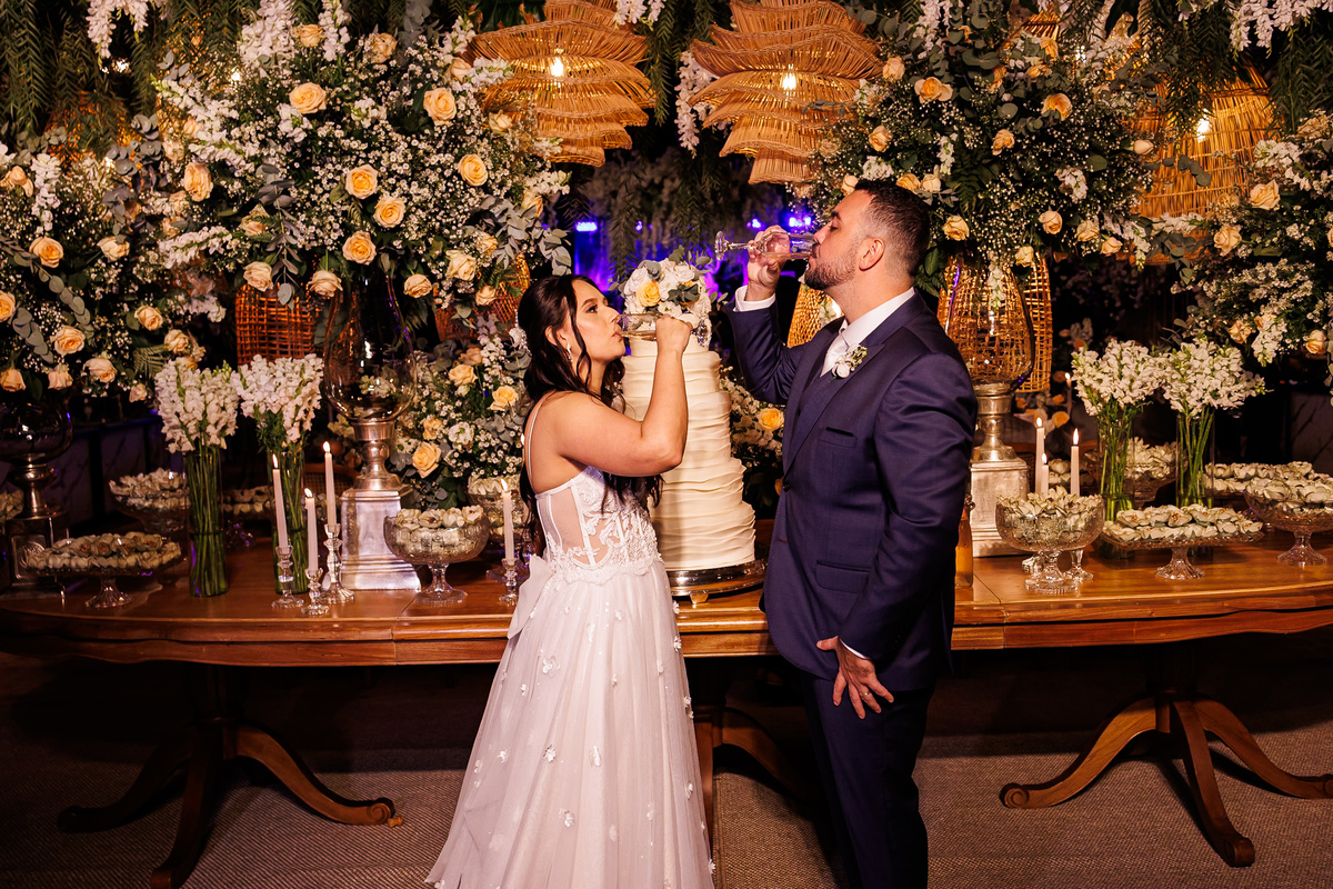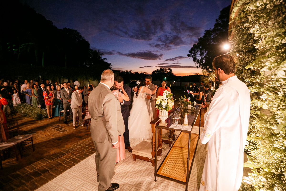 A cerimônia na Fazenda Casarão São Bento foi emocionante do começo ao fim. Não teve quem não se arrepiou. As palavras, os olhares, as mãos que se encontravam o tempo todo. E como se o dia tivesse combinado com eles, o pôr do sol apareceu no momento certo. O céu ganhou cores quentes, a luz ficou dourada e parecia que o tempo desacelerou só para que aquele instante fosse vivido com calma. As fotos desse momento carregam mais do que beleza. Carregam sentimento.
