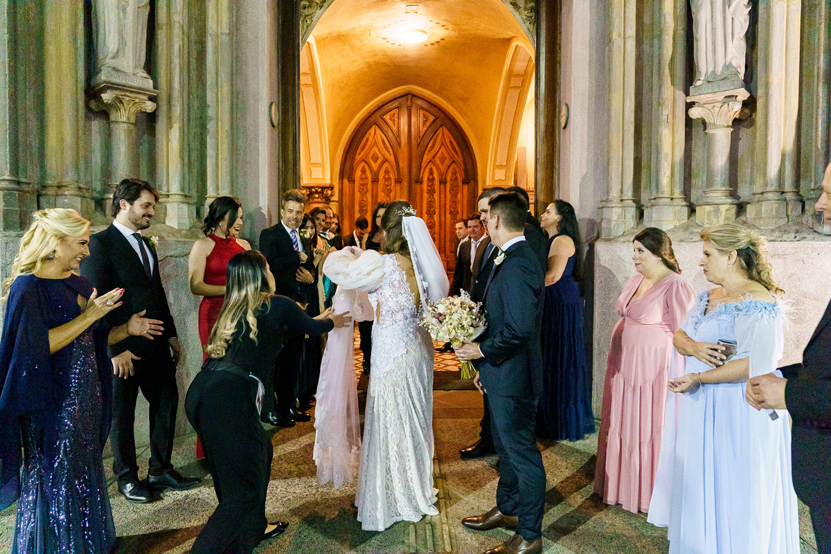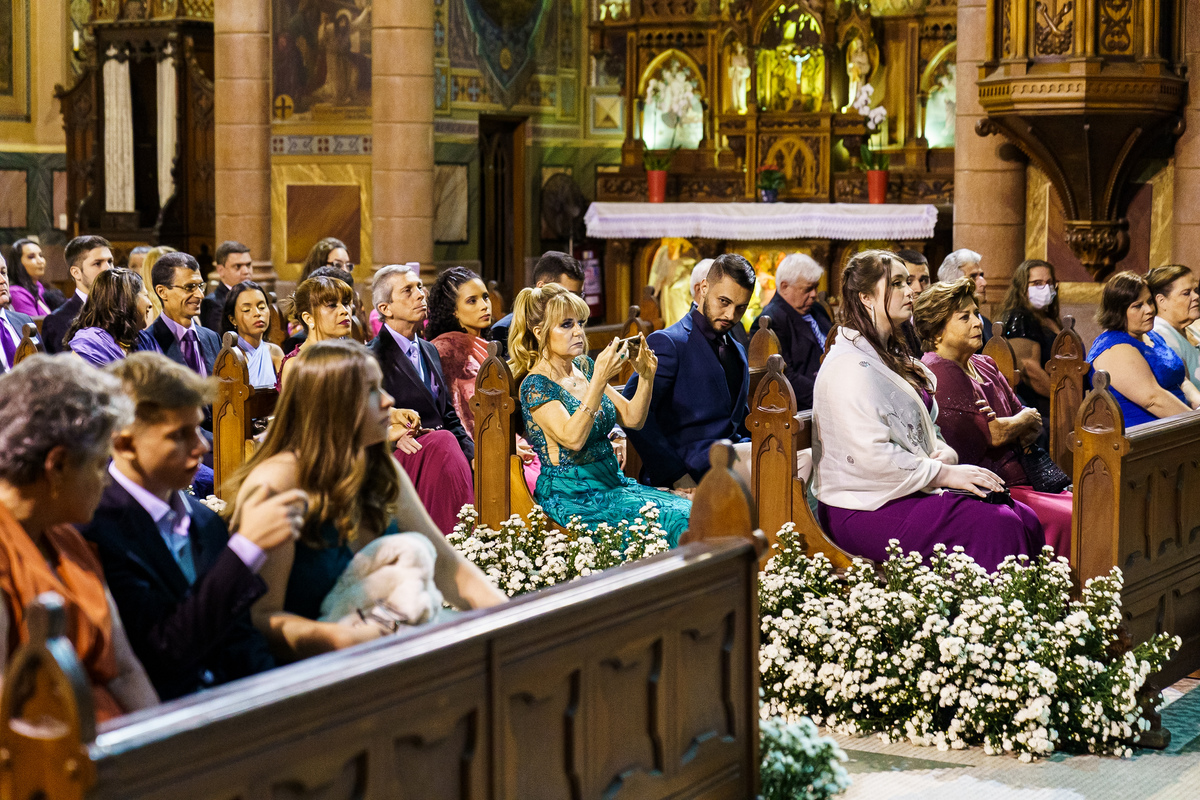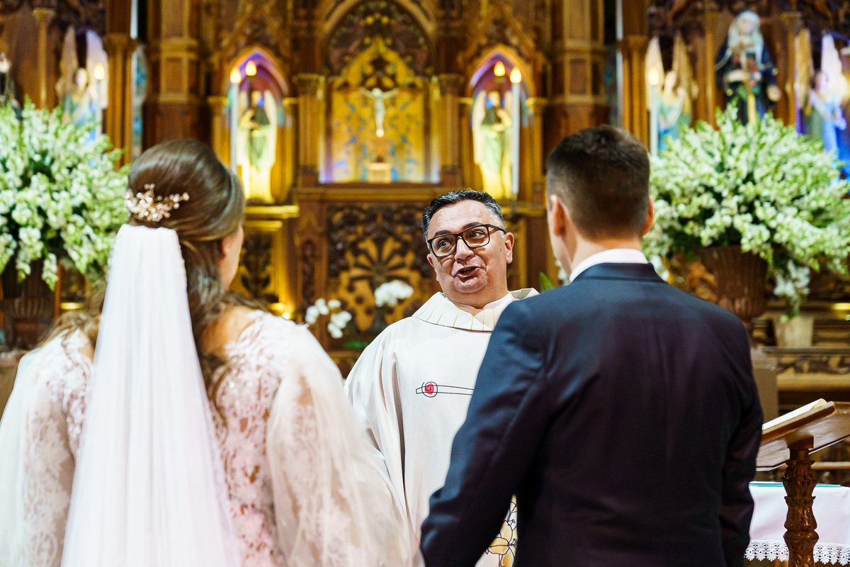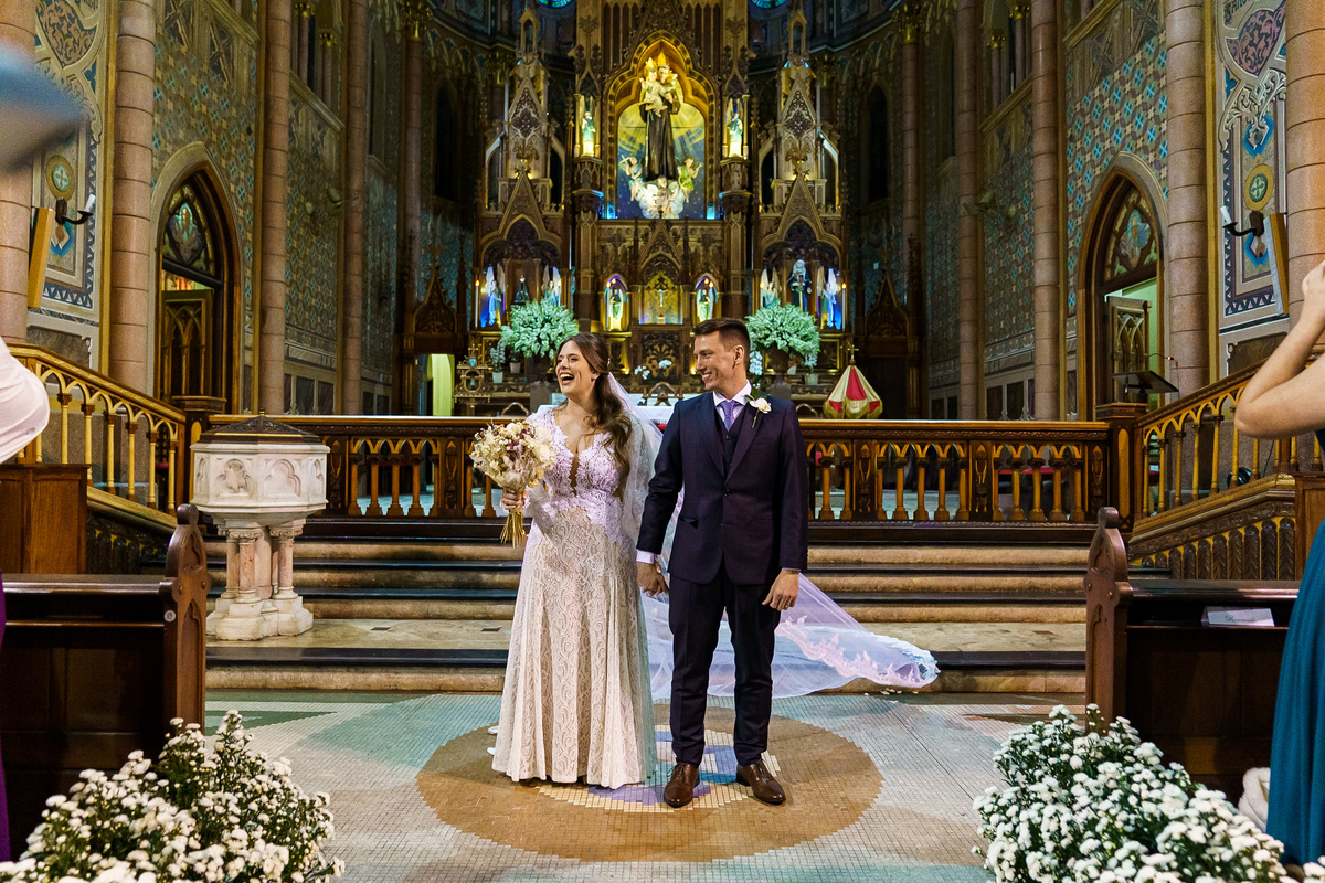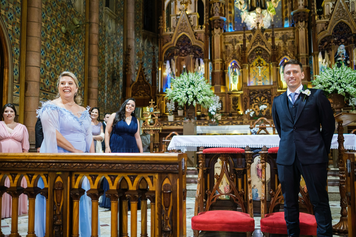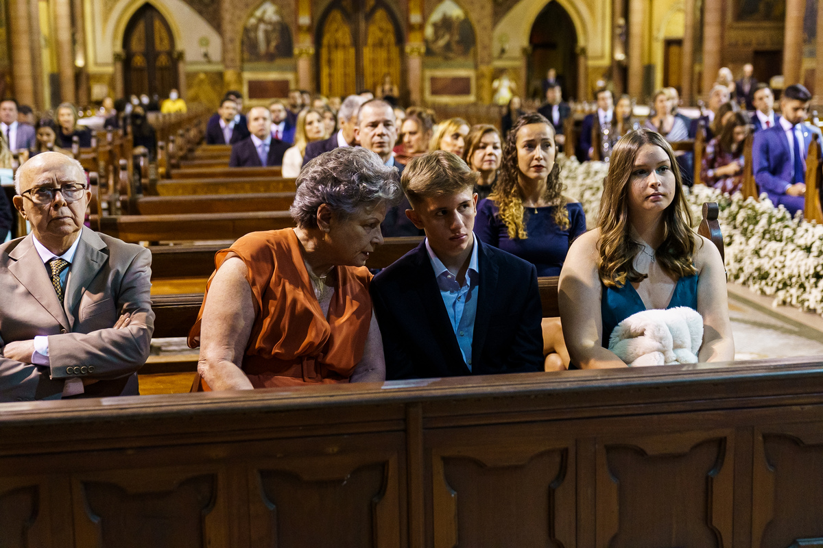 A cerimônia aconteceu em um dos cenários mais lindos que já vi: a Igreja do Embaré. Imponente, cheia de história, luz e emoção. Cada olhar, cada gesto, cada respiração parecia carregar o peso e a beleza daquele momento único. Foi emocionante do começo ao fim daquelas cerimônias que fazem a gente esquecer o tempo passando.