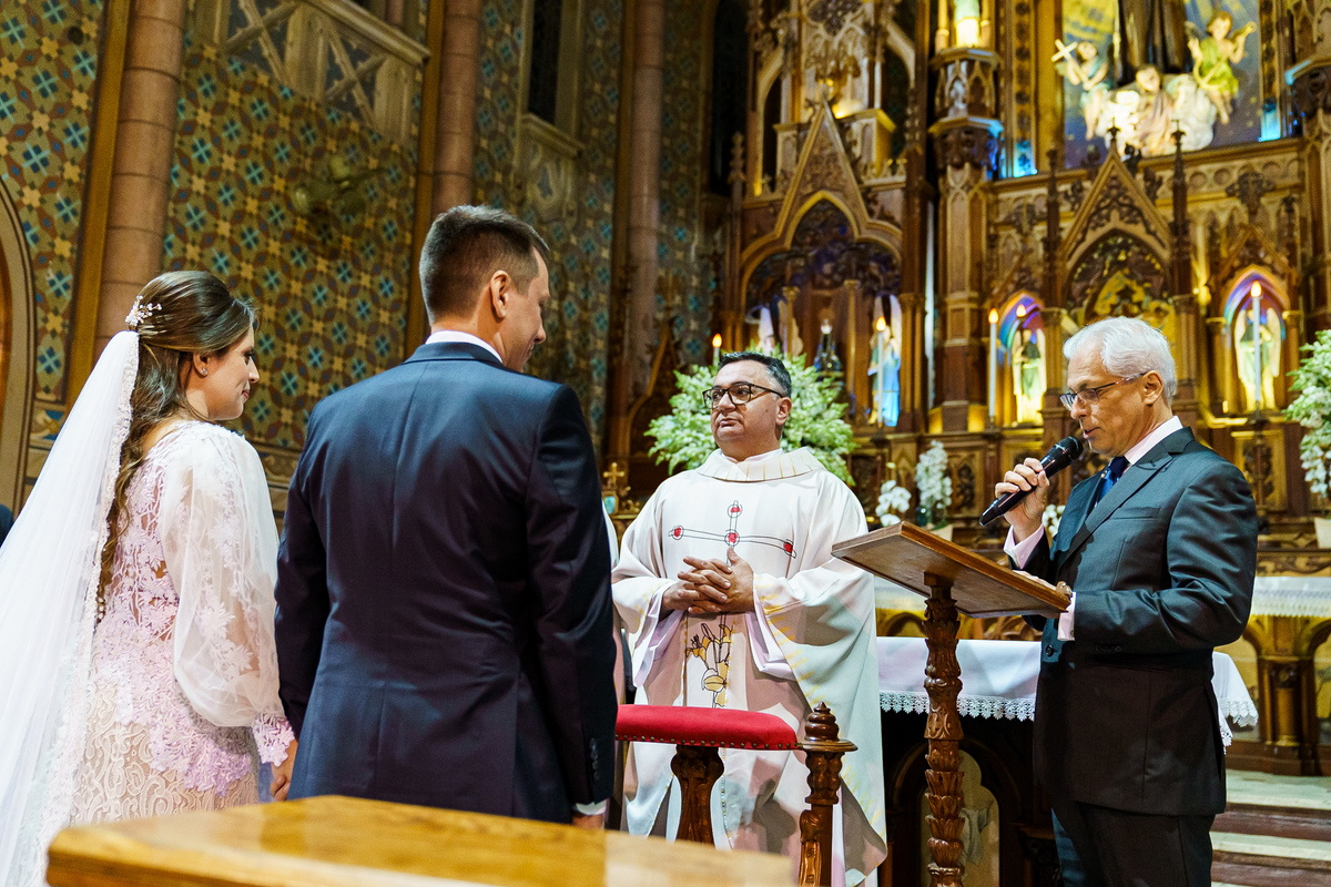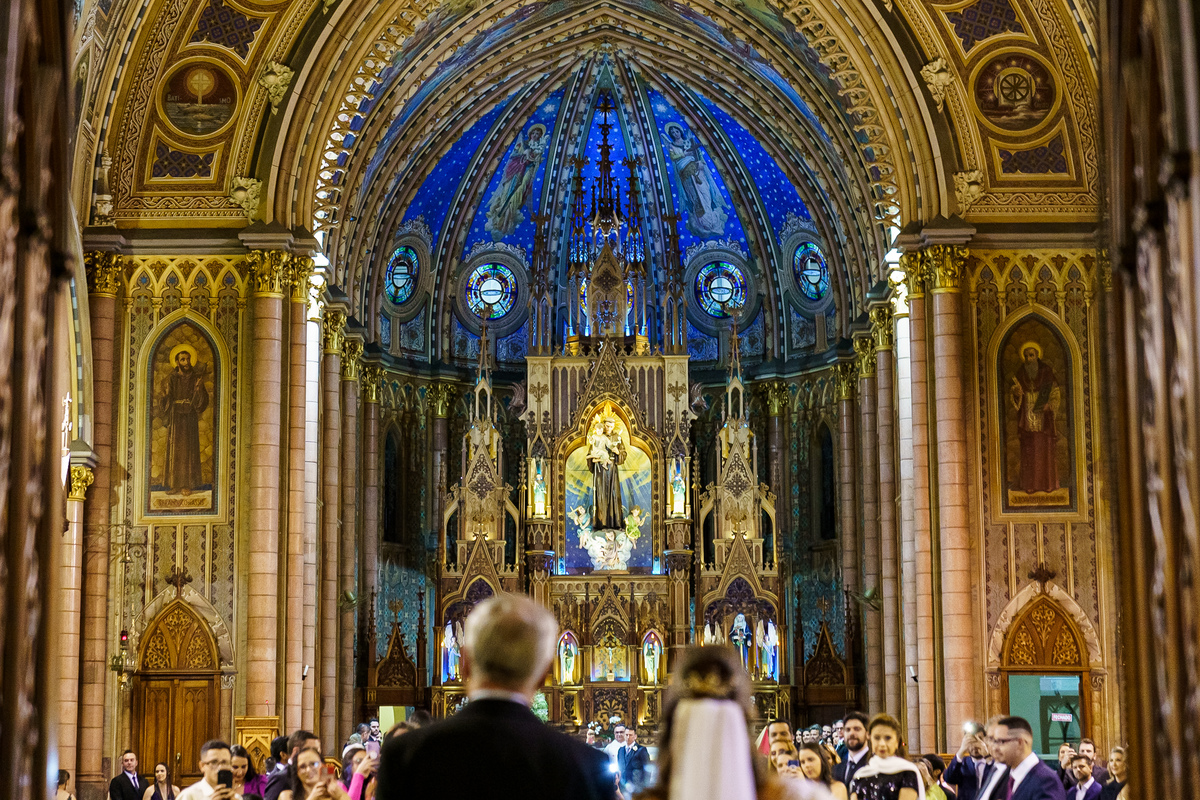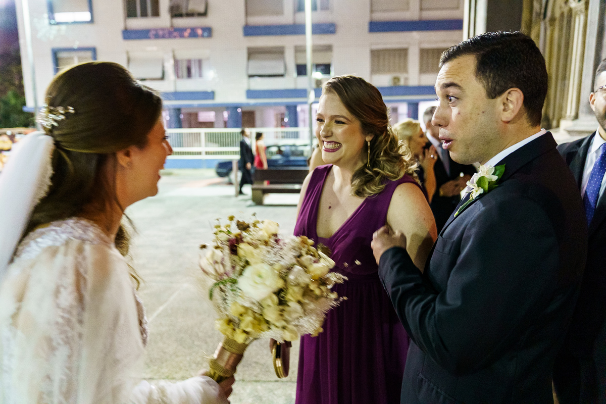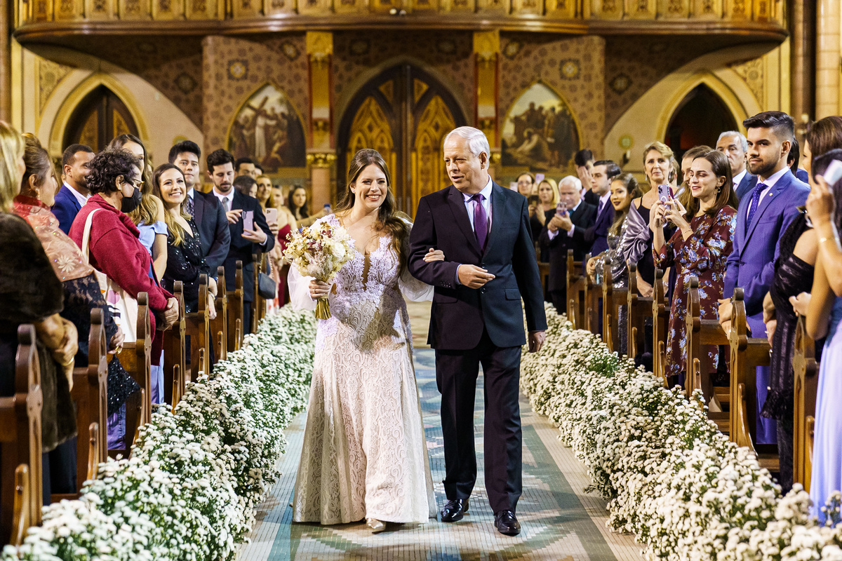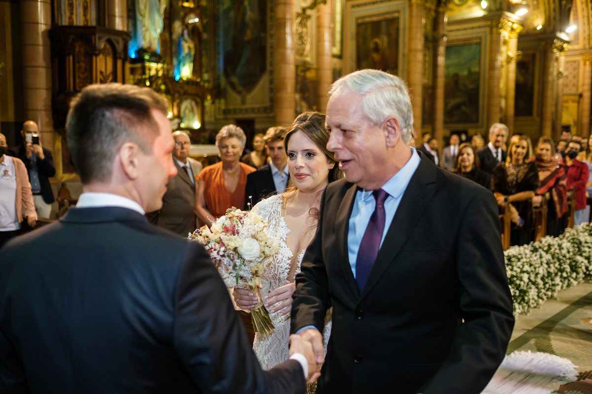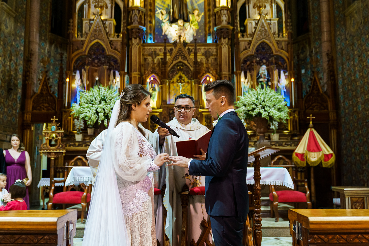 A cerimônia aconteceu em um dos cenários mais lindos que já vi: a Igreja do Embaré. Imponente, cheia de história, luz e emoção. Cada olhar, cada gesto, cada respiração parecia carregar o peso e a beleza daquele momento único. Foi emocionante do começo ao fim daquelas cerimônias que fazem a gente esquecer o tempo passando.