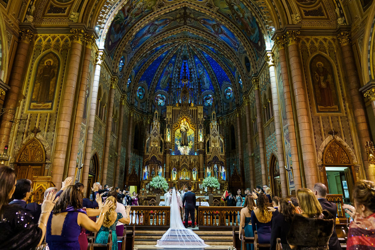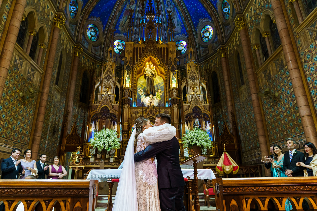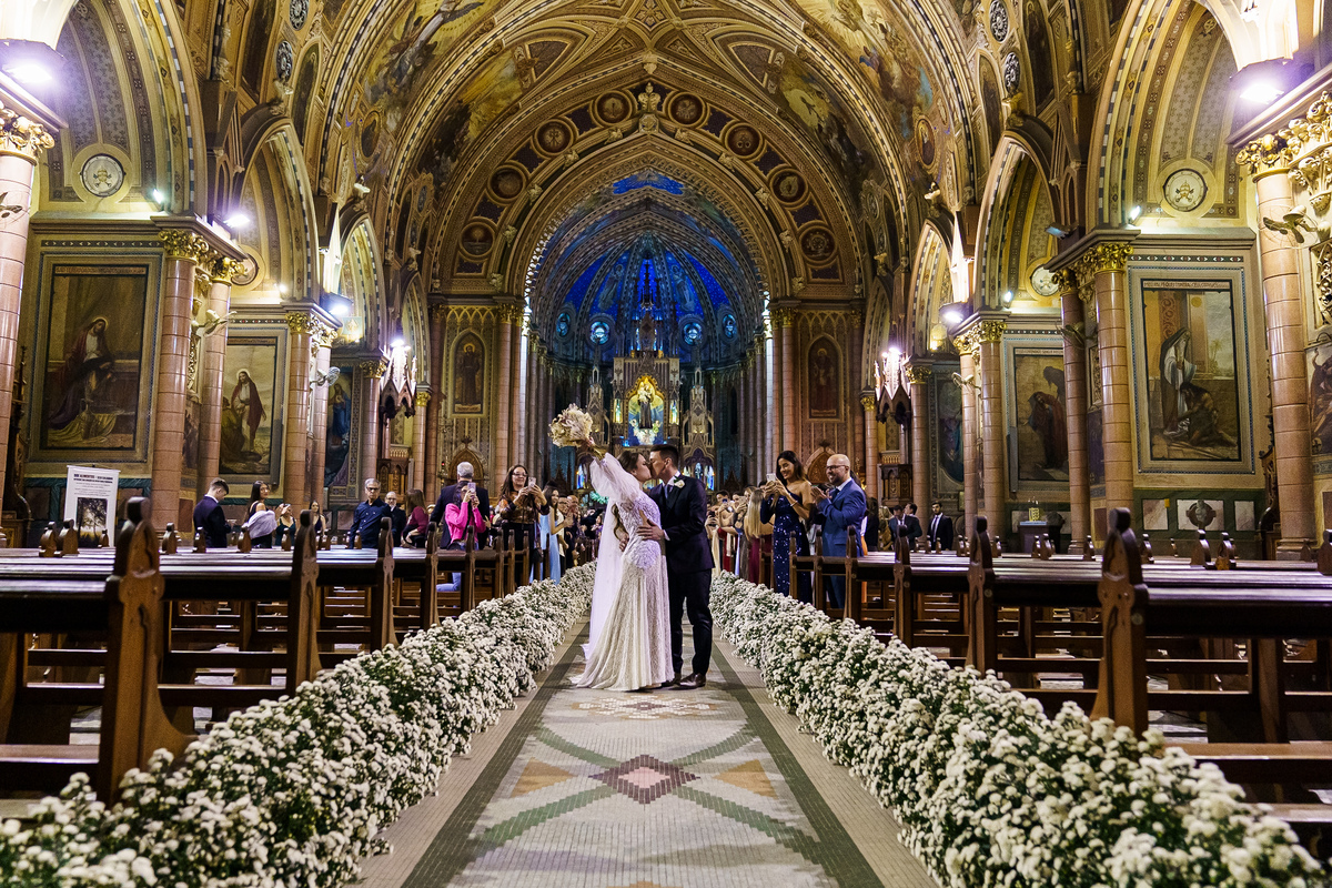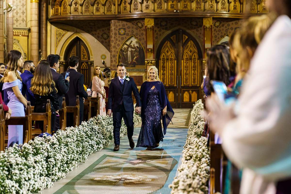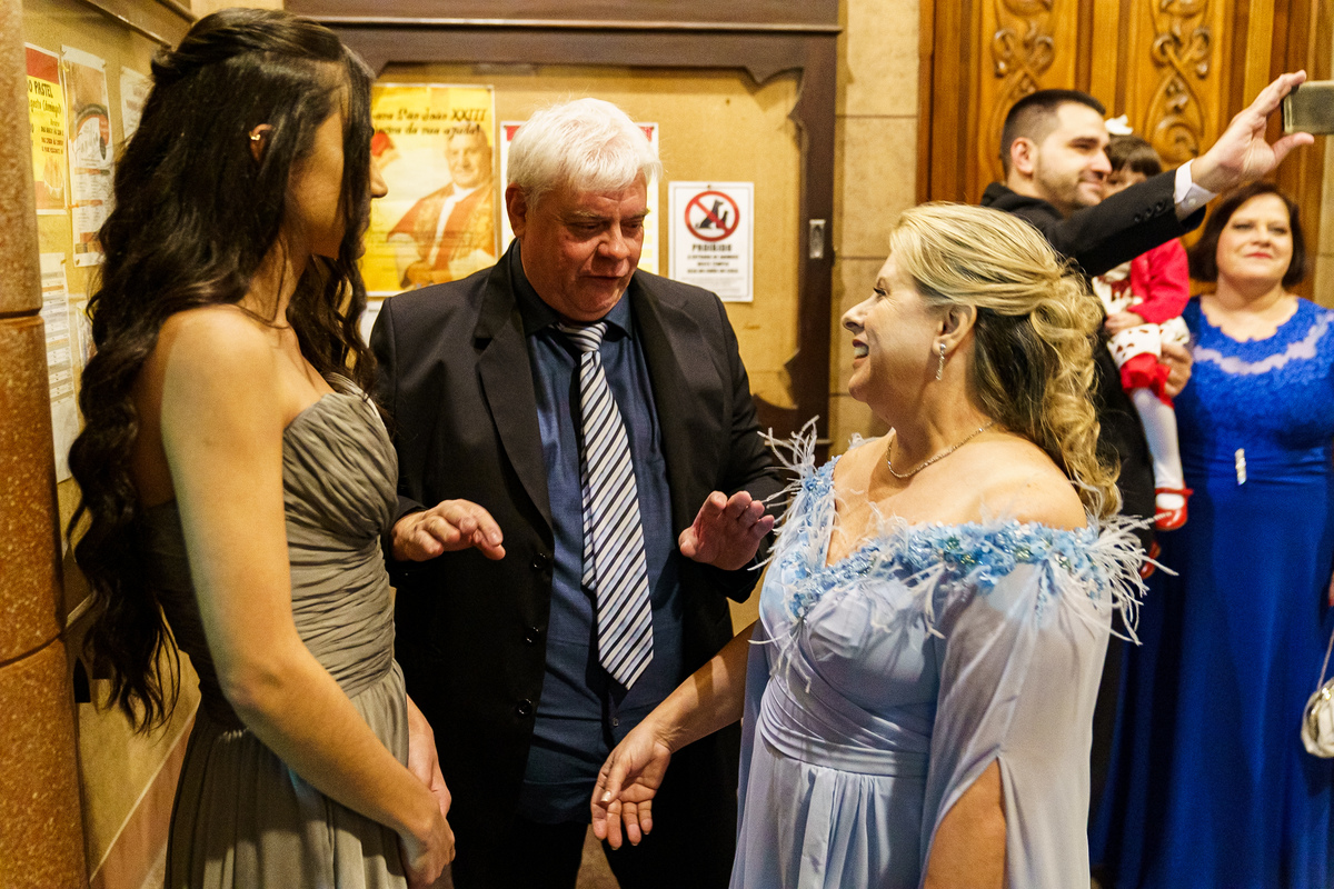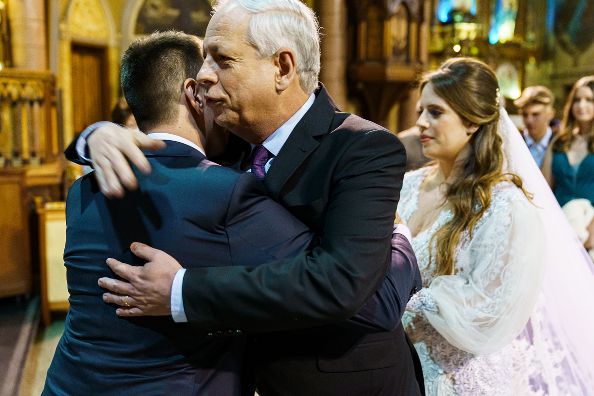 A cerimônia aconteceu em um dos cenários mais lindos que já vi: a Igreja do Embaré. Imponente, cheia de história, luz e emoção. Cada olhar, cada gesto, cada respiração parecia carregar o peso e a beleza daquele momento único. Foi emocionante do começo ao fim daquelas cerimônias que fazem a gente esquecer o tempo passando.