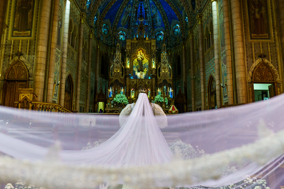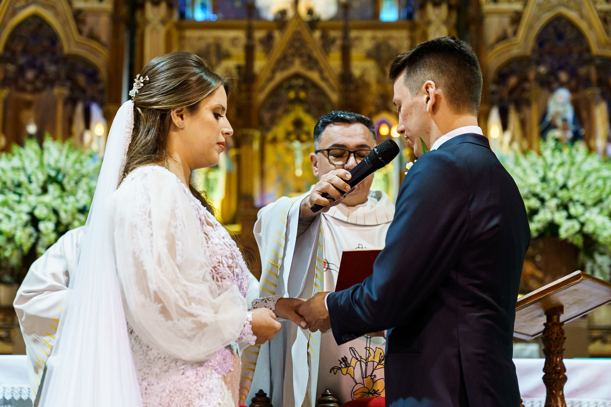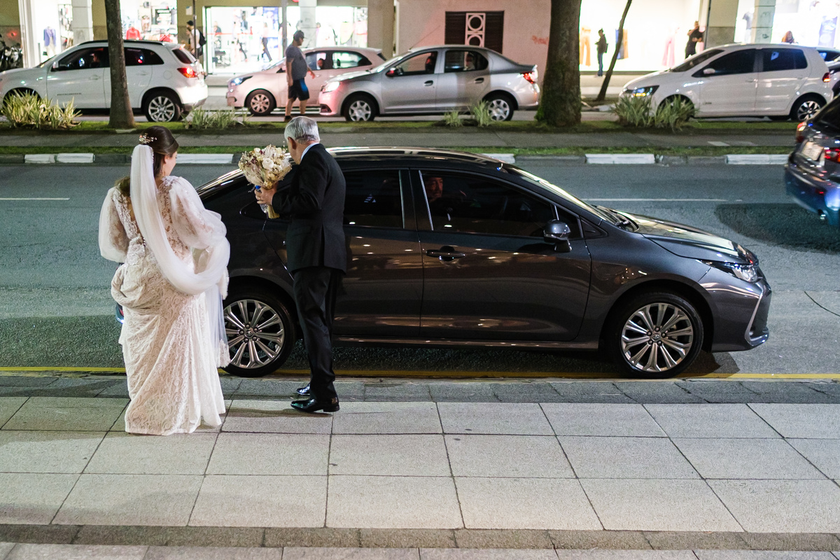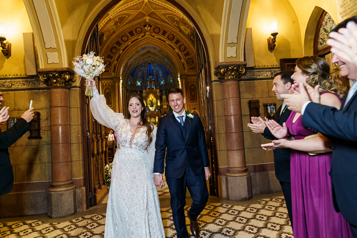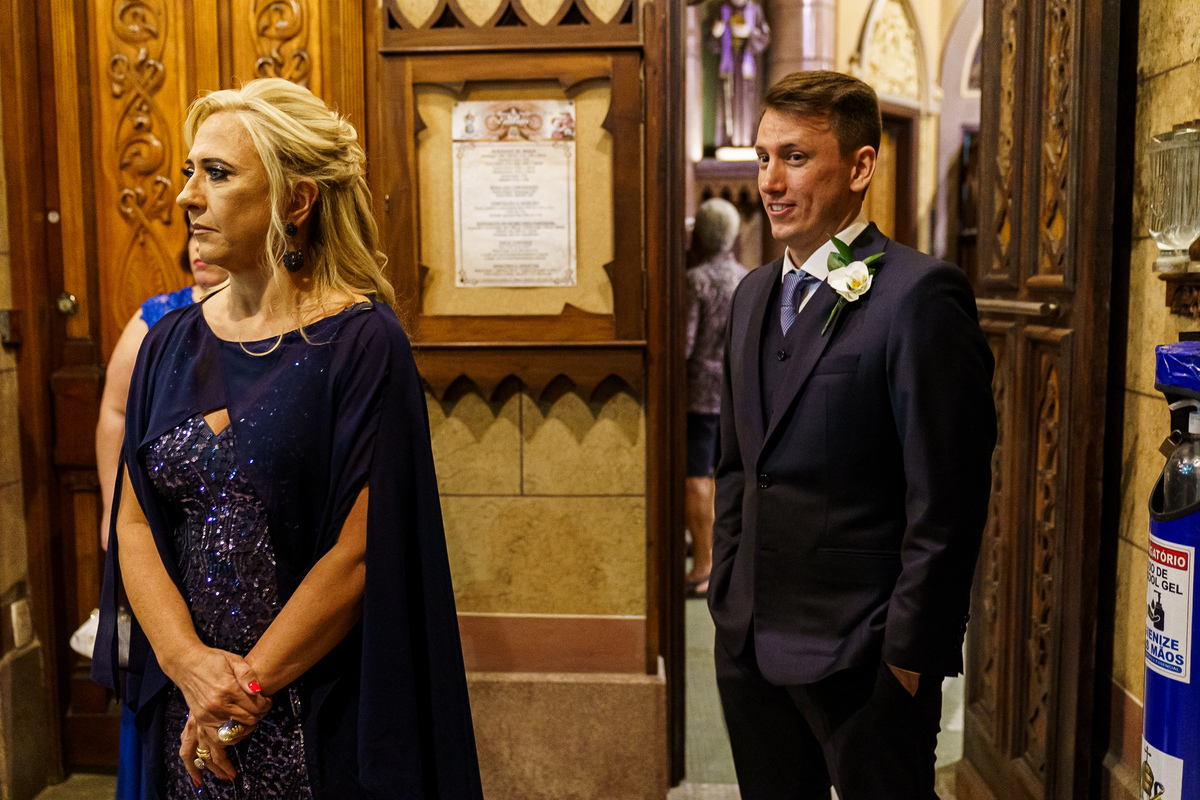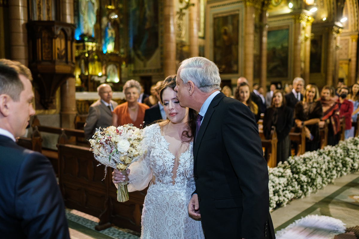 A cerimônia aconteceu em um dos cenários mais lindos que já vi: a Igreja do Embaré. Imponente, cheia de história, luz e emoção. Cada olhar, cada gesto, cada respiração parecia carregar o peso e a beleza daquele momento único. Foi emocionante do começo ao fim daquelas cerimônias que fazem a gente esquecer o tempo passando.