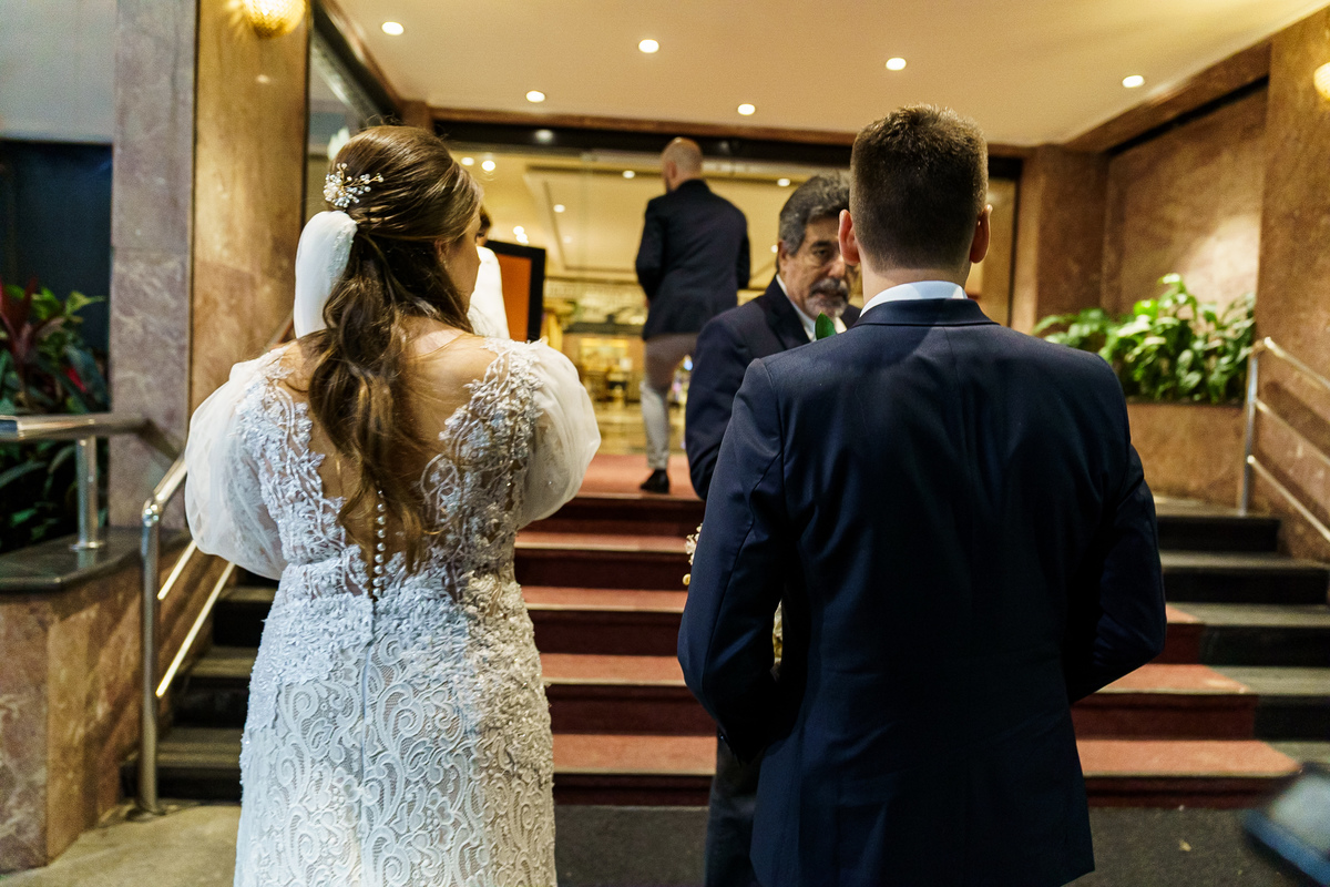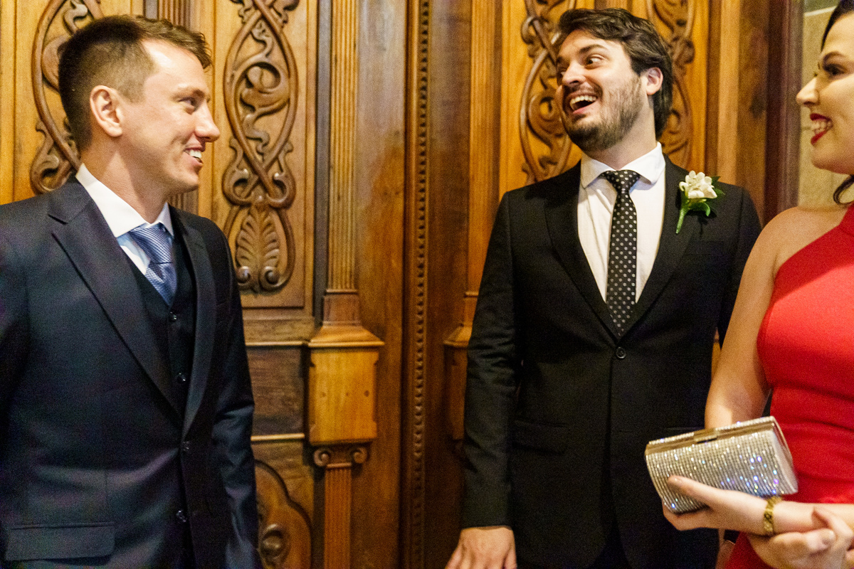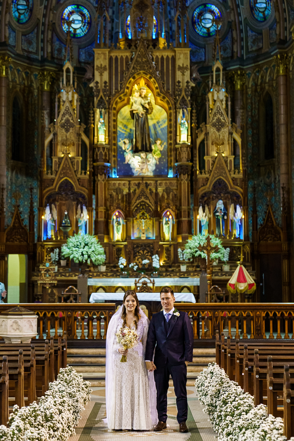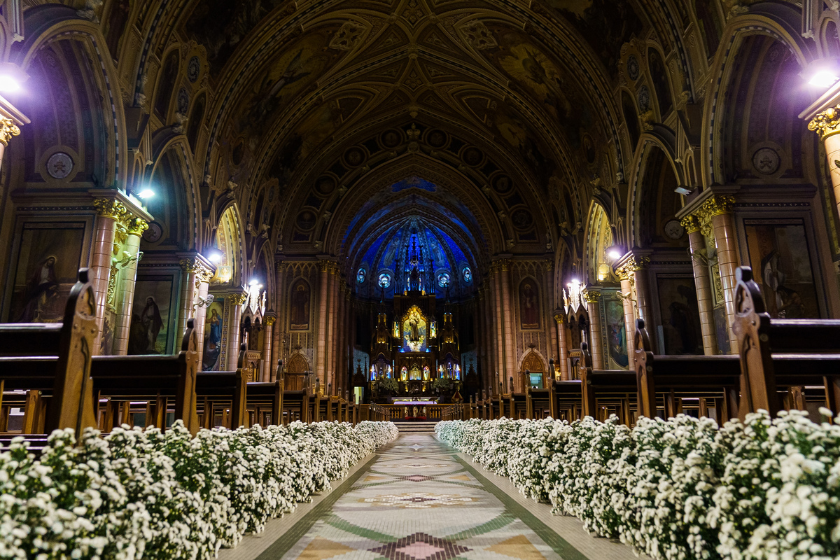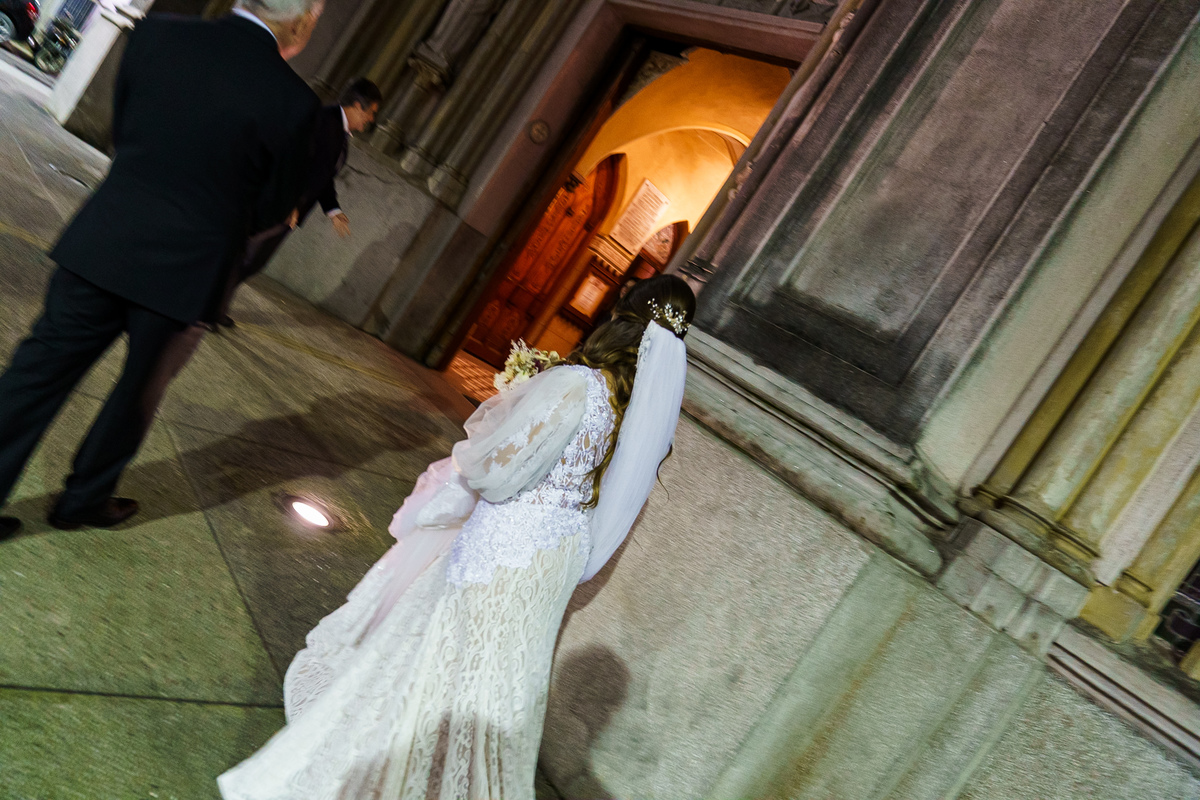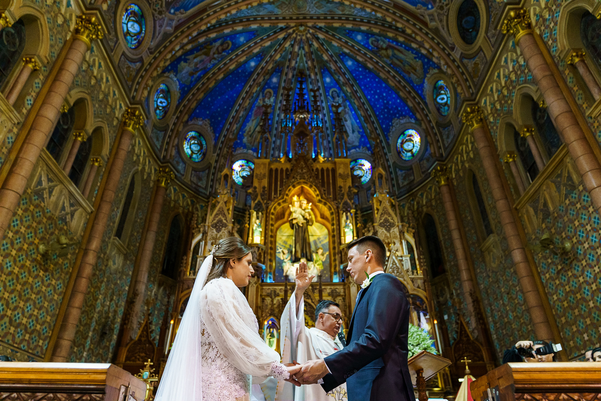 A cerimônia aconteceu em um dos cenários mais lindos que já vi: a Igreja do Embaré. Imponente, cheia de história, luz e emoção. Cada olhar, cada gesto, cada respiração parecia carregar o peso e a beleza daquele momento único. Foi emocionante do começo ao fim daquelas cerimônias que fazem a gente esquecer o tempo passando.