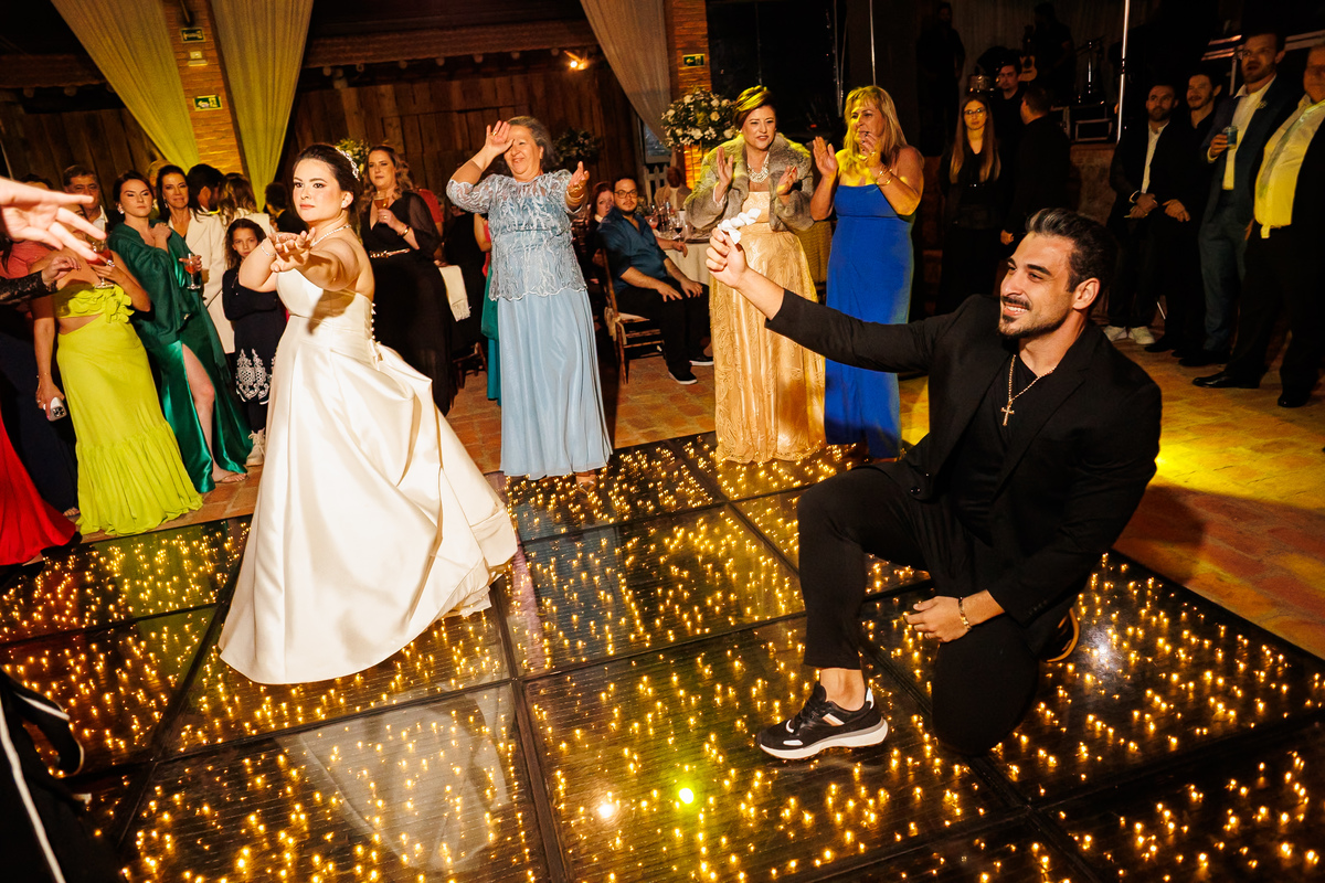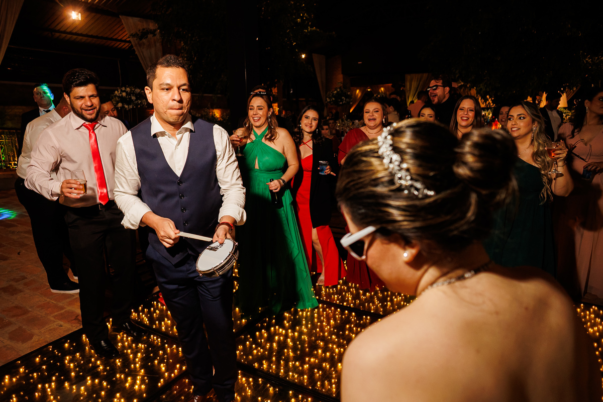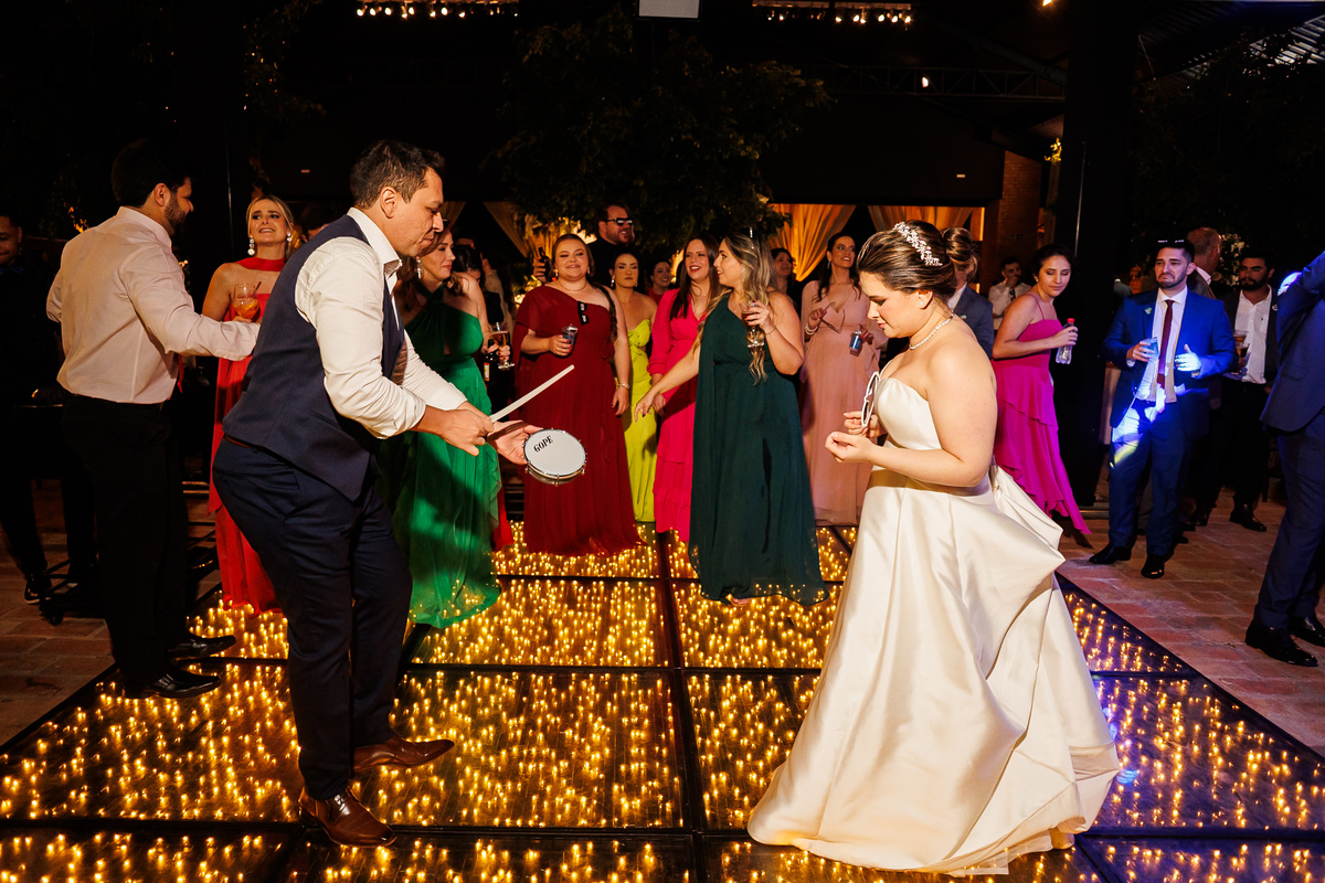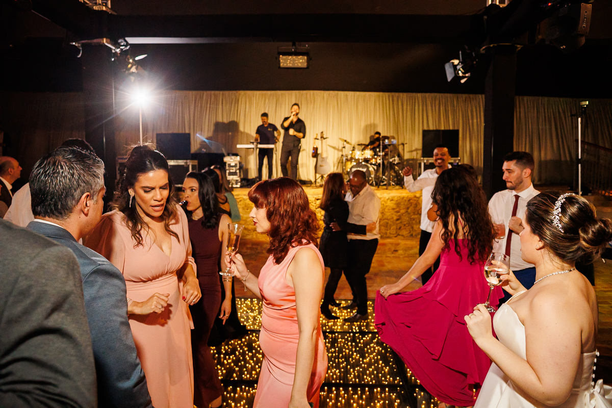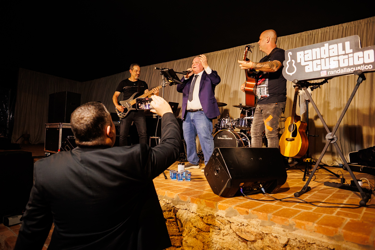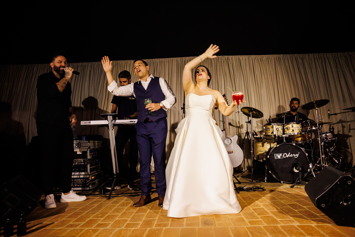 Duas bandas, o pai da noiva cantando, Victoria e Claudio no palco.