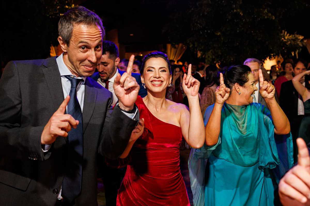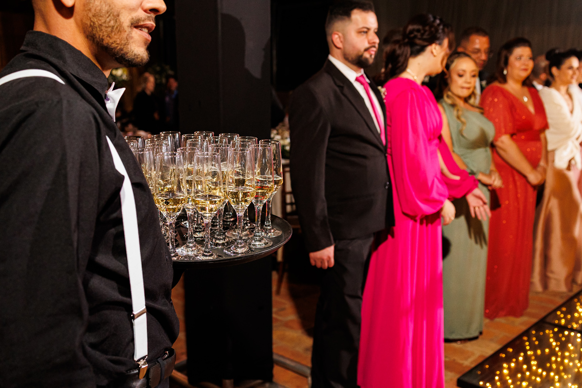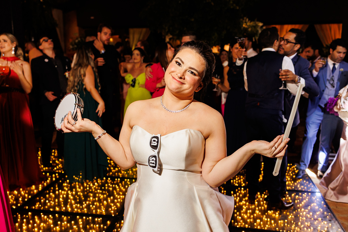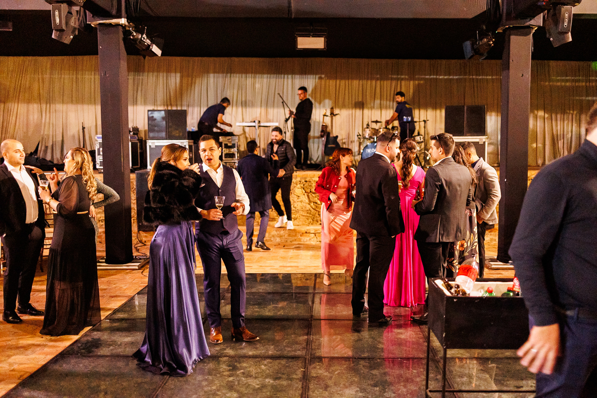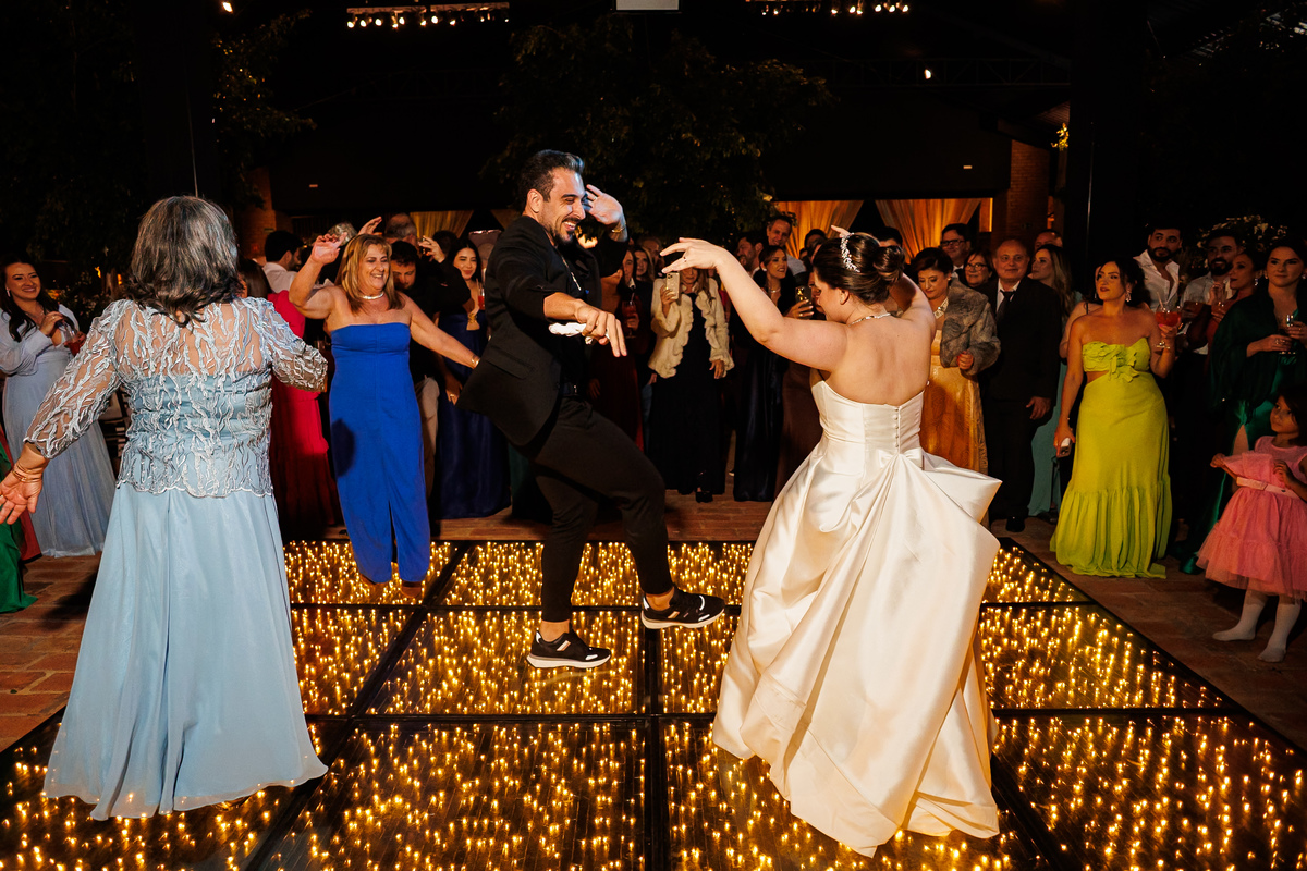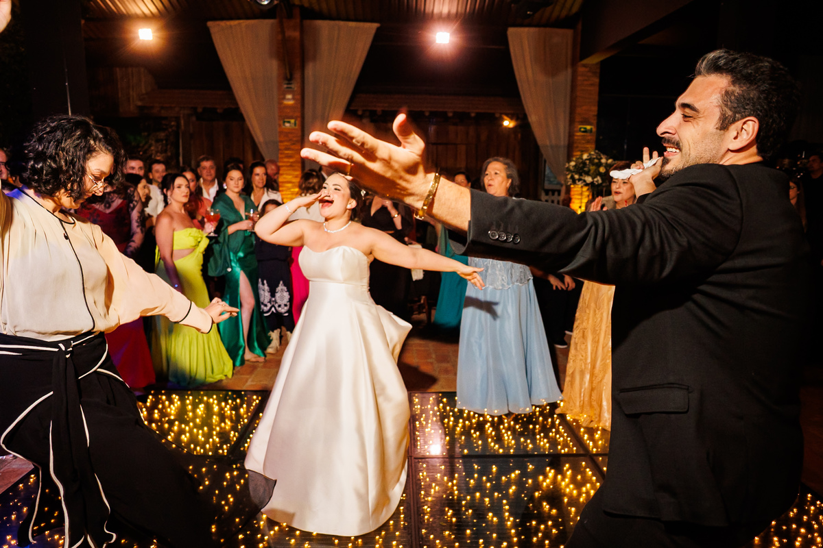 Duas bandas, o pai da noiva cantando, Victoria e Claudio no palco.