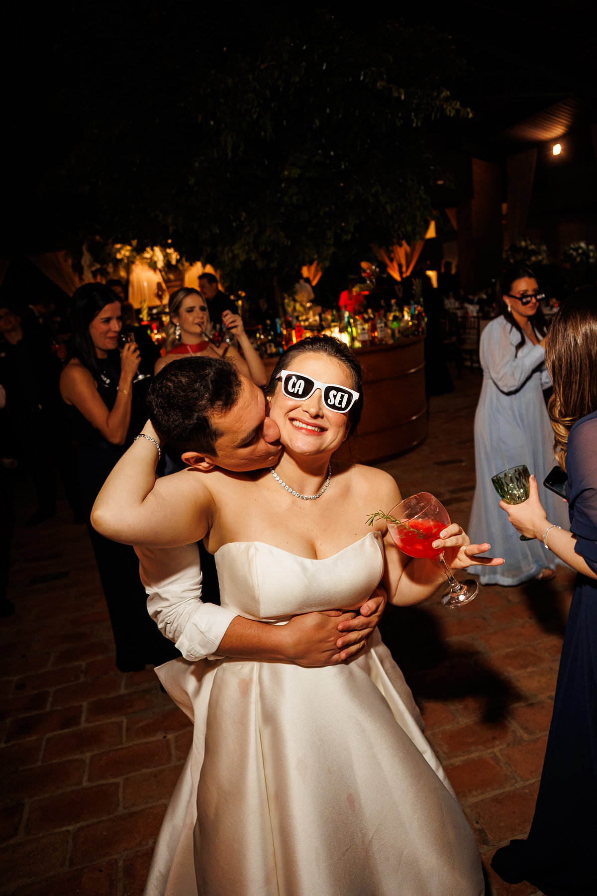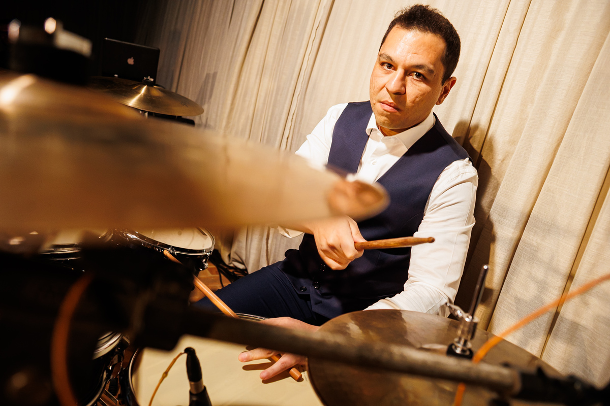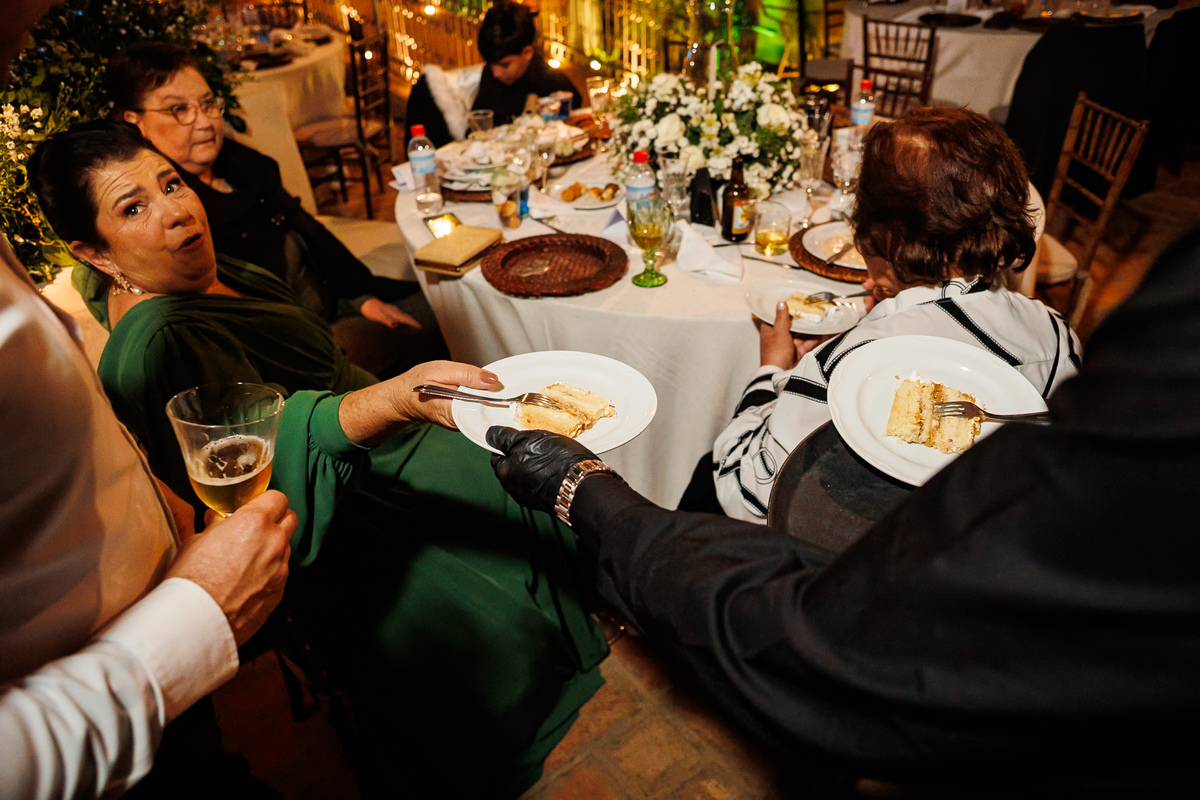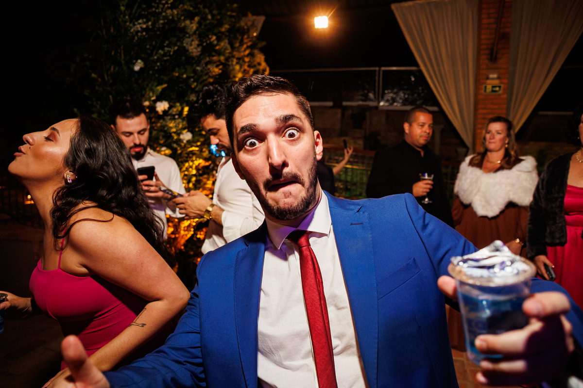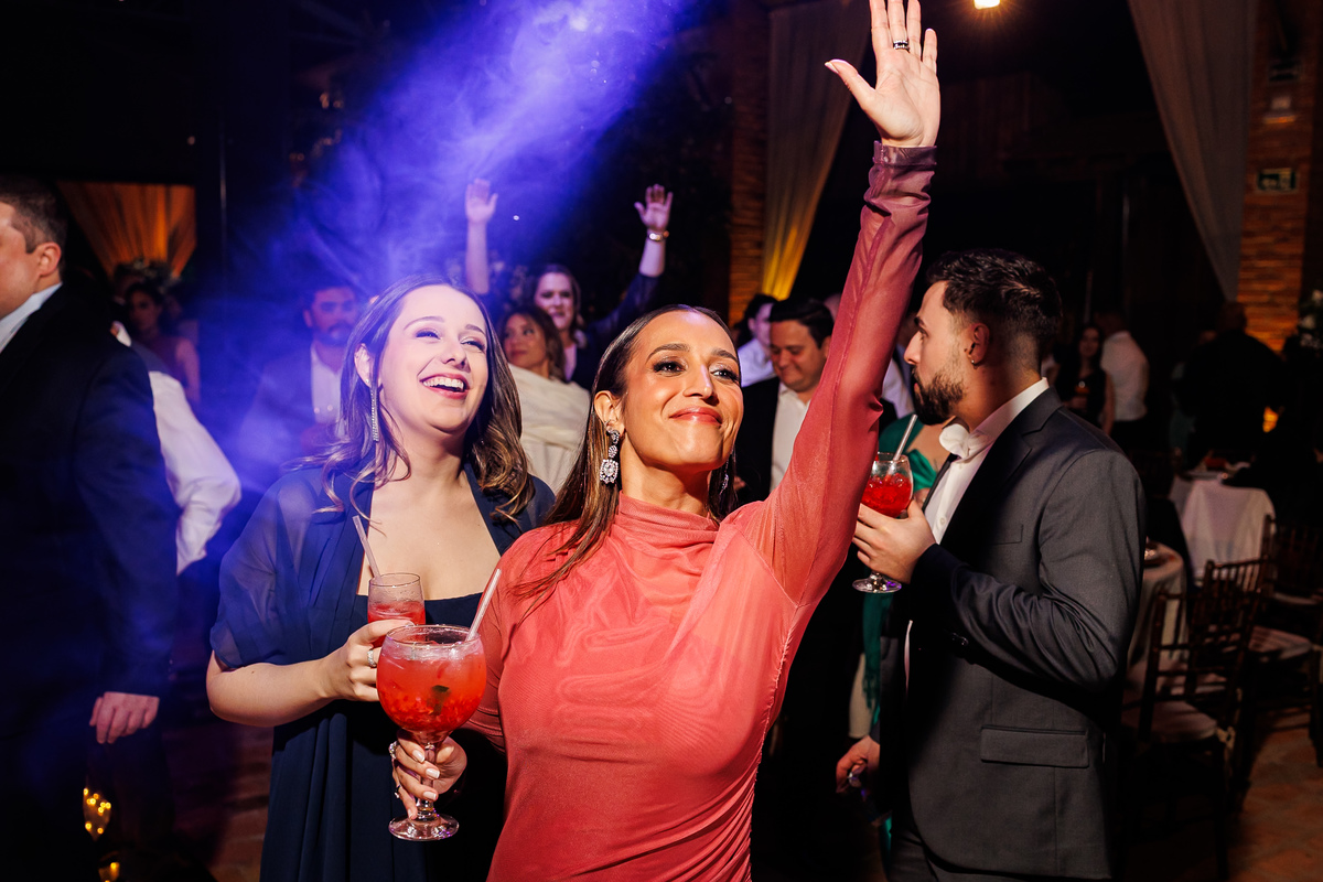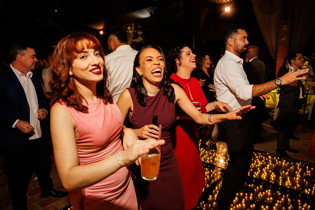 Duas bandas, o pai da noiva cantando, Victoria e Claudio no palco.