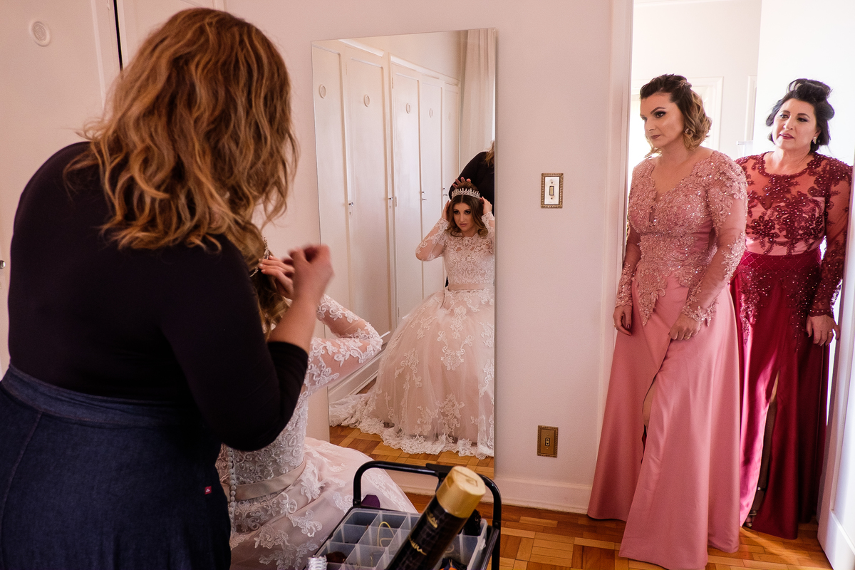 Já a Cláudia, estava com a sua mãe, irmã, sobrinhas, no salão, que é uma coisa que sempre falamos, levem junto com vocês noivas, pessoas que vão te ajudar a acalmar, pois com isso, além de deixar a noiva mais tranquila, pois não é um dia qualquer né?! Fica muito bonito essa ajuda da família, amigas que estejam lá, a preocupação delas, com a noiva sempre transborda, sem falar na reação ao ver a noiva pronta ou quase!!!