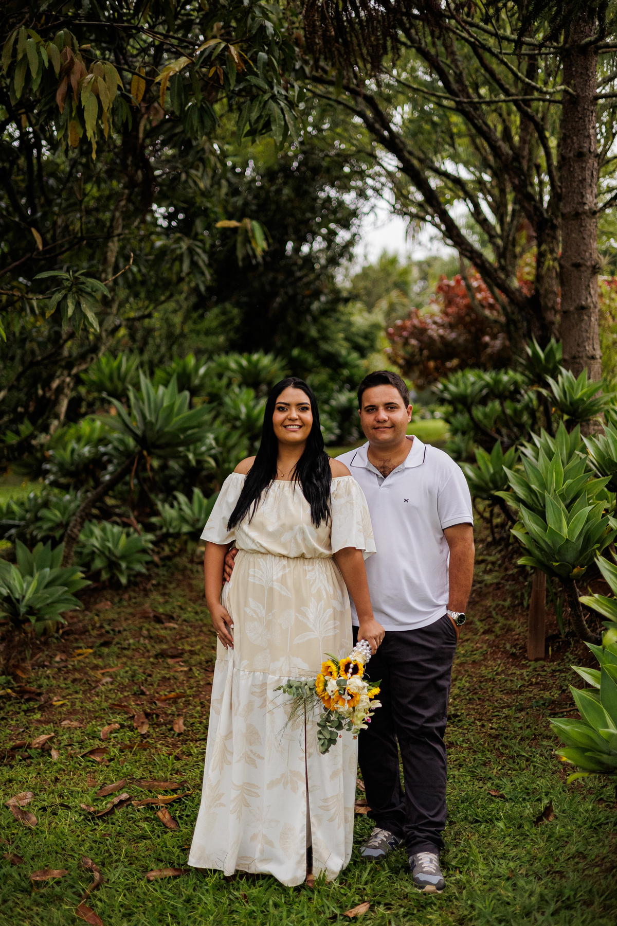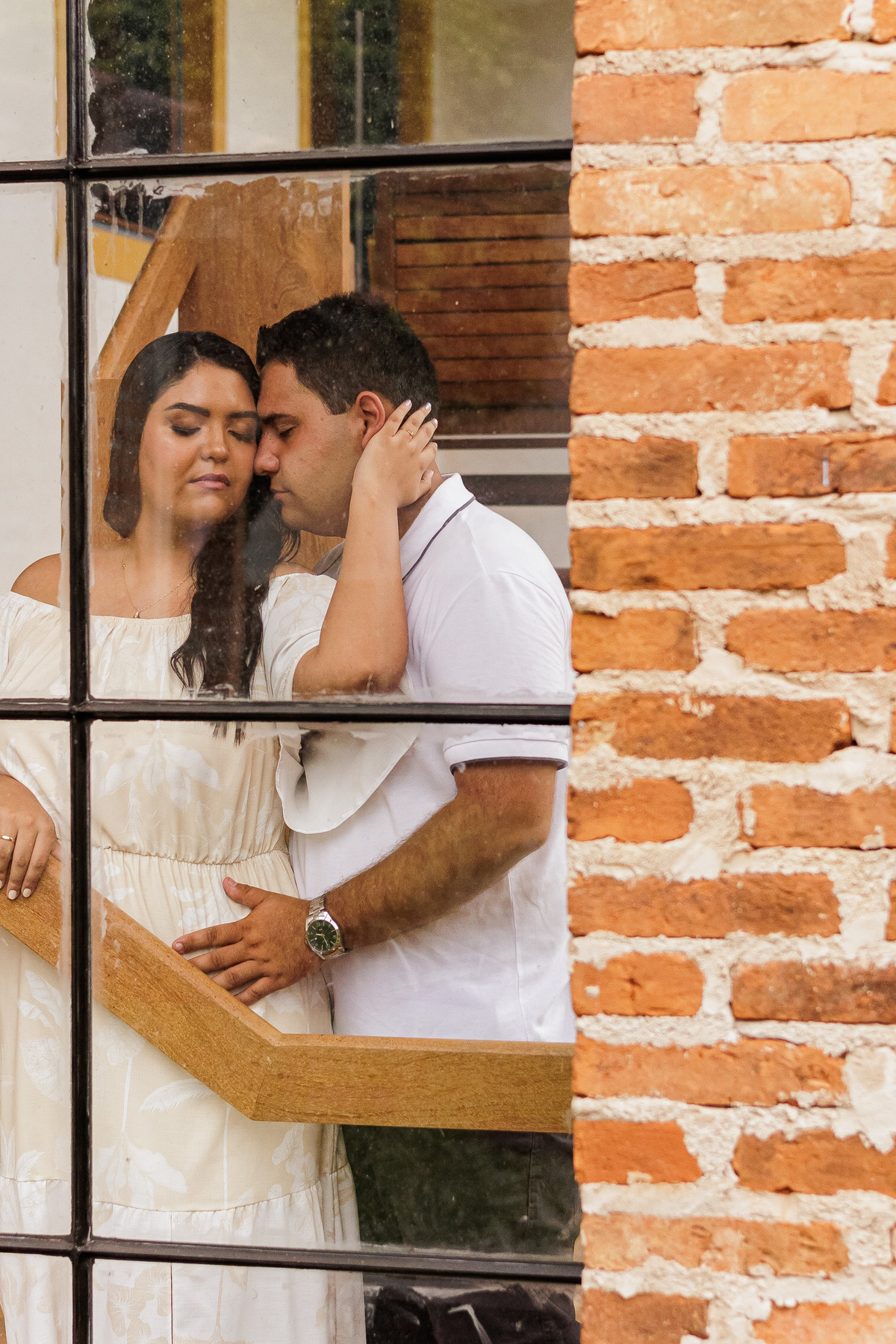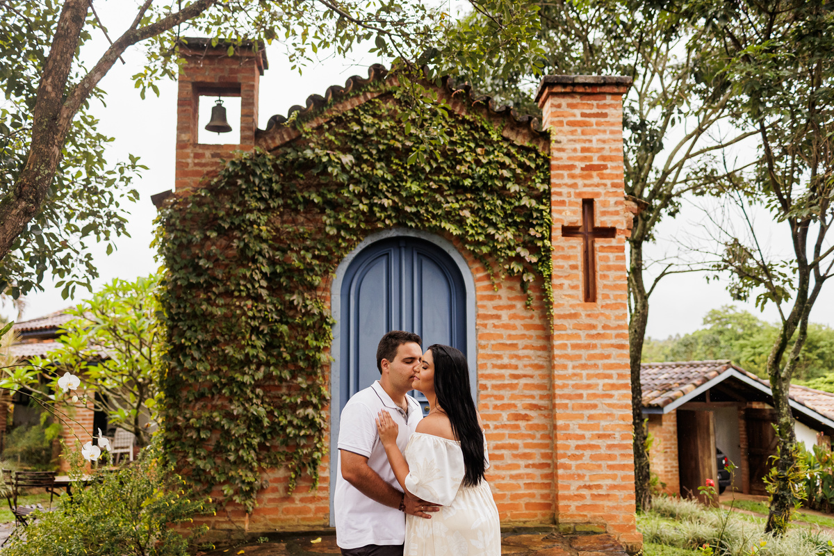 Apesar da chuva persistente, nada poderia deter o amor e a alegria de Victoria e Daniel. Juntos, exploraram os caminhos sinuosos de um jardim, envoltos na suave luz da tarde, com gotas de chuva adornando delicadamente suas peles. Cada momento capturado foi uma celebração da sua união, abençoada pela presença silenciosa e reconfortante de Nossa Senhora.
