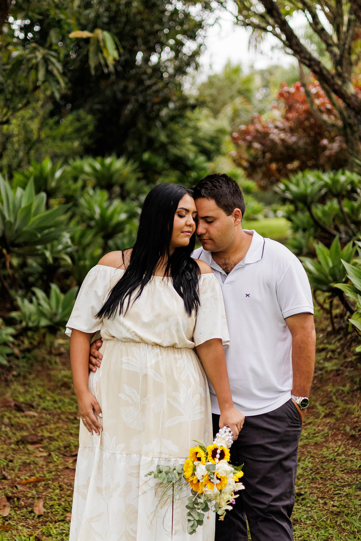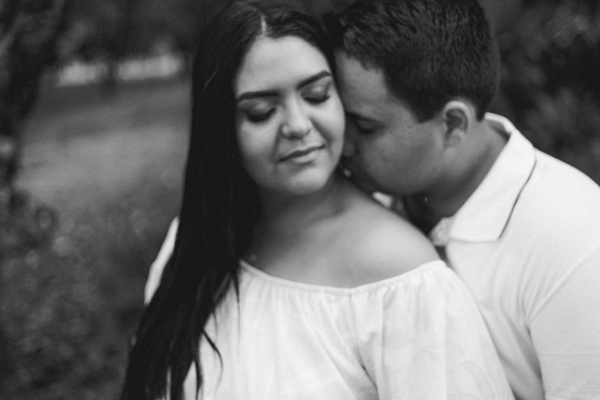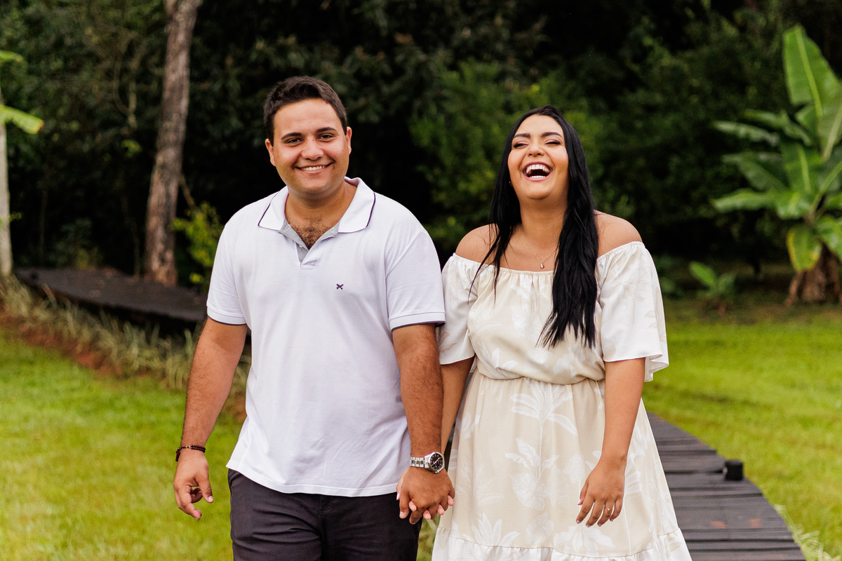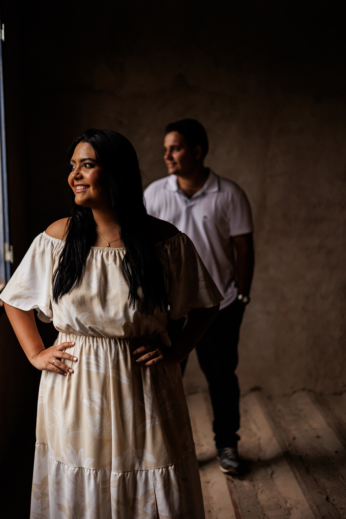 Apesar da chuva persistente, nada poderia deter o amor e a alegria de Victoria e Daniel. Juntos, exploraram os caminhos sinuosos de um jardim, envoltos na suave luz da tarde, com gotas de chuva adornando delicadamente suas peles. Cada momento capturado foi uma celebração da sua união, abençoada pela presença silenciosa e reconfortante de Nossa Senhora.